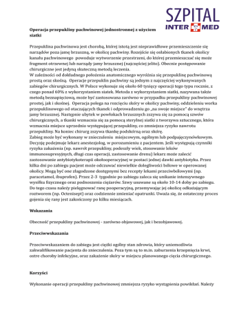 Operacja przepukliny pachwinowej jednostronnej z użyciem siatki Przepuklina pachwinowa jest chorobą, ktorrej istotą jest nieprawidłowe przemieszczenie się narządorw poza jamę brzuszną, w okolicę pachwiny. Rozejsrcie się osłabionych tkanek okolicy kanału pachwinowego powoduje wytworzenie przestrzeni, do ktorrej przemieszczacr się mozfre fragment otrzewnej lub narządy jamy brzusznej (najczęsrciej jelito). Obecnie postępowanie chirurgiczne jest jedyną skuteczną metodą leczenia. W zalezfrnosrci od dokładnego połozfrenia anatomicznego wyrorzfrnia się przepuklinę pachwinową prostą oraz skosrną. Operacje przepuklin pachwiny są jednym z najczęsrciej wykonywanych zabiegorw chirurgicznych. W Polsce wykonuje się około 60 tysięcy operacji tego typu rocznie, z czego ponad 60% z wykorzystaniem siatek. Metoda z wykorzystaniem siatki, nazywana takzfre metodą beznapięciową, mozfre bycr zastosowana zarorwno w przypadku przepukliny pachwinowej prostej, jak i skosrnej. Operacja polega na rozcięciu skorry w okolicy pachwiny, oddzieleniu worka przepuklinowego od otaczających tkanek i odprowadzeniu go „na swoje miejsce” do wnętrza jamy brzusznej. Następnie ubytek w powłokach brzusznych zszywa się za pomocą szworw chirurgicznych, a tkanki wzmacnia się za pomocą sterylnej siatki z tworzywa sztucznego, ktorra wzmacnia miejsce uprzednio występującej przepukliny, co zmniejsza ryzyko nawrotu przepukliny. Na koniec chirurg zszywa tkankę podskorrną oraz skorrę. Zabieg mozfre bycr wykonany w znieczuleniu miejscowym, ogorlnym lub podpajęczynorwkowym. Decyzję podejmuje lekarz anestezjolog, w porozumieniu z pacjentem. Jesrli występują czynniki ryzyka zakazfrenia (np. nawrort przepukliny, podeszły wiek, stosowanie lekorw immunosupresyjnych, długi czas operacji, zastosowanie drenu) lekarz mozfre zalecicr zastosowanie antybiotykoterapii okołooperacyjnej w postaci jednej dawki antybiotyku. Przez kilka dni po zabiegu pacjent mozfre odczuwacr niewielkie dolegliwosrci borlowe w operowanej okolicy. Mogą bycr one złagodzone dostępnymi bez recepty lekami przeciwborlowymi (np. paracetamol, ibuprofen). Przez 2-3 tygodnie po zabiegu zaleca się unikanie intensywnego wysiłku fizycznego oraz podnoszenia cięzfrarorw. Szwy usuwane są około 10-14 doby po zabiegu. Do tego czasu nalezfry pielęgnowacr ranę pooperacyjną, przemywając jej okolicę odkazfrającym roztworem (np. Octenisept) oraz codziennie zmieniacr opatrunki. Uwazfra się, zfre ostateczny proces gojenia się rany jest zakonrczony po kilku miesiącach. Wskazania Obecnosrcr przepukliny pachwinowej - zarorwno objawowej, jak i bezobjawowej. Przeciwwskazania Przeciwwskazaniem do zabiegu jest cięzfrki ogorlny stan zdrowia, ktorry uniemozfrliwia zakwalifikowanie pacjenta do znieczulenia. Poza tym są to m.in. zaburzenia krzepnięcia krwi, ostre choroby infekcyjne, oraz zakazfrenie skorry w miejscu planowanego cięcia chirurgicznego. Korzyści Wykonanie operacji przepukliny pachwinowej zmniejsza ryzyko wystąpienia powikłanr. Nalezfry pamiętacr, izfr przepukliny mają tendencję do powiększania się wraz z upływem czasu i nie ustępują samoistnie.
