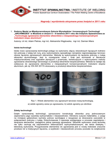 Nagrody i wyróżnienia otrzymane przez Instytut w 2011 roku 1. Srebrny Medal na Międzynarodowym Salonie Wynalazków i Innowacyjnych Technologii „ARCHIMEDES” w Moskwie w dniach 5 – 8 kwietnia 2011 roku dla Instytutu Spawalnictwa za „Technologię zgrzewania elementów siłowników z niespawalnego konwencjonalnymi metodami stopu aluminium” Autorzy: dr inż. Adam Pietras, mgr inż. Aleksandra Węglowska, mgr inż. Damian Miara Istota technologii Istota nowo opracowanej technologii polega na wykonaniu złączy obwodowych łączących kołnierz lub pokrywę z tuleją lub rurą, przy wykorzystaniu specjalnego narzędzia nagrzewającego tarciowo obszar łączenia zgrzewanych elementów. Metodę tę wykorzystano do łączenia pokrywy z tuleją siłownika aluminiowego. Jest to rozwiązanie nowe i brak jest wzmianek w literaturze międzynarodowej oraz sygnałów płynących z przemysłu, świadczących o wykorzystaniu metody zgrzewania obwodowego tarciowego w produkcji siłowników bezpieczeństwa. Metoda ta nadaje się zwłaszcza do zgrzewania elementów z niespawalnych konwencjonalnymi metodami stopów aluminium, jak np. EN AW 2017A stosowany w produkcji siłowników bezpieczeństwa. a) b) Rys 1. Widok elementów rury zgrzanych tarciowo nową technologią. a) widok zgrzeiny zaraz po zgrzewaniu; b) widok zgrzeiny po obróbce Zalety technologii Dzięki opracowanej technologii, uproszczono konstrukcję siłownika przy jednoczesnym zapewnieniu jego wysokiej wytrzymałości i niezawodności. Obniżono zużycie materiałów, z uwagi na mniejsze gabarytowo wymiary pokryw wynikające z rezygnacji ze stosowania uszczelek w połączeniach pokrywy z tuleją. Dotychczasowe 3 operacje występujące w procesie zagniatania i skręcania elementów, zastąpiono jedną operacją zgrzewania. Siłowniki wykonane nową techniką nie tylko cechują się odpowiednimi własnościami wytrzymałościowymi, ale także estetyką i łatwością wykonania. Przygotowanie elementów do zgrzewania jest w nowej metodzie znacznie prostsze niż w tradycyjnym łączeniu, a szybkość i niezawodność procesu pozwala na zwiększenie www.is.gliwice.pl Strona 1 z 5 wydajności produkcji. Koszty produkcji dzięki nowej technologii zgrzewania kształtują się na poziomie 50% kosztów ponoszonych przy produkcji dotychczas stosowanymi metodami. Zakres zastosowania Opracowana technologia jest wynikiem prac badawczych prowadzonych w Instytucie Spawalnictwa w Gliwicach. Oparta jest równocześnie na zgłoszonym do opatentowania wynalazku nr P.390268. Sposób zgrzewania zaprezentowany w wynalazku może być wykorzystany nie tylko przy produkcji siłowników, ale również wielu innych wyrobów, tak walcowych jak i płaskich, takich jak radiatory, wymienniki ciepła, zamknięcia rur itp. Szczegółowe informacje: dr inż. Adam Pietras, tel.: 32 33 58 238, e-mail: [email protected] 2. Medal Targów Kielce na VI Międzynarodowych Targach Technologii i Urządzeń dla Spawalnictwa w dniach 22 – 24 marca 2011 r. dla Instytutu Spawalnictwa za „Topnik F60T do twardego lutowania tytanu w atmosferze powietrza” Autor: mgr inż. Dawid Majewski Cel opracowania topnika Lutowanie twarde odpowiedzialnych podzespołów maszyn i urządzeń wykonanych z tytanu i jego stopów prowadzi się obecnie prawie wyłącznie w piecach z atmosferami kontrolowanymi (czyste atmosfery neutralne chemicznie i próżnia). Zachodzi jednak niekiedy potrzeba polutowania niewielkich elementów wykonanych z tego metalu na powietrzu (tj.: galanteria metalowa, obudowy lamp, oprawki okularów, sprzęt gospodarstwa domowego itp.). Mogą ponadto wystąpić przypadki, gdy element tytanowy wymagający lutowania posiada duże wymiary lub jest na stałe związany z większą konstrukcją (elementy instalacji i aparatury chemicznej). Wówczas konieczne jest prowadzenie procesu lutowania w atmosferze powietrza, z zastosowaniem stosunkowo szybkiego nagrzewania płomieniowego lub indukcyjnego. We wszystkich tych przypadkach zaleca się stosować jako lut spoiwo srebrne oraz właściwy, specjalistyczny, wysoko aktywny chemicznie topnik lutowniczy, zapewniający prawidłowe odtlenienie łączonych elementów i lutu podczas całego procesu lutowania. Większość dostępnych w handlu topników fluorkowych, zalecanych do lutowania twardego różnych metali, nawet tych o najtrwalszych tlenkach, jest nieprzydatna do zastosowania w przypadku tytanu. Nie zapewniają one bowiem właściwej ochrony tego reaktywnego metalu przed utlenieniem w temperaturach lutowania, a zatem nie stwarzają prawidłowych warunków zwilżenia lutem powierzchni łączonych elementów w atmosferze powietrza. Przeznaczenie i zalety topnika Opracowany w Instytucie Spawalnictwa topnik F60T do twardego lutowania tytanu w atmosferze powietrza, umożliwia polutowanie zarówno elementów o dużych gabarytach, jak i galanterii metalowej. Zawarte w topniku F60T związki chemiczne zapewniają prawidłowy przebieg zjawisk kapilarnych, a więc wymaganą zwilżalność i rozpływność lutu na materiałach łączonych oraz prawidłowe wypełnienie kapilarnych szczelin złączy lutowniczych. www.is.gliwice.pl Strona 2 z 5 Działanie topnika F60T umożliwia redukcję chemiczną i rozpuszczanie warstw tlenkowych znajdujących się na powierzchni materiałów łączonych i lutu, a także zapobiega ich ponownemu utlenieniu w trakcie całego procesu lutowania. Topnik F60T charakteryzuje się dobrymi właściwościami lutowniczymi i zapewnia dobrą jakość oraz stosunkowo wysoką wytrzymałość na ścinanie połączeń wykonanych z użyciem lutu srebrnego w gat. Ag 245. Ponadto jest on pozbawiony substancji światłoczułych, co korzystnie wpływa na wydłużenie okresu jego trwałości. Rys. 1 Makrostruktura połączenia tytanu Grade 2 wykonanego lutem srebrnym Ag 245 i topnikiem F60T Przeprowadzone badania makroskopowe (rys.1) pokazują, że topnik F60T umożliwia otrzymanie gładkiego, pozbawionego niezgodności powierzchni