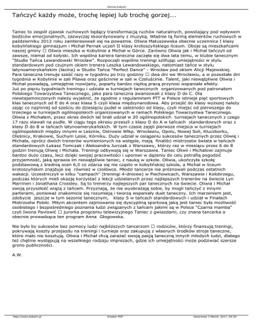 Gmina Kobylin Tańczyć każdy może, trochę lepiej lub trochę gorzej... Taniec to zespół zjawisk ruchowych będący transformacją ruchów naturalnych, powstający pod wpływem bodźców emocjonalnych, zazwyczaj skoordynowany z muzyką. Właśnie tą formą elementów ruchowych w październiku 2012 roku zainteresowali się na poważnie. Oliwia Matuszewska obecnie uczennica I klasy kobylińskiego gimnazjum i Michał Pernak uczeń II klasy krotoszyńskiego liceum. Oboje są mieszkańcami naszej gminy Oliwia mieszka w Kobylinie a Michał w Górce. Zarówno Oliwia jak i Michał tańczyli od zawsze, niemal od kołyski. Ich wspólna kariera taneczna zaczęła się dwa lata temu, w klubie tanecznym "Studio Tańca Lewandowski Wrocław". Rozpoczęli wspólne treningi szlifując umiejętności w stylu standardowym pod czujnym okiem trenera Leszka Lewandowskiego, natomiast tańce w stylu latynoamerykańskim (łacina) w Studio Tańca "Perfect Dance" - Wrocław pod okiem Alicji Majewskiej. Para taneczna trenuje sześć razy w tygodniu po trzy godziny dwa dni we Wrocławiu, a w pozostałe dni tygodnia w Kobylinie w sali Pilawa oraz gościnnie w sali w Czeluścinie. Talent, jaki niewątpliwie Oliwia i Michał posiadają, umiejętnie rozwijany, poparty bardzo ciężką pracą przynosi wspaniałe efekty. Już po pięciu tygodniach treningu i udziale w turniejach tanecznych organizowanych pod patronatem Polskiego Towarzystwa Tanecznego, jako para taneczna awansowali z klasy D do C. Dla niewtajemniczonych należy wyjaśnić, że zgodnie z regulaminem PTT w Polsce istnieje pięć sportowych klas tanecznych od E do A oraz klasa S czyli klasa międzynarodowa. Aby przejść do klasy wyższej należy zając co najmniej od sześciu do dziesięciu pudeł w zależności od klasy, czyli miejsc od pierwszego do trzeciego w turniejach ogólnopolskich organizowanych w ramach Polskiego Towarzystwa Tanecznego. Oliwia z Michałem, przez okres dwóch lat brali udział w 20 ogólnopolskich turniejach tanecznych z czego 17 razy stawali na pudle. W ciągu tego okresu przeszli z klasy D do A w tańcach standardowych oraz z klasy D do B w tańcach latynoamerykańskich. W tym czasie zajęli pierwsze miejsca w turniejach ogólnopolskich między innymi w Lesznie, Ostrowie Wlkp. Wrocławiu, Opolu, Nowej Soli, Kluczborku, Oleśnicy, Krakowie, Suchym Lesie, Kórniku. Duży udział w osiąganiu sukcesów tanecznych przez Oliwię i Michała, oprócz dwóch trenerów wymienionych na wstępie, mają finaliści mistrzostw świata w tańcach standardowych Łukasz Tomczak i Aleksandra Jurczak z Warszawy, którzy raz w miesiącu przez 6 do 8 godzin trenują Oliwię i Michała. Treningi odbywają się w Warszawie. Taniec Oliwii i Michałowi zajmuje bardzo dużo czasu, lecz dzięki swojej pracowitości i uporowi w dążeniu do celu potrafią pogodzić przyjemność, jaką sprawia im niewątpliwie taniec, z nauką w szkole. Oliwia, ukończyła szkołę podstawową z średnią ocen 6,0 co zdarza się nie często w kobylińskiej szkole, a Michał w liceum krotoszyńskim znajduje się również w czołówce. Młodzi tancerze nie próżnowali podczas ostatnich wakacji. Uczestniczyli w kilku "campach" (treningi 4-dniowe) w Piechowicach, Warszawie i Kołobrzegu, podczas których mieli okazję korzystać z lekcji udzielanych przez najlepszych trenerów na świecie Lyn Marrinen i Jonathana Crossley. Są to trenerzy najlepszych par tanecznych na świecie. Oliwia i Michał swoją przyszłość wiążą z tańcem. Przyznają, że nie wyobrażają sobie, by mogli tańczyć z innymi parterami, ponieważ znakomicie się rozumieją i tworzą wspaniały duet taneczny. Ich marzeniem jest, zdobycie jeszcze w tym sezonie tanecznym, klasy S w tańcach standardowych i udział w Finałach Mistrzostw Polski. Miłym akcentem zajmowania się dyscypliną sportową jaką jest taniec była możliwość osobistego i bezpośredniego poznania ludzi związanych z tańcem jakimi są w Polsce "Czarna mamba" czyli Iwona Pavlowić jurorka programu telewizyjnego Taniec z gwiazdami, czy znana tancerka a obecnie prowadząca ten program Anna Głogowska. Nie było by sukcesów bez pomocy ludzi najbliższych tancerzom rodziców, którzy finansują treningi, pokrywają koszty przejazdu na treningi i turnieje oraz zakupują z własnych środków stroje taneczne, które mało nie kosztują. Oliwia i Michał chcą zarażać swoją pasją taneczną innych młodych ludzi, dlatego też chętnie występują na wszelkiego rodzaju imprezach, gdzie ich umiejętności może podziwiać szersze grono publiczności. A.W. http://www.kobylin.pl Kreator PDF Utworzono 3 March, 2017, 00:29