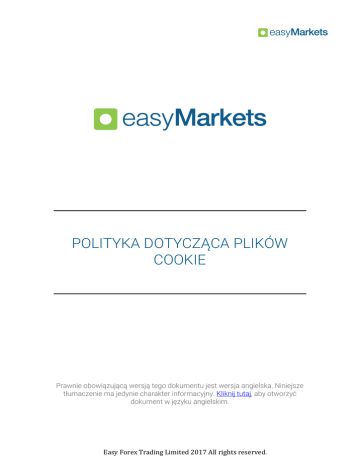 POLITYKA DOTYCZĄCA PLIKÓW COOKIE Prawnie obowiązującą wersją tego dokumentu jest wersja angielska. Niniejsze tłumaczenie ma jedynie charakter informacyjny. Kliknij tutaj, aby otworzyć dokument w języku angielskim. Easy Forex Trading Limited 2017 All rights reserved. Polityka dotycząca plików cookie Korzystając z naszej strony, użytkownik zgadza się na przechowywanie i używanie przez nas plików cookie na swoim urządzeniu. Ma to na celu ułatwienie użytkownikowi korzystania ze strony. Czym są pliki cookie? Pliki cookie to małe pliki tekstowe, które podczas dostępu do internetu są wysyłane na urządzenie użytkownika (np. komputer stacjonarny, laptop, smartfon lub tablet/phablet), gdy użytkownik po raz pierwszy odwiedza daną stronę internetową, a następnie przechowywane na tych urządzeniach. Dlaczego pliki cookie są przydatne? Pliki cookie pozwalają stronie rozpoznać urządzenie użytkownika. Celem zastosowania plików cookie jest bardziej wydajne i komfortowe korzystanie ze strony przez użytkownika. Kategorie plików cookie przechowywanych na urządzeniu użytkownika 1. Podstawowe pliki cookie Pliki cookie, które są niezbędne do obsługi strony internetowej (np. jej funkcji i dostępu do zabezpieczonych obszarów). Bez tych plików cookie niektóre opcje na naszej stronie mogą nie być dostępne. Użycie podstawowych plików cookie jest dla nas niezwykle ważne ze względu na jakość usług świadczonych na rzecz naszych użytkowników. 2. Pliki cookie związane z wydajnością Pliki cookie związane z wydajnością analizują sposób, w jaki osoby odwiedzające korzystają z naszej strony internetowej, a także monitorują wydajność witryny. Te pliki cookie nie zbierają żadnych informacji, które pozwalałyby zidentyfikować użytkowników odwiedzających naszą stronę. 3. Funkcjonalne pliki cookie Easy Forex Trading Limited 2017 All rights reserved. Funkcjonalne pliki cookie pozwalają nam zapamiętać preferencje użytkowników i zapewniać im lepsze lub bardziej dopasowane funkcje. Te pliki cookie pamiętają dokonane przez użytkowników wybory, aby ułatwić im korzystanie ze strony. 4. Pliki cookie do reklam behawioralnych (osoba trzecia) Pliki cookie osób trzecich są wysyłane przez firmy zewnętrzne za pośrednictwem naszej witryny. Firmy zewnętrzne to między innymi sieci społecznościowe i kanały reklamowe, z których korzystamy. Te pliki cookie służą do zbierania informacji o zwyczajach użytkowników w zakresie korzystania z przeglądarki. Są to na przykład: polubienie strony, podzielenie się informacją, obejrzenie reklamy oraz typ przeglądarki/systemu operacyjnego wykorzystywanego przez użytkownika. Pliki cookie tego typu pomagają sprawdzić i zmierzyć skuteczność naszych reklam. W razie potrzeb każdy użytkownik może zrezygnować z tych plików cookie i w dalszym ciągu korzystać z naszej strony internetowej. Jakie pliki cookie wykorzystuje easyMarkets? Nazwa plików cookie Live Person Webeyez auth _ga Okres przechowywania Session Session Sesja 2 lata Opis / Kategoria Controls Live Person chat window Website visitor information/analytics Plik cookie uwierzytelniania API Śledzenie – stosowane do odróżniania użytkowników / osoba trzecia (Google) _gat 10 minut Stosowane do ograniczenia żądań / osoba trzecia (Google) Lista plików cookie będzie aktualizowana na bieżąco. Zarządzanie plikami cookie Niektóre pliki cookie są usuwane w momencie zamknięcia przeglądarki. Są to tak zwane pliki cookie sesji. Inne są przechowywane i pozostają na urządzeniu użytkownika do momentu wygaśnięcia lub ręcznego usunięcia. Nazywane są one trwałymi plikami cookie. Większość przeglądarek internetowych (np. Microsoft Internet Explorer, Mozilla Firefox, Google Chrome, Apple Safari) jest ustawionych tak, aby akceptować pliki cookie. Pozwalają one także kontrolować ustawienia plików cookie i Easy Forex Trading Limited 2017 All rights reserved. usuwać/blokować pliki cookie już zapisane na urządzeniu. Informacje o tym, jak to zrobić znajdują się w opcji „Pomoc” przeglądarki użytkownika. Jak już wspomniano, pliki cookie są często używane do włączania i usprawniania niektórych funkcji na naszej stronie internetowej. Wyłączenie niektórych plików cookie może mieć wpływ na to, jak nasza strona będzie działać. Za każdym razem, kiedy użytkownik korzysta z nowego urządzenia, musi dokonać zmian w przeglądarce, jeśli chce wyłączyć pliki cookie. Przydatne informacje na temat plików cookie Więcej informacji na temat plików cookie można znaleźć na stronie www.youronlinechoices.com. Ten dokument został zaktualizowany po raz ostatni w grudniu 2015 r. Ostrzeżenie o ryzyku: Kontrakty terminowe na stopę procentową, opcje i kontrakty finansowe na transakcje różnicowe (transakcje pozagiełdowe) to produkty wykorzystujące dźwignię finansową, które są obarczone znacznym ryzykiem straty (do całej wartości zainwestowanego kapitału) i nie są Easy Forex Trading Limited 2017 All rights reserved. odpowiednie dla każdego gracza. Konieczne jest poznanie i zrozumienie potencjalnych zagrożeń. Nie należy inwestować pieniędzy, na których stratę nie można sobie pozwolić. Prosimy zapoznać się z pełną wersją ostrzeżenia o ryzyku. Easy Forex Trading Ltd (CySEC – numer licencji 079/07). Easy Forex Trading Limited 2017 All rights reserved.