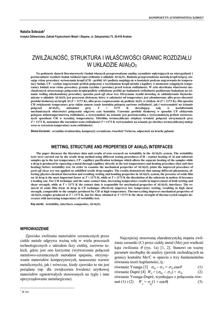 KOMPOZYTY (COMPOSITES) 3(2003)7 Natalia Sobczak1 Instytut Odlewnictwa, Zakład Fizykochemii Metali i Stopów, ul. Zakopiańska 73, 30-418 Kraków ZWILŻALNOŚĆ, STRUKTURA I WŁAŚCIWOŚCI GRANIC ROZDZIAŁU W UKŁADZIE Al/Al2O3 Na podstawie danych literaturowych i badań własnych przeprowadzono analizę czynników wpływających na wiarygodność i powtarzalność wyników badań wielkości kąta zwilżania w układzie Al/Al2O3. Badania przeprowadzono metodą kropli leżącej, stosując różne procedury wytwarzania kropli (CH - próbki Al i podłoża znajdują się w kontakcie podczas nagrzewania do temperatury badań, CP - osobne nagrzewanie próbek połączone z wyciskaniem kropli metalu z kapilary w momencie osiągnięcia temperatury badań) oraz różne procedury grzania (szybkie i powolne) przed testem zwilżalności. W celu określenia właściwości mechanicznych utworzonego połączenia kropla/podłoże schłodzone próbki po badaniach zwilżalności poddawano badaniom na ścinanie według udoskonalonej procedury sposobu push-off shear test. Otrzymane wyniki dowodzą, że oddziaływanie fizykochemiczne w układzie Al/Al2O3 jest procesem złożonym, który w zależności od temperatury jest zdominowany albo przez obecność powłoki tlenkowej na kropli Al (T < 1173 K), albo przez rozpuszczanie się podłoża Al2O3 w ciekłym Al (T > 1173 K). Dla sposobu CH zwiększenie temperatury przy takim samym czasie kontaktu polepsza zarówno zwilżalność, jak i wytrzymałość na ścinanie połączeń Al/Al2O3, natomiast przy T < 1173 K decydującą rolę w kształtowaniu mechanicznych właściwości połączenia odgrywa czas kontaktu. Usuwanie powłoki tlenkowej w sposobie CP efektywnie polepsza niskotemperaturową zwilżalność, a wytrzymałość na ścinanie jest porównywalna z wytrzymałością próbek wytworzonych sposobem CH w wysokiej temperaturze. Obróbka termocykliczna zwiększa trwałość połączeń otrzymanych przy T < 1173 K, natomiast dla warunków testu zwilżalności T > 1173 K wytrzymałość na ścinanie po obróbce termocyklicznej maleje wraz ze wzrostem temperatury testu zwilżalności. Słowa kluczowe: ceramika strukturalna, kompozyty ceramiczne, twardość Vickersa, odporność na kruche pękanie WETTING, STRUCTURE AND PROPERTIES OF Al/Al2O3 INTERFACES The paper discusses the literature data and results of own research on wettability in the Al/Al2O3 system. The wettability tests were curried out by the sessile drop method using different testing procedures (CH - contact heating of Al and substrate samples up to the test temperature, CP - capillary purification technique which allows the separate heating of the samples while a drop is produced by squeezing a metal through capillary directly at the test temperature) and heating procedure (fast and slow heating) before wettability test. In order to examine the mechanical properties of Al/Al2O3 joints the improved procedure of push-off shear test was applied on solidified sessile drop samples. The results demonstrate that among different phenomena, affecting physico-chemical interaction and resulting wetting and bonding properties in Al/Al2O3 system, the presence of oxide film on Al drop is the most important factor at T < 1173 K, while at T > 1173 K the dissolution of the substrate in molten Al becomes a leading one. For CH technique and the same contact time, increasing temperature results in improvement of both wetting and shear strength, while at T < 1173 K the contact time is responsible for mechanical properties of Al/Al2O3 interfaces. The removal of oxide film from Al drop in CP technique effectively improves low temperature wetting, resulting in high shear strength, comparable to the samples produced by CH at high temperature. Thermo-cycling improves mechanical properties of Al/Al2O3 couples produced at T < 1173 K, but for those obtained at T >1173 K the shear strength of thermo-cycled samples decreases with increasing temperature of wettability test. Key words: wettability, interfaces, composites, Al/Al2O3 WPROWADZENIE Zjawisko zwilżania materiałów ceramicznych przez ciekłe metale odgrywa ważną rolę w wielu procesach technologicznych z udziałem fazy ciekłej, zarówno takich, gdzie jest ono korzystne (wytwarzanie połączeń metalowo-ceramicznych metodami spajania, otrzymywanie materiałów kompozytowych, nanoszenie warstw metalicznych), jak i wówczas, kiedy zjawisko to nie jest pożądane (np. dla zwiększenia trwałości użytkowej materiałów ogniotrwałych stosowanych na tygle i inne oprzyrządowanie metalurgiczne). 1 dr inż. Najczęściej stosowaną charakterystyką stopnia zwilżania ceramiki (C) przez ciekły metal (Me) jest wielkość kąta zwilżania θ (rys. 1a) [1, 2]. Stanowi on ważny parametr niezbędny do analizy zjawisk zachodzących na granicy kontaktu Me/C w oparciu o trzy fundamentalne równania teorii kapilarności, tj.: (1) równanie Younga [3] σsg − σ ls = σ lg cosθ równanie Dupré [4] Wa = (σsg − σ ls) + σ lg (2) równanie Younga-Dupré, wynikające z połączenia rów(3) nań (1) i (2) Wa = σlg(1 + cosθ) 302 N. Sobczak gdzie: σsg, σls, σlg - odpowiednio napięcia powierzch- taktu pomiędzy ciekłym Al a tlenkiem glinu, ale również utrudnia opracowanie właściwych zaleceń o charakterze aplikacyjnym. Przykładowo, w 1100 K skrajne wartości kąta zwilżania dla Al/Al2O3 wynoszą: θ =162° [8] i θ = 88°[9]. Wyliczone dla tych danych wartości Wa stanowią odpowiednio 879,8 i 41,6 mJ/m2, to jest różnią się o rząd wielkości, prawie o 2000% (sic!). Niestety, pomimo istotnego znaczenia wielu czynników o charakterze metodologicznym, decydujących o powtarzalności i wiarygodności pomiarów θ, są one zazwyczaj pomijane w publikacjach. W wielu przypadkach jest to postępowanie celowe, wynikające ze znaczenia takiej informacji typu know-how. Jednak główną przyczyną jest brak norm na wysokotemperaturowy test niowe na granicy podłoże/atmosfera, 