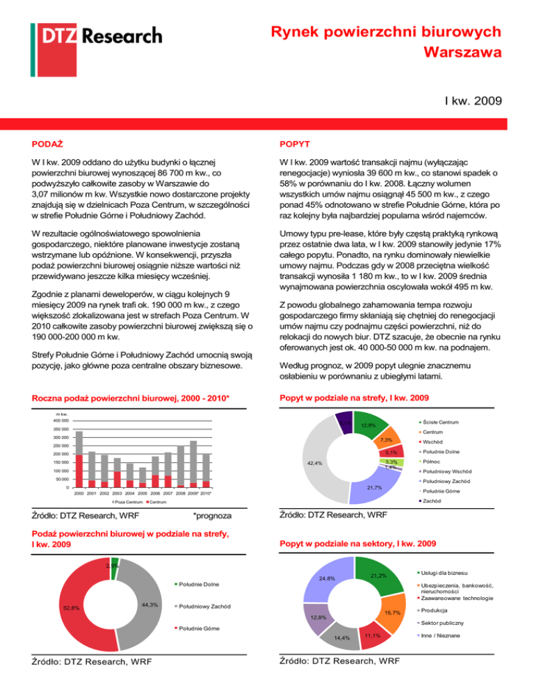 Rynek powierzchni biurowych Warszawa I kw. 2009 PODAŻ POPYT W I kw. 2009 oddano do użytku budynki o łącznej powierzchni biurowej wynoszącej 86 700 m kw., co podwyższyło całkowite zasoby w Warszawie do 3,07 milionów m kw. Wszystkie nowo dostarczone projekty znajdują się w dzielnicach Poza Centrum, w szczególności w strefie Południe Górne i Południowy Zachód. W I kw. 2009 wartość transakcji najmu (wyłączając renegocjacje) wyniosła 39 600 m kw., co stanowi spadek o 58% w porównaniu do I kw. 2008. Łączny wolumen wszystkich umów najmu osiągnął 45 500 m kw., z czego ponad 45% odnotowano w strefie Południe Górne, która po raz kolejny była najbardziej popularna wśród najemców. W rezultacie ogólnoświatowego spowolnienia gospodarczego, niektóre planowane inwestycje zostaną wstrzymane lub opóźnione. W konsekwencji, przyszła podaż powierzchni biurowej osiągnie niższe wartości niż przewidywano jeszcze kilka miesięcy wcześniej. Umowy typu pre-lease, które były częstą praktyką rynkową przez ostatnie dwa lata, w I kw. 2009 stanowiły jedynie 17% całego popytu. Ponadto, na rynku dominowały niewielkie umowy najmu. Podczas gdy w 2008 przeciętna wielkość transakcji wynosiła 1 180 m kw., to w I kw. 2009 średnia wynajmowana powierzchnia oscylowała wokół 495 m kw. Zgodnie z planami deweloperów, w ciągu kolejnych 9 miesięcy 2009 na rynek trafi ok. 190 000 m kw., z czego większość zlokalizowana jest w strefach Poza Centrum. W 2010 całkowite zasoby powierzchni biurowej zwiększą się o 190 000-200 000 m kw. Strefy Południe Górne i Południowy Zachód umocnią swoją pozycję, jako główne poza centralne obszary biznesowe. Roczna podaż powierzchni biurowej, 2000 - 2010* Z powodu globalnego zahamowania tempa rozwoju gospodarczego firmy skłaniają się chętniej do renegocjacji umów najmu czy podnajmu części powierzchni, niż do relokacji do nowych biur. DTZ szacuje, że obecnie na rynku oferowanych jest ok. 40 000-50 000 m kw. na podnajem. Według prognoz, w 2009 popyt ulegnie znacznemu osłabieniu w porównaniu z ubiegłymi latami. Popyt w podziale na strefy, I kw. 2009 m kw. 400 000 6,1% 350 000 Ścisłe Centrum 12,8% Centrum 300 000 7,3% 250 000 200 000 150 000 42,4% 100 000 Wschód 5,1% Południe Dolne 3,3% 1,4% Północ 50 000 Południowy Wschód Południowy Zachód 21,7% 0 Południe Górne 2000 2001 2002 2003 2004 2005 2006 2007 2008 2009* 2010* Poza Centrum Zachód Centrum Źródło: DTZ Research, WRF *prognoza Podaż powierzchni biurowej w podziale na strefy, I kw. 2009 Źródło: DTZ Research, WRF Popyt w podziale na sektory, I kw. 2009 2,9% 24,8% 21,2% Południe Dolne 52,8% 44,3% Ubezpieczenia, bankowość, nieruchomości Zaawansowane technologie Południowy Zachód 15,7% 12,8% Produkcja Sektor publiczny Południe Górne 14,4% Źródło: DTZ Research, WRF Usługi dla biznesu 11,1% Źródło: DTZ Research, WRF Inne / Nieznane STOPA PUSTOSTANÓW CZYNSZE Stopa powierzchni niewynajętej wzrosła z 2,9% pod koniec 2008 do 4,5% w I kw. 2009. W strefach centralnych współczynnik pustostanów znajdował się na poziomie 5,3%, a w dzielnicach Poza Centrum – 4%. Po rekordowym wzroście stawek czynszowych w strefach centralnych, odnotowanym w III kw. 2008 (30-33 Euro / m kw. / mies. w budynkach biurowych klasy A), w I kw. 2009 czynsze wywoławcze spadły do 26-27 Euro / m kw. / mies. Statystyki Warsaw Research Forum dotyczące pustostanów nie obejmują powierzchni oferowanej na podnajem. Uwzględniając szacowaną wielkość tej powierzchni, stopa pustostanów wzrasta do 5,7%. Poziom czynszów ofertowych w strefach Poza Centrum pozostał relatywnie stabilny (16-17 Euro w budynkach biurowych klasy A). Jednakże zwiększająca się konkurencja i słabszy popyt na powierzchnię biurową doprowadziły do spadku stawek efektywnych o ok. 10-15% w porównaniu do wartości notowanych w II połowie 2008. Największa ilość niewynajętej powierzchni pod koniec I kw. 2009 znajdowała się w strefie Południe Dolne – 18,5%. Wynika to z faktu, że jeden z budynków, został całkowicie zwolniony przez najemcę, który przeprowadził się do innego klastra powierzchni biurowej. Najniższą stopę pustostanów odnotowano w strefach: Zachód, Wschód i Południowy Zachód. Według DTZ, czynsze będą utrzymywać tendencje spadkową przez następne 8-12 miesięcy. Stawki wywoławcze za najlepsze powierzchnie w Centrum mogą obniżyć się do 25-26 Euro / m kw. / miesiąc, natomiast w dzielnicach Poza Centrum – do 14-16 Euro / m kw. / mies. DTZ prognozuje dalszy wzrost wskaźnika pustostanów w kolejnych miesiącach 2009, co będzie rezultatem słabszego popytu i wysokiego poziomu nowej podaży. Właściciele budynków zmuszeni będą do oferowania coraz wyższych pakietów zachęt, co wywrze dodatkową presję na spadek czynszów efektywnych. Stopa pustostanów, 2000 – 2009* Czynsze wywoławcze za powierzchnie biurowe klasy A, 2000 – 2009* % Euro / m kw. / miesiąc 25 45 40 20 35 30 15 25 20 10 15 10 5 5 0 0 2000 2001 2002 2003 Średnio 2004 2005 Centrum 2006 2007 2008 2009* 1998 1999 2000 2001 2002 2003 2004 2005 2006 2007 2008 2009* Poza Centrum Źródło: DTZ Research, WRF Centrum Źródło: DTZ Research *prognoza Poza Centrum *prognoza Stopa pustostanów w podziale na strefy, I kw. 2009 Zachód Wschód Południowy Zachód 1,7% 2,1% 2,3% Południowy Wschód 3,8% Południe Górne 4,0% Centrum 4,6% Północ 5,9% Ścisłe Centrum 6,2% Południe Dolne 0,0% 18,5% 5,0% 10,0% 15,0% 20,0% Źródło: DTZ Research, WRF Crown Square Budynki biurowe oddane do użytkowania, I kw. 2009 Budynek Lipowy Office Park Horizon Plaza Mokotów Plaza I Źródło: DTZ Research, WRF Powierzchnia (m kw.) 38 500 31 500 Strefa Deweloper Stopa pustostanów* 0% Południowy Zachód Południe Górne Hochtief Project Developmen Curtis Development 14 300 Południe Górne Celtic Asset Management 22% 37% * w momencie oddania budynku do użytkowania Największe planowane p