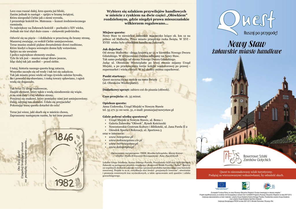 Lecz czas ruszać dalej, kres questa już bliski, Zanim jednak to nastąpi – spójrz w bramę świątyni, Która nieopodal Ciebie jak z ziemi wyrosła, I prezentuje kościół św. Mateusza – kunszt średniowiecznego rzemiosła. To największy na Żuławach kościół – pochodzi z XIV wieku, Jednak nie trać zbyt dużo czasu – ciekawski podróżniku. Odwróć się na pięcie – i dokładnie w przeciwną do bramy stronę, Maszeruj zważając, co wokół Ciebie umiejscowione. Teraz musisz znaleźć piękne dwustuletnie drzwi rzeźbione, Które kiedyś u kupca wewnątrz domu były wstawione. Spójrz na nie uważnie I policz największe elementy owalne. Tyle ile ich jest – musisz minąć drzew jeszcze, Idąc dalej tak jak szedłeś – przed siebie. I tutaj, historia naszego questu krąg zatacza, Wszystko zaczęło się od wody i tak też się zakańcza. Tak jak miasto przez wieki od tego żywiołu zależne bywało, Bo i powodzi się obawiano, i rzeką towary spławiano, i ogień wodą się dogaszało, Tak teraz Ty drogi wędrowcze, Znajdź element, który także z wodą nieodzownie się wiąże. A na nim daty i z tej właśnie strony, Przyjrzyj się znakowi, który pomiędzy nimi jest umiejscowiony. Dalej, odrysuj ten element. Udało się przyjacielu! Pokonując trasę questa dotarłeś do celu! Oto Twój skarb! Uzupełnij brakujący element na pamiątkę rozwiązania questu... Teraz już wiesz, jaki skarb się w mieście chowa, Zapraszamy następnym razem, by też inne poznać! Wybierz się szlakiem przywilejów handlowych w mieście z rynkiem na dwie części „Ołówkiem” rozdzielonym, gdzie niegdyś prawa mieszczańskie wilkierzem regulowano... Miejsce questu: Nowy Staw to niewielkie żuławskie miasteczko leżące ok. km 12 na północ od Malborka. Przez miasto przepływa rzeka Święta. W XVI XVIII wieku było ośrodkiem handlu na Żuławach. Jak dojechać: Od strony Malborka - drogą krajową nr 55 w kierunku Nowego Dworu Gdańskiego. W miejscowości Dębina odbijamy na Nowy Staw. Tak samo podążając od strony Nowego Dworu Gdańskiego. Jadąc ul. Obrońców Westerplatte po lewej stronie mijamy Urząd Miejski, a po przekroczeniu torów kolejki wąskotorowej po prawej supermarket i wieżę ciśnień. W tej okolicy można zaparkować. Nowy Staw żuławskie miasto handlowe Punkt startowy: Quest zaczyna się na moście na rzece Święta (ul. Obrońców Westerplatte). Dodatkowy sprzęt: zabierz coś do pisania (ołówek). Czas przejścia: ok. 35 minut. Opiekun questu: Anna Uzdowska, Urząd Miejski w Nowym Stawie tel. 55 271 51 00 wew. 31, e-mail: [email protected] Gdzie pobrać ulotkę questową? • Urząd Miejski w Nowym Stawie, ul. Bema 1 • Galeria Żuławska “Ołówek”, Rynek Kościuszki • Nowostawskie Centrum Kultury i Biblioteki, ul. Jana Pawła II 2 • Ośrodek Sportu i Rekreacji, ul. Sportowa 5 oraz w internecie: • www.nowystaw.pl • www.noknowystaw.civ.pl • www.osirnowystaw.pl • www.kologotyku.pl Opracowanie merytoryczne: TREK, Monika Gębczyńska, Maciej Kumor Grafika: Studio Kreowania Rzeczywistości Foto: Paweł Siwek Lokalne Grupy Działania: Kraina Dolnego Powiśla, Powiślańska LGD oraz LGD Spichlerz Żuławski są partnerami projektu współpracy „Rowerowe Szlaki Powiśla i Żuław”. Dotyczy on wspólnych działań w zakresie rozwoju i promocji produktu turystycznego oraz turystyki rowerowej. Projekt to m.in. certyfikacja sieci kwater „przyjaznych rowerom”, utworzenie i promocja rowerowych tras wycieczkowych, a także opracowanie serii questów i szlaku geocachingowego. Quest to nieoznakowany szlak turystyczny. Podążaj za wierszowanymi wskazówkami, by odnaleźć skarb. „Europejski Fundusz Rolny na rzecz Rozwoju Obszarów Wiejskich: Europa inwestująca w obszary wiejskie.” Projekt współfinansowany ze środków Unii Europejskiej w ramach Osi 4 LEADER Programu Rozwoju Obszarów Wiejskich na lata 2007-2013. Instytucja odpowiedzialna za treść materiału: Lokalna Grupa Działania Kraina Dolnego Powiśla, Powiślańska Lokalna Grupa Działania oraz Lokalna Grupa Działania Spichlerz Żuławski. Instytucja Zarządzająca PROW na lata 2007-2013: Minister Rolnictwa i Rozwoju Wsi. Dzisiaj na moście w Nowym Stawie kolego, Zaczynasz swoją przygodę krążącą wokół tematu wodnego. Z questem w dłoni, który także o świetności miasta opowie historie, Ruszaj na szlak przygód, z ołówkiem - żeby nie zapomnieć. Mieszkańcy mieli w nim zapisane obowiązki, ale i prawa, Za łamanie jego postanowień groziła im kara. Można było karę pieniężną dostać lub rękę czy głowę stracić, Więc między innymi z sąsiadami nie warto było się wadzić. Woda dla tego miasta od zawsze niezwykle ważna była I także o bogactwie miasta stanowiła. Wyobraź sobie, że dawniej Nowy Staw nad wielką wodą był I rozległy handel z innymi miastami prowadził. Lecz gdy Zalew Wiślany uległ spłyceniu, Tereny Nowego Stawu poddano osuszeniu. Została po tej wodzie tylko ta rzeka, Świętą zwana, Jednak - co wyjątkowe – w jej dolnym biegu, jako Tuga znana. To dzięki tej rzece i wielkim przywilejom miasto się rozwinęło Tak bardzo, że niejedno w okolicy takich praw pragnęło. Ale przerwijmy na chwilę historię wilkierza, Zwróć uwagę na budynek, do którego właśnie zmierzasz. Okazała budowla w XX wieku była w posiadaniu Właściciela parku samochodowego, Na budynku skrzętnie się kryją dwie głowy, Spójrz, jak dwóch mieszczan strzeże swe kupieckie dawne strony. Przyjrzyj się im uważnie, lecz zaraz ruszaj śmiało, bo zobaczyć drugi rynek jeszcze Ci pozostało. Ale zanim poznasz ciekawe historie, Przyjrzyj się jeszcze rzece i ruszaj spokojnie, Tam, gdzie zamiast światełka w tunelu na końcu Twej drogi, Zobaczysz mur cegieł – niech w tym kierunku prowadzą Cię nogi. A więc zaczynamy historię Ci opowiadać, Z gospodarczego sukcesu miasta będziemy się spowiadać. Już w XIV wieku, jak podają dzieje, 30 jatek r