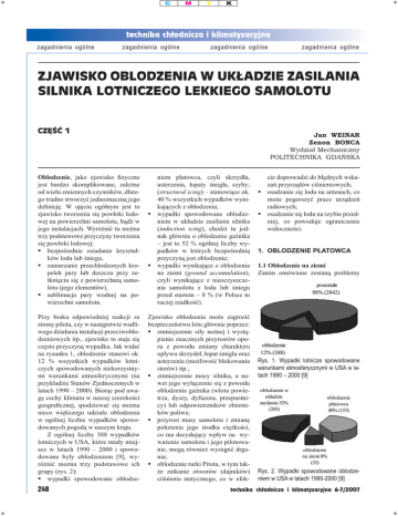 zagadnienia ogólne zagadnienia ogólne zagadnienia ogólne zagadnienia ogólne ZJAWISKO OBLODZENIA W UKŁADZIE ZASILANIA SILNIKA LOTNICZEGO LEKKIEGO SAMOLOTU CZĘŚĆ 1 Jan WEINAR Zenon BONCA Wydział Mechaniczny POLITECHNIKA GDAŃSKA Oblodzenie, jako zjawisko fizyczne jest bardzo skomplikowane, zależne od wielu zmiennych czynników, dlatego trudno stworzyć jednoznaczną jego definicję. W ujęciu ogólnym jest to zjawisko tworzenia się powłoki lodowej na powierzchni samolotu, bądź w jego instalacjach. Wyróżnić tu można trzy podstawowe przyczyny tworzenia się powłoki lodowej: bezpośrednie osiadanie kryształków lodu lub śniegu, zamarzanie przechłodzonych kropelek pary lub deszczu przy zetknięciu się z powierzchnią samolotu (jego elementów), sublimacja pary wodnej na powierzchni samolotu. niem płatowca, czyli skrzydła, usterzenia, łopaty śmigła, szyby; (structural icing) – stanowiące ok. 40 % wszystkich wypadków wynikających z oblodzenia; wypadki spowodowane oblodzeniem w układzie zasilania silnika (induction icing), chodzi tu jednak głównie o oblodzenie gaźnika – jest to 52 % ogólnej liczby wypadków w których bezpośrednią przyczyną jest oblodzenie; wypadki wynikające z oblodzenia na ziemi (ground accumulation), czyli wynikające z nieoczyszczenia samolotu z lodu lub śniegu przed startem – 8 % (w Polsce to raczej rzadkość). Przy braku odpowiedniej reakcji ze strony pilota, czy w następstwie wadliwego działania instalacji przeciwoblodzeniowych itp., zjawisko to staje się często przyczyną wypadku. Jak widać na rysunku 1, oblodzenie stanowi ok. 12 % wszystkich wypadków lotniczych spowodowanych niekorzystnymi warunkami atmosferycznymi (na przykładzie Stanów Zjednoczonych w latach 1990 – 2000). Biorąc pod uwagę cechy klimatu w naszej szerokości geograficznej, spodziewać się można nieco większego udziału oblodzenia w ogólnej liczbie wypadków spowodowanych pogodą w naszym kraju. Z ogólnej liczby 388 wypadków lotniczych w USA, które miały miejsce w latach 1990 – 2000 i spowodowane były oblodzeniem [9], wyróżnić można trzy podstawowe ich grupy (rys. 2): wypadki spowodowane oblodze- Zjawisko oblodzenia może zagrozić bezpieczeństwu lotu głównie poprzez: zmniejszenie siły nośnej i wystąpienie znacznych przyrostów oporu z powodu zmiany charakteru opływu skrzydeł, łopat śmigła oraz usterzenia (możliwość blokowania sterów) itp.; zmniejszenie mocy silnika, a nawet jego wyłączenie się z powodu oblodzenia gaźnika (wlotu powietrza, dyszy, dyfuzora, przepustnicy) lub odpowietrzników zbiorników paliwa; przyrost masy samolotu i zmianę położenia jego środka ciężkości, co ma decydujący wpływ na wyważenie samolotu i jego pilotowanie, mogą również wystąpić drgania; oblodzenie rurki Pitota, w tym także zatkanie otworów (dajników) ciśnienia statycznego, co w efek- 248 cie doprowadzi do błędnych wskazań przyrządów ciśnieniowych; osadzanie się lodu na antenach, co może pogorszyć prace urządzeń radiowych; osadzanie się lodu na szybie przedniej, co powoduje ograniczenie widoczności. 1. OBLODZENIE PŁATOWCA 1.1 Oblodzenie na ziemi Zanim omówione zostaną problemy Rys. 1. Wypadki lotnicze spowodowane warunkami atmosferycznymi w USA w latach 1990 – 2000 [9] Rys. 2. Wypadki spowodowane oblodzeniem w USA w latach 1990-2000 [9] technika chłodnicza i klimatyzacyjna 6-7/2007 zagadnienia ogólne zagadnienia ogólne oblodzenia płatowca powstającego podczas lotu, należy wspomnieć o tzw. oblodzeniu na ziemi, czyli przyczynie ok. 8 % wypadków w USA wynikających z oblodzenia w ogóle. W warunkach zimowych samolot bezwzględnie musi być oczyszczony z lodu i śniegu, ponieważ zalegający na powierzchni skrzydeł i kadłuba nawet niewielkiej grubości śnieg może znacznie wydłużyć start, a przede wszystkim zmienia on charakterystykę lotną samolotu (wzrost oporów, zwiększenie prędkości przeciągnięcia), co przy bardzo małych prędkościach może prowadzić do przeciągnięcia tuż po starcie i rozbicia samolotu. Innym zagrożeniem jest to, że pomimo oczyszczenia powierzchni, lód i śnieg mogą pozostawać w szczelinach lotek, klap, steru kierunku i wysokości, co grozi zablokowaniem lub ograniczeniem wychyleń sterów. Kolejnym problemem powstającym jeszcze na ziemi jest kołowanie po mokrym śniegu tzw. „bryji”. Musi ono być wykonywane szczególnie wolno, aby uniknąć rozbryzgów spod kół podwozia, bowiem mogą one zatkać różnego rodzaju odpowietrzenia, otwory ciśnienia statycznego lub zniekształcić wnęki kół podwozia (gdy w samolocie jest podwozie chowane). W samolocie z chowanym podwoziem po starcie z takiej nawierzchni dobrze jest kilkakrotnie powtórzyć proces chowania i wypuszczania podwozia, aby w ten sposób wyeliminować możliwość jego zamarznięcia w czasie lotu, w położeniu schowanym. Bezpieczna do kołowania i lądowania może być warstwa mokrego śniegu czy błota nie przekraczająca 1 cala (ok. 2,5 cm). 1.2 Rodzaje oblodzenia i warunki sprzyjające jego tworzeniu się Generalnie przyjmuje się, że oblodzenie płatowca mogące zagrozić bezpieczeństwu lotu pojawia się wówczas, gdy samolot leci w chmurze lub w opadzie, gdzie temperatura wynosi od ok. -15°C (w szczególnych warunkach od +4°C) do ok. 0°C. Przy sil- nym mrozie prawdopodobieństwo intensywnego oblodzenia jest niewielkie. Zanim omówione zostaną rodzaje oblodzenia, należy wspomnieć o typach chmur (w zależności od ich struktury) oraz o opadach, bowiem zjawiska te mają decydujące znaczenie przy powstawaniu oblodzenia płatowca. zagadnienia ogólne zagadnienia ogólne Rys. 3. Oblodzenie „na ziemi” w wyniku opadu przechłodzonego deszczu lub mżawki [9] Ze względu na skład, chmury dzielą się na trzy klasy: chmury wodne (kropelkowe) – składające się wyłącznie z kropelek wody, mogące istnieć nie tylko przy temperaturach dodatnich, lecz również przy tem