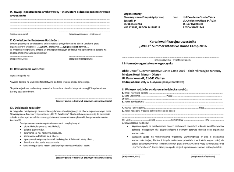 IX. Uwagi i spostrzeżenia wychowawcy – instruktora o dziecku podczas trwania wypoczynku ............................................................................................................................................................... ............................................................................................................................................................... ............................................................................................................................................................... ............................................................................................................................................................... .................................. ..………..………............................................................ (miejscowość, data) Stowarzyszenie Pracy Artystycznej Szczutki 34 86-014 Sicienko KRS 421683, REGON 341284217 oraz Up2Excellence Studio Tańca ul. Chołoniewskiego 34/II/34 85-127 Bydgoszcz REGON340021349 (podpis wychowawcy – instruktora) X. Oświadczenie finansowe Rodziców : Zobowiązujemy się do uiszczenia odpłatności za pobyt dziecka na obozie ustalonej przez organizatora w wysokości …1600,00… zł słownie ……tysiąc sześćset złotych…... W wypadku rezygnacji w okresie 14 dni poprzedzających obóz (lub nie zgłoszenia się dziecka na obóz) poniesiemy 50% jego kosztów. ..................................... ……….............................................. (miejscowość, data) Organizatorzy: (podpis rodzica/opiekuna) Karta kwalifikacyjna uczestnika „WOLF” Summer Intensive Dance Camp 2016 ........................................................................................................................................... (imię i nazwisko - wypełnić drukiem) I. Informacje organizatora o wypoczynku XI. Oświadczenie rodziców: Wyrażam zgodę na: *wyjazd dziecka na wycieczki fakultatywne podczas trwania obozu tanecznego. *kąpiele w jeziorze pod opieką ratownika, basenie w ośrodku lub podczas wyjść i wycieczek na baseny poza ośrodkiem. …………............................................................................... (czytelny podpis rodziców lub prawnych opiekunów dziecka) XII. Deklaracja rodziców W przypadku drastycznego naruszenia regulaminu obowiązującego na obozie organizowanym przez Stowarzyszenie Pracy Artystycznej oraz „Up To Excellence” Studio zobowiązujemy się do odebrania dziecka z obozu po wcześniejszym uzgodnieniu z kierownictwem placówki, bez prawa do zwrotu kosztów!!! Drastyczne naruszenie regulaminu obozu to między innymi: picie alkoholu (piwo to też alkohol), palenie papierosów, odurzanie się np. narkotyki, kleje, itp. samowolne oddalenie się z obozu, agresywny i wulgarny stosunek do kolegów, koleżanek i kadry obozu, świadome niszczenie wyposażenia, łamanie reguł bycia razem ustalonych przez obozowiczów i kadrę. …………............................................................................... (czytelny podpis rodziców lub prawnych opiekunów dziecka) Obóz: „Wolf” Summer Intensive Dance Camp 2016 – obóz rekreacyjno-taneczny Miejsce: Hotel Manor - Olsztyn Ul. Kanarkowa 47, 11-041 Olsztyn Rodzaj obozu: stały w budynku (pokoje hotelowe) II. Wniosek rodziców o skierowanie dziecka na obóz 1. Imię i Nazwisko dziecka ...................................................................................................................... 2. Data urodzenia .................................................... PESEL: …………………………………………………………………………………… Ubezp.: …………………………………………………………………………………………………………………………………………………………….… 3. Adres zamieszkania ……….................................................................................................................... ................................................................................................................................................................. 4. Nazwa i adres szkoły………………………………….....……………………………………….…klasa……………………………. 5. Adres rodziców w czasie pobytu dziecka na obozie ................................................................................................................................................................. ................................................................................................................................................................. tel. Dom ............................ praca ........................ komórkowy ….............................. inny ...................... 6. Oświadczenie Rodziców: Wyrażam zgodę na przetwarzanie danych osobowych zawartych w karcie kwalifikacyjnej w zakresie niezbędnym dla bezpieczeństwa i ochrony zdrowia dziecka oraz organizacji wypoczynku. Wyrażam zgodę na wykorzystanie wizerunku wymienionego w pkt. II uczestnika wypoczynku (zdjęć, filmów i innych materiałów powstałych w trakcie wypoczynku) do celów dokumentacyjnych i informacyjnych przez Stowarzyszenie Pracy Artystycznej oraz „Up To Excellence” Studio. Niniejsza zgoda nie jest ograniczona czasowo ani terytorialnie. ..................................... ………...................................... (miejscowość, data) (podpis rodzica/opiekuna) IV Informacje o szczepieniach (lub przedstawienie książeczki zdrowia z aktualnym wpisem szczepień) III. Informacje rodziców o stanie zdrowia dziecka (kadry pedagogicznej i służby zdrowia) 1.Imię i nazwisko dziecka ..................................................................................... Grupa krwi .............. 2. Przebyte choroby (podać w którym roku życia) odra ...................... ospa
