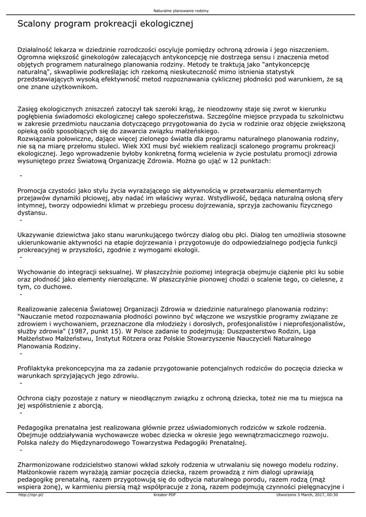 Naturalne planowanie rodziny Scalony program prokreacji ekologicznej Działalność lekarza w dziedzinie rozrodczości oscyluje pomiędzy ochroną zdrowia i jego niszczeniem. Ogromna większość ginekologów zalecających antykoncepcję nie dostrzega sensu i znaczenia metod objętych programem naturalnego planowania rodziny. Metody te traktują jako "antykoncepcję naturalną", skwapliwie podkreślając ich rzekomą nieskuteczność mimo istnienia statystyk przedstawiających wysoką efektywność metod rozpoznawania cyklicznej płodności pod warunkiem, że są one znane użytkownikom. Zasięg ekologicznych zniszczeń zatoczył tak szeroki krąg, że nieodzowny staje się zwrot w kierunku pogłębienia świadomości ekologicznej całego społeczeństwa. Szczególne miejsce przypada tu szkolnictwu w zakresie przedmiotu nauczania dotyczącego przygotowania do życia w rodzinie oraz objęcie zwiększoną opieką osób sposobiących się do zawarcia związku małżeńskiego. Rozwiązania połowiczne, dające więcej zielonego światła dla programu naturalnego planowania rodziny, nie są na miarę przełomu stuleci. Wiek XXI musi być wiekiem realizacji scalonego programu prokreacji ekologicznej. Jego wprowadzenie byłoby konkretną formą wcielenia w życie postulatu promocji zdrowia wysuniętego przez Światową Organizację Zdrowia. Można go ująć w 12 punktach: Promocja czystości jako stylu życia wyrażającego się aktywnością w przetwarzaniu elementarnych przejawów dynamiki płciowej, aby nadać im właściwy wyraz. Wstydliwość, będąca naturalną osłoną sfery intymnej, tworzy odpowiedni klimat w przebiegu procesu dojrzewania, sprzyja zachowaniu fizycznego dystansu. Ukazywanie dziewictwa jako stanu warunkującego twórczy dialog obu płci. Dialog ten umożliwia stosowne ukierunkowanie aktywności na etapie dojrzewania i przygotowuje do odpowiedzialnego podjęcia funkcji prokreacyjnej w przyszłości, zgodnie z wymogami ekologii. Wychowanie do integracji seksualnej. W płaszczyźnie poziomej integracja obejmuje ciążenie płci ku sobie oraz płodność jako elementy nierozłączne. W płaszczyźnie pionowej chodzi o scalenie tego, co cielesne, z tym, co duchowe. Realizowanie zalecenia Światowej Organizacji Zdrowia w dziedzinie naturalnego planowania rodziny: "Nauczanie metod rozpoznawania płodności powinno być włączone we wszystkie programy związane ze zdrowiem i wychowaniem, przeznaczone dla młodzieży i dorosłych, profesjonalistów i nieprofesjonalistów, służby zdrowia" (1987, punkt 15). W Polsce zadanie to podejmują: Duszpasterstwo Rodzin, Liga Małżeństwo Małżeństwu, Instytut Rötzera oraz Polskie Stowarzyszenie Nauczycieli Naturalnego Planowania Rodziny. Profilaktyka prekoncepcyjna ma za zadanie przygotowanie potencjalnych rodziców do poczęcia dziecka w warunkach sprzyjających jego zdrowiu. Ochrona ciąży pozostaje z natury w nieodłącznym związku z ochroną dziecka, toteż nie ma tu miejsca na jej współistnienie z aborcją. Pedagogika prenatalna jest realizowana głównie przez uświadomionych rodziców w szkole rodzenia. Obejmuje oddziaływania wychowawcze wobec dziecka w okresie jego wewnątrzmacicznego rozwoju. Polska należy do Międzynarodowego Towarzystwa Pedagogiki Prenatalnej. Zharmonizowane rodzicielstwo stanowi wkład szkoły rodzenia w utrwalaniu się nowego modelu rodziny. Małżonkowie razem wyrażają zamiar poczęcia dziecka, razem prowadzą z nim dialogi uprawiają pedagogikę prenatalną, razem przygotowują się do odbycia naturalnego porodu, razem rodzą (mąż wspiera żonę), w karmieniu piersią mąż współpracuje z żoną, razem podejmują czynności pielęgnacyjne i http://npr.pl/ Kreator PDF Utworzono 3 March, 2017, 00:30 Naturalne planowanie rodziny opiekuńcze nad dzieckiem. Przysposobienie do naturalnego porodu obojga małżonków stanowi główne zadanie szkoły rodzenia. Dzięki temu poród staje się wydarzeniem rodzinnym, a nie procedurą zabiegowo - operacyjną. Przygotowanie do ról rodzicielskich umożliwia lepszą współpracę małżonków, zapewnia kontakt skórny obojga rodziców z dzieckiem, równoważy oddziaływania wychowawcze. Poród naturalny - to poród przeżywany jako zadanie, jako świadome, aktywne i sprawne współdziałanie rodzącej kobiety i wspierającego ją mężczyzny z siłami natury, w celu umożliwienia dziecku łagodnego przejścia przez drogi rodne i miękkie lądowanie na łonie matki. Ekologiczne karmienie realizowane zgodnie z wytycznymi zawartymi we wspólnym oświadczeniu WHO i UNICEF w sprawie "ochrony, propagowania i wspierania karmienia piersią" (rok 1989). Scalony program prokreacji ekologicznej ukazuje się jako nakaz chwili, jako "znak czasu". Jego pilne i konsekwentne wdrożenie powinno uchronić ludzkość przed katastrofą ekologiczną w dziedzinie rozrodczości, zmienić kierunek cywilizacji: od kultury śmierci do kultury życia. prof. Włodzimierz Fijałkowski http://npr.pl/ Kreator PDF Utworzono 3 March, 2017, 00:30
