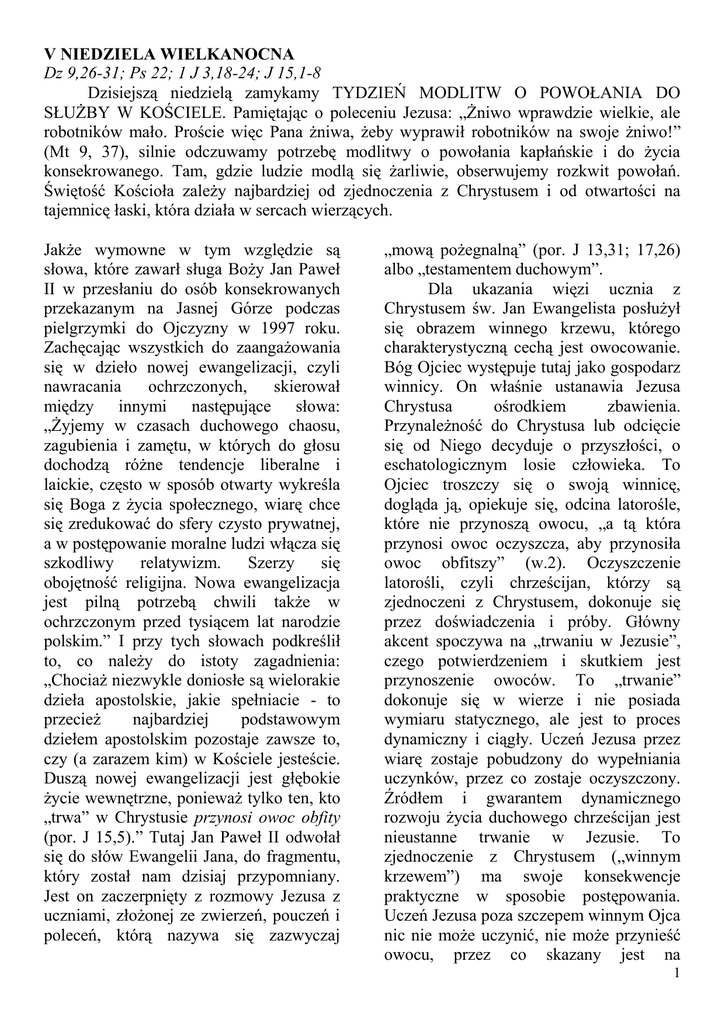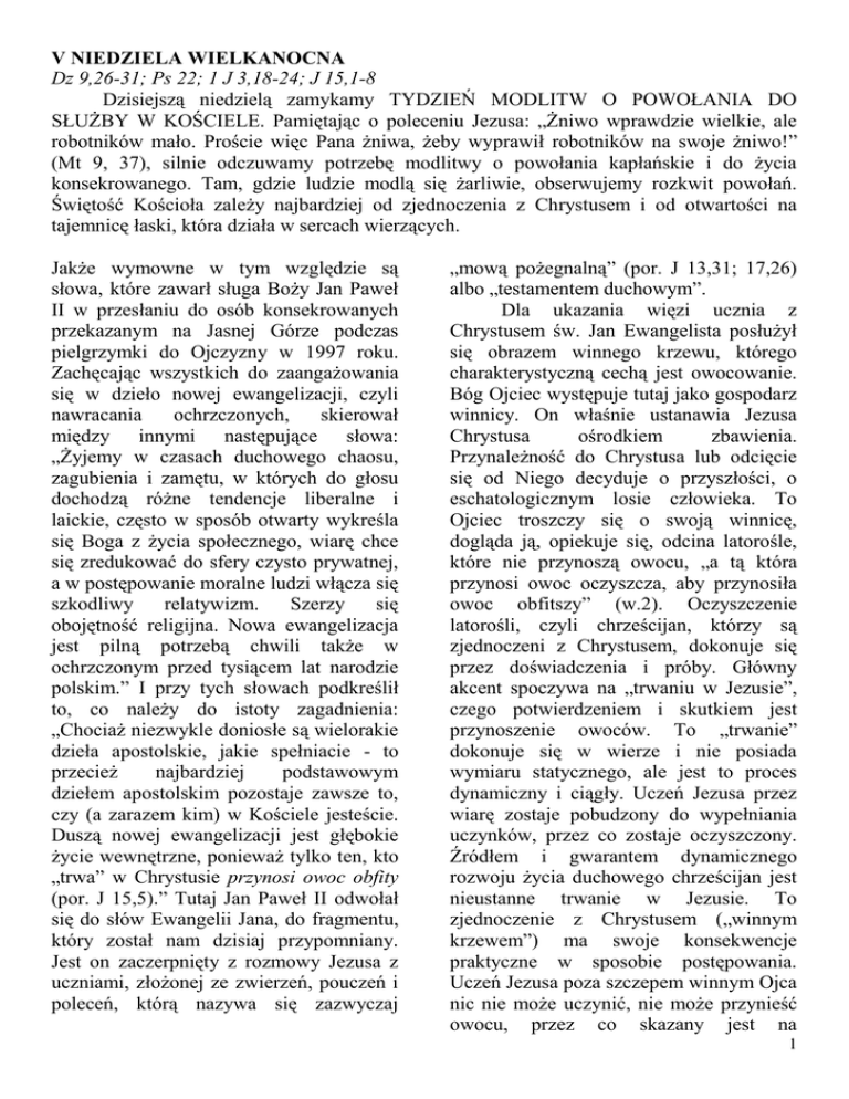 V NIEDZIELA WIELKANOCNA Dz 9,26-31; Ps 22; 1 J 3,18-24; J 15,1-8 Dzisiejszą niedzielą zamykamy TYDZIEŃ MODLITW O POWOŁANIA DO SŁUŻBY W KOŚCIELE. Pamiętając o poleceniu Jezusa: „Żniwo wprawdzie wielkie, ale robotników mało. Proście więc Pana żniwa, żeby wyprawił robotników na swoje żniwo!” (Mt 9, 37), silnie odczuwamy potrzebę modlitwy o powołania kapłańskie i do życia konsekrowanego. Tam, gdzie ludzie modlą się żarliwie, obserwujemy rozkwit powołań. Świętość Kościoła zależy najbardziej od zjednoczenia z Chrystusem i od otwartości na tajemnicę łaski, która działa w sercach wierzących. Jakże wymowne w tym względzie są słowa, które zawarł sługa Boży Jan Paweł II w przesłaniu do osób konsekrowanych przekazanym na Jasnej Górze podczas pielgrzymki do Ojczyzny w 1997 roku. Zachęcając wszystkich do zaangażowania się w dzieło nowej ewangelizacji, czyli nawracania ochrzczonych, skierował między innymi następujące słowa: „Żyjemy w czasach duchowego chaosu, zagubienia i zamętu, w których do głosu dochodzą różne tendencje liberalne i laickie, często w sposób otwarty wykreśla się Boga z życia społecznego, wiarę chce się zredukować do sfery czysto prywatnej, a w postępowanie moralne ludzi włącza się szkodliwy relatywizm. Szerzy się obojętność religijna. Nowa ewangelizacja jest pilną potrzebą chwili także w ochrzczonym przed tysiącem lat narodzie polskim.” I przy tych słowach podkreślił to, co należy do istoty zagadnienia: „Chociaż niezwykle doniosłe są wielorakie dzieła apostolskie, jakie spełniacie - to przecież najbardziej podstawowym dziełem apostolskim pozostaje zawsze to, czy (a zarazem kim) w Kościele jesteście. Duszą nowej ewangelizacji jest głębokie życie wewnętrzne, ponieważ tylko ten, kto „trwa” w Chrystusie przynosi owoc obfity (por. J 15,5).” Tutaj Jan Paweł II odwołał się do słów Ewangelii Jana, do fragmentu, który został nam dzisiaj przypomniany. Jest on zaczerpnięty z rozmowy Jezusa z uczniami, złożonej ze zwierzeń, pouczeń i poleceń, którą nazywa się zazwyczaj „mową pożegnalną” (por. J 13,31; 17,26) albo „testamentem duchowym”. Dla ukazania więzi ucznia z Chrystusem św. Jan Ewangelista posłużył się obrazem winnego krzewu, którego charakterystyczną cechą jest owocowanie. Bóg Ojciec występuje tutaj jako gospodarz winnicy. On właśnie ustanawia Jezusa Chrystusa ośrodkiem zbawienia. Przynależność do Chrystusa lub odcięcie się od Niego decyduje o przyszłości, o eschatologicznym losie człowieka. To Ojciec troszczy się o swoją winnicę, dogląda ją, opiekuje się, odcina latorośle, które nie przynoszą owocu, „a tą która przynosi owoc oczyszcza, aby przynosiła owoc obfitszy” (w.2). Oczyszczenie latorośli, czyli chrześcijan, którzy są zjednoczeni z Chrystusem, dokonuje się przez doświadczenia i próby. Główny akcent spoczywa na „trwaniu w Jezusie”, czego potwierdzeniem i skutkiem jest przynoszenie owoców. To „trwanie” dokonuje się w wierze i nie posiada wymiaru statycznego, ale jest to proces dynamiczny i ciągły. Uczeń Jezusa przez wiarę zostaje pobudzony do wypełniania uczynków, przez co zostaje oczyszczony. Źródłem i gwarantem dynamicznego rozwoju życia duchowego chrześcijan jest nieustanne trwanie w Jezusie. To zjednoczenie z Chrystusem („winnym krzewem”) ma swoje konsekwencje praktyczne w sposobie postępowania. Uczeń Jezusa poza szczepem winnym Ojca nic nie może uczynić, nie może przynieść owocu, przez co skazany jest na 1 bezpłodność w życiu nadprzyrodzonym wraz ze wszystkimi tego konsekwencjami. Trwanie i wytrwanie w Chrystusie staje się naczelną zasadą życia chrześcijańskiego i jedności wspólnoty chrześcijańskiej. W Ewangelii według św. Jana czasownik trwać wyraża odpowiedź człowieka na inicjatywę Boga. „Trwać” wskazuje na coś więcej niż więź powierzchowną, okazjonalną, prowizoryczną. To coś więcej niż zwykła bliskość; wyraża głęboką rzeczywistość, trwały związek, żywotną wymianę. Chodzi o trwanie w Jego słowie (por. J 8,31). Słowo nie może być zatem tylko czymś zewnętrznym. Trzeba, aby zostało przyswojone, aby stało się zasadą kierującą postępowaniem człowieka. W ten sposób uczeń zakorzenia się w świecie prawdy i wolności. Wszystko to dokonuje się pod znakiem wzajemności: „Wytrwajcie we mnie, a Ja [będę trwał] w was. [...] Jeśli we Mnie trwać będziecie, a słowa moje w was...”. Jeśli Kościół szuka oparcia „gdzie indziej” - w sile, we władzy, w sukcesie, w liczbach, w prestiżu, w bogactwie, w dyplomacji, we wspaniałych budowlach nie będzie winnicą Pana. W nieunikniony sposób będzie skazany na jałowość. Jedynym bezpiecznym miejscem dla Kościoła jest solidne zakorzenienie w Chrystusie, w mocy Jego słowa ubogiego, bezbronnego, odrzuconego, wyśmianego. Jeśli ten podstawowy warunek nie jest spełniony, wszystko inne nawet jeśli na zewnątrz wydaje się atrakcyjne - staje się dwuznaczne i niebezpieczne. Kościół, który żyje wyłącznie Ewangelią i dla Ewangelii, nie musi się bać przeszkód i sprzeciwów, z jakimi spotyka się na swojej drodze. Kościół szanowany, oklaskiwany, „chroniony”, budzący strach, ryzykuje, że za owe „przywileje” zapłaci zdradą Ewangelii i straci swoje autentyczne oblicze. Jezus przypomina dzisiaj o jeszcze jednej powinności - o „przynoszeniu owocu”. W kilku wersetach wyrażenie to pojawia się aż sześć razy. Kościół nie jest rodzajem rośliny ozdobnej. Owocowanie nie jest dla latorośli czymś dodatkowym. Jest racją jego istnienia. Owoc nie jest ozdobą winnicy. Jest jej podstawową powinnością. Jezus wyraźnie podkreśla: „Beze Mnie nic nie możecie uczynić”. Płodność Kościoła nie jest wynikiem mniej lub bardziej wyrafinowanych metod technicznych, nie jest owocem dokumentów wypracowanych w spec