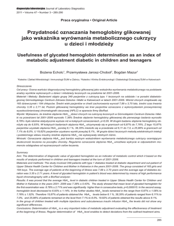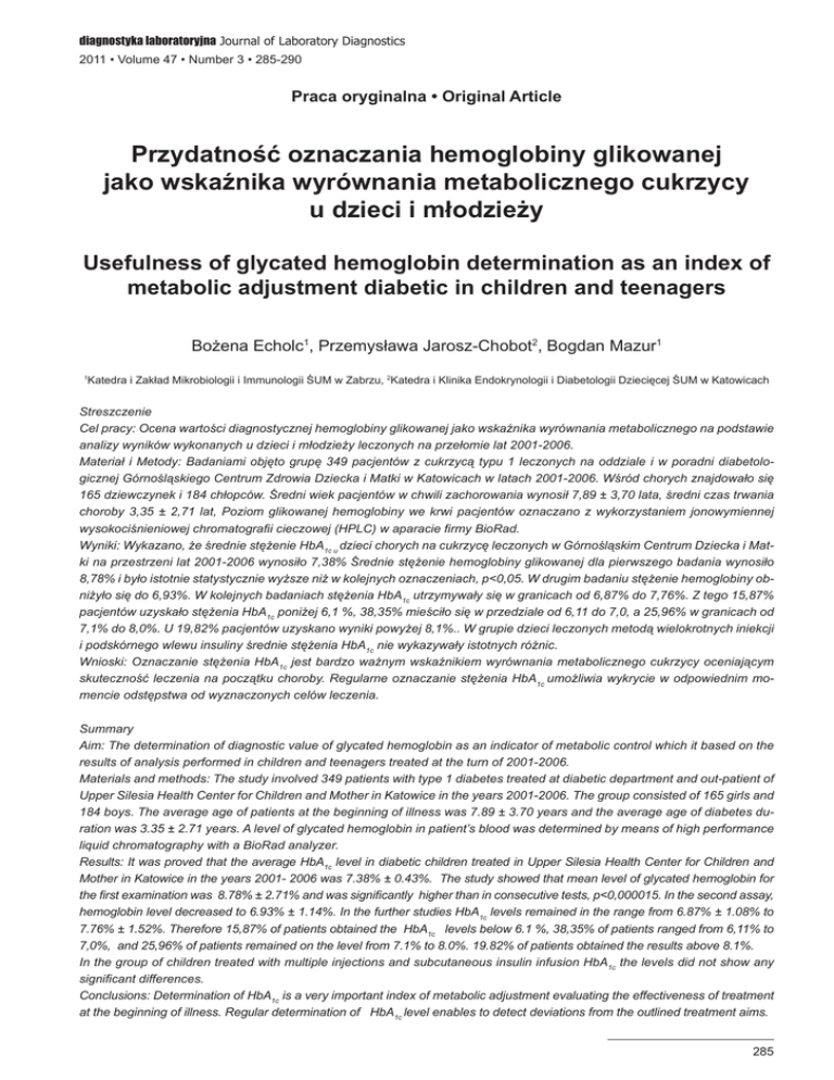 diagnostyka laboratoryjna Journal of Laboratory Diagnostics 2011 • Volume 47 • Number 3 • 285-290 Praca oryginalna • Original Article Przydatność oznaczania hemoglobiny glikowanej jako wskaźnika wyrównania metabolicznego cukrzycy u dzieci i młodzieży Usefulness of glycated hemoglobin determination as an index of metabolic adjustment diabetic in children and teenagers Bożena Echolc1, Przemysława Jarosz-Chobot2, Bogdan Mazur1 1 Katedra i Zakład Mikrobiologii i Immunologii ŚUM w Zabrzu, 2Katedra i Klinika Endokrynologii i Diabetologii Dziecięcej ŚUM w Katowicach Streszczenie Cel pracy: Ocena wartości diagnostycznej hemoglobiny glikowanej jako wskaźnika wyrównania metabolicznego na podstawie analizy wyników wykonanych u dzieci i młodzieży leczonych na przełomie lat 2001-2006. Materiał i Metody: Badaniami objęto grupę 349 pacjentów z cukrzycą typu 1 leczonych na oddziale i w poradni diabetologicznej Górnośląskiego Centrum Zdrowia Dziecka i Matki w Katowicach w latach 2001-2006. Wśród chorych znajdowało się 165 dziewczynek i 184 chłopców. Średni wiek pacjentów w chwili zachorowania wynosił 7,89 ± 3,70 lata, średni czas trwania choroby 3,35 ± 2,71 lat, Poziom glikowanej hemoglobiny we krwi pacjentów oznaczano z wykorzystaniem jonowymiennej wysokociśnieniowej chromatografii cieczowej (HPLC) w aparacie firmy BioRad. Wyniki: Wykazano, że średnie stężenie HbA1c u dzieci chorych na cukrzycę leczonych w Górnośląskim Centrum Dziecka i Matki na przestrzeni lat 2001-2006 wynosiło 7,38% Średnie stężenie hemoglobiny glikowanej dla pierwszego badania wynosiło 8,78% i było istotnie statystycznie wyższe niż w kolejnych oznaczeniach, p<0,05. W drugim badaniu stężenie hemoglobiny obniżyło się do 6,93%. W kolejnych badaniach stężenia HbA1c utrzymywały się w granicach od 6,87% do 7,76%. Z tego 15,87% pacjentów uzyskało stężenia HbA1c poniżej 6,1 %, 38,35% mieściło się w przedziale od 6,11 do 7,0, a 25,96% w granicach od 7,1% do 8,0%. U 19,82% pacjentów uzyskano wyniki powyżej 8,1%.. W grupie dzieci leczonych metodą wielokrotnych iniekcji i podskórnego wlewu insuliny średnie stężenia HbA1c nie wykazywały istotnych różnic. Wnioski: Oznaczanie stężenia HbA1c jest bardzo ważnym wskaźnikiem wyrównania metabolicznego cukrzycy oceniającym skuteczność leczenia na początku choroby. Regularne oznaczanie stężenia HbA1c umożliwia wykrycie w odpowiednim momencie odstępstwa od wyznaczonych celów leczenia. Summary Aim: The determination of diagnostic value of glycated hemoglobin as an indicator of metabolic control which it based on the results of analysis performed in children and teenagers treated at the turn of 2001-2006. Materials and methods: The study involved 349 patients with type 1 diabetes treated at diabetic department and out-patient of Upper Silesia Health Center for Children and Mother in Katowice in the years 2001-2006. The group consisted of 165 girls and 184 boys. The average age of patients at the beginning of illness was 7.89 ± 3.70 years and the average age of diabetes duration was 3.35 ± 2.71 years. A level of glycated hemoglobin in patient’s blood was determined by means of high performance liquid chromatography with a BioRad analyzer. Results: It was proved that the average HbA1c level in diabetic children treated in Upper Silesia Health Center for Children and Mother in Katowice in the years 2001- 2006 was 7.38% ± 0.43%. The study showed that mean level of glycated hemoglobin for the first examination was 8.78% ± 2.71% and was significantly higher than in consecutive tests, p<0,000015. In the second assay, hemoglobin level decreased to 6.93% ± 1.14%. In the further studies HbA1c levels remained in the range from 6.87% ± 1.08% to 7.76% ± 1.52%. Therefore 15,87% of patients obtained the HbA1c levels below 6.1 %, 38,35% of patients ranged from 6,11% to 7,0%, and 25,96% of patients remained on the level from 7.1% to 8.0%. 19.82% of patients obtained the results above 8.1%. In the group of children treated with multiple injections and subcutaneous insulin infusion HbA1c the levels did not show any significant differences. Conclusions: Determination of HbA1c is a very important index of metabolic adjustment evaluating the effectiveness of treatment at the beginning of illness. Regular determination of HbA1c level enables to detect deviations from the outlined treatment aims. 285 Przydatność oznaczania hemoglobiny glikowanej jako wskaźnika wyrównania metabolicznego cukrzycy u dzieci i młodzieży Słowa kluczowe:hemoglobina glikowana, poziom cukru, dzieci i młodzież Key words:glycated hemoglobin, glucose level, children Wstęp Określenie cukrzyca (diabetes mellitus) odnosi się do licznej grupy chorób i zaburzeń metabolicznych o odrębnej etiologii, które charakteryzują się patologiczną hiperglikemią [23]. Według ostatnich ocen Światowej Organizacji Zdrowia (WHO) na cukrzycę choruje na świecie 135 milionów ludzi, przy czym w Europie i Ameryce Północnej chorzy na cukrzycę typu 1 stanowią 3-10% ogółu osób z cukrzycą [7, 18]. Zbyt późne rozpoznanie cukrzycy, jak również niewłaściwe leczenie są odpowiedzialne za rozwój przewlekłych powikłań tej choroby o charakterze neuropatii, mikro- i makroangiopatii. Badania Diabetes Control and Complications Trials (DCCT) przeprowadzone u chorych na cukrzycę typu 1 oraz badania Kumamoto Study i United Kingdom Prospective Diabetes Study (UKPDS) przeprowadzone u chorych na cukrzycę typu 2 wykazały jednoznacznie, iż osiągnięcie stanu normoglikemii i uzyskanie optymalnego wyrównania metabolicznego istotnie ogranicza występowanie najbardziej swoistych dla cukrzycy powikłań o charakterze mikroangiopatii. Jednym z parametrów oceniających wyrównanie metaboliczne cukrzycy jest hemoglobina glikowana. Główną ludzką hemoglobiną jest HbA (α2β2) stanowiąca od 90% do 95% ogólnej hemoglobiny zgromadzonej w erytrocytach z