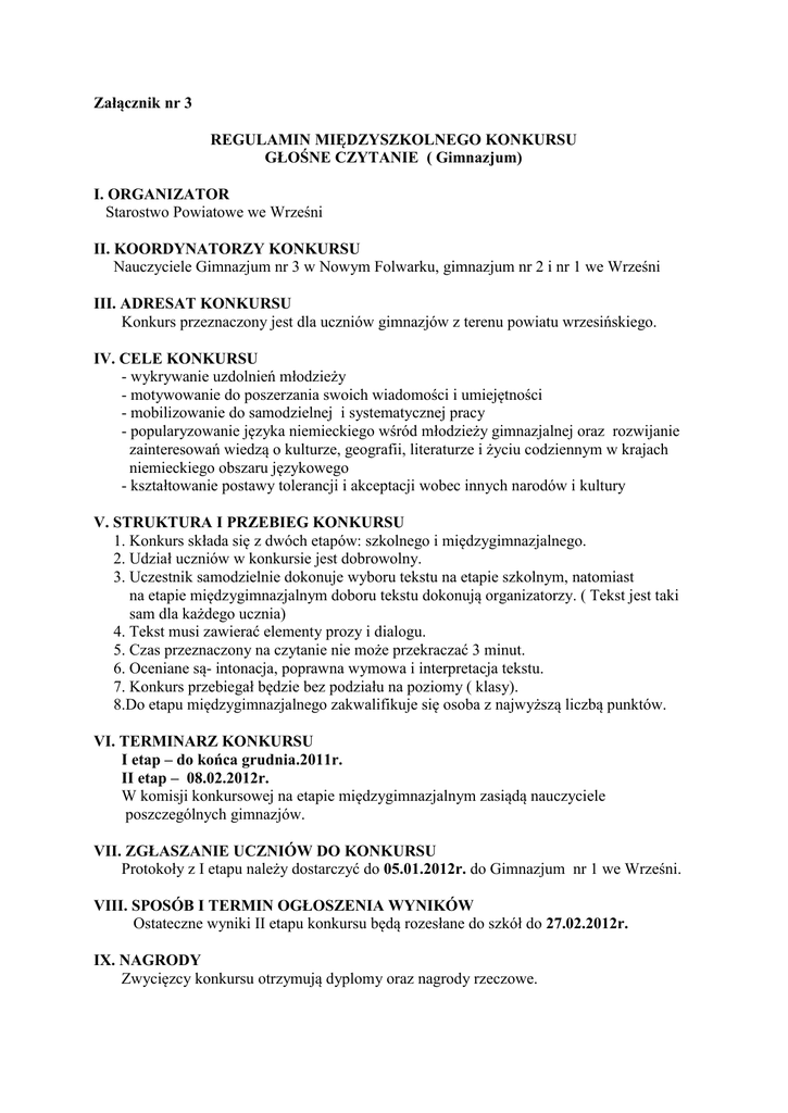 Załącznik nr 3 REGULAMIN MIĘDZYSZKOLNEGO KONKURSU GŁOŚNE CZYTANIE ( Gimnazjum) I. ORGANIZATOR Starostwo Powiatowe we Wrześni II. KOORDYNATORZY KONKURSU Nauczyciele Gimnazjum nr 3 w Nowym Folwarku, gimnazjum nr 2 i nr 1 we Wrześni III. ADRESAT KONKURSU Konkurs przeznaczony jest dla uczniów gimnazjów z terenu powiatu wrzesińskiego. IV. CELE KONKURSU - wykrywanie uzdolnień młodzieży - motywowanie do poszerzania swoich wiadomości i umiejętności - mobilizowanie do samodzielnej i systematycznej pracy - popularyzowanie języka niemieckiego wśród młodzieży gimnazjalnej oraz rozwijanie zainteresowań wiedzą o kulturze, geografii, literaturze i życiu codziennym w krajach niemieckiego obszaru językowego - kształtowanie postawy tolerancji i akceptacji wobec innych narodów i kultury V. STRUKTURA I PRZEBIEG KONKURSU 1. Konkurs składa się z dwóch etapów: szkolnego i międzygimnazjalnego. 2. Udział uczniów w konkursie jest dobrowolny. 3. Uczestnik samodzielnie dokonuje wyboru tekstu na etapie szkolnym, natomiast na etapie międzygimnazjalnym doboru tekstu dokonują organizatorzy. ( Tekst jest taki sam dla każdego ucznia) 4. Tekst musi zawierać elementy prozy i dialogu. 5. Czas przeznaczony na czytanie nie może przekraczać 3 minut. 6. Oceniane są- intonacja, poprawna wymowa i interpretacja tekstu. 7. Konkurs przebiegał będzie bez podziału na poziomy ( klasy). 8.Do etapu międzygimnazjalnego zakwalifikuje się osoba z najwyższą liczbą punktów. VI. TERMINARZ KONKURSU I etap – do końca grudnia.2011r. II etap – 08.02.2012r. W komisji konkursowej na etapie międzygimnazjalnym zasiądą nauczyciele poszczególnych gimnazjów. VII. ZGŁASZANIE UCZNIÓW DO KONKURSU Protokoły z I etapu należy dostarczyć do 05.01.2012r. do Gimnazjum nr 1 we Wrześni. VIII. SPOSÓB I TERMIN OGŁOSZENIA WYNIKÓW Ostateczne wyniki II etapu konkursu będą rozesłane do szkół do 27.02.2012r. IX. NAGRODY Zwycięzcy konkursu otrzymują dyplomy oraz nagrody rzeczowe. X. UWAGI KOŃCOWE O terminie i miejscu PODSUMOWANIA KONKURSU uczestnicy i szkoły zostaną powiadomieni odrębnym pismem. Wyniki konkursu zatwierdzone przez Komisję konkursową są ostateczne. Szczegółowych informacji udzielają: Izabela Chudzińska Gimnazjum nr 3, tel.606 817 445 [email protected]; Beata Marciniak Gimnazjum nr 2 , tel. 530 727 017 [email protected] Aleksandra Jackowska Gimnazjum nr 1 Załącznik nr 3 REGULAMIN KONKURSU „ Piękne czytanie” w języku niemieckim I. ORGANIZATOR Starostwo Powiatowe we Wrześni II. KOORDYNATORZY KONKURSU Anna Stachowiak Liceum Ogólnokształcące im . Henryka Sienkiewicza we Wrześni i Elżbieta Tarczewska Zespół Szkół Technicznych i Ogólnokształcących im. gen.dr. Romana Abrahama we Wrześni III.ADRESAT KONKURSU Konkurs „ Pięknego czytania” przeznaczony jest dla uczniów wszystkich szkół Ponadgimnazjalnych we Wrześni uczących się języka niemieckiego; w konkursie nie mogą uczestniczyć osoby, które wczesniej uczęszczały do szkół niemieckich. IV. CELE KONKURSU Zadaniem tego konkursu jest: - rozwój czytelnictwa i poznawanie kultury niemieckiej oraz podnoszenie kultury słowa i propagowanie czytania ze zrozumieniem - pogłębianie znajomości języka niemieckiego oraz rozbudzanie zainteresowania literaturą niemiecką. V. STRUKTURA I PRZEBIEG KONKURSU 1. Konkurs przebiega dwuetapowo: a) etap szkolny- odbywa się na terenie danej szkoły b) etap międzyszkolny- odbędzie się w Liceum Ogólnokształcącym im. Henryka Sienkiewicza we Wrześni. 2. Uczniowie przygotowują się do konkursu pod kierunkiem nauczyciela przedmiotu. 3. Podczas konkursu na etapie szkolnym uczeń prezentuje tekst – fragment prozy- wybrany przez siebie. Długość tekstu nie powinna przekraczać czasu czytania 5 minut. 4.Ocenie podlegają w skali od 0 do 5 punktów: a) dobór repertuaru- dostosowanie do wieku i możliwości uczestnika b) poprawność językowa c) czytanie ze zrozumieniem d) intonacja e) ogólny wyraz artystyczny. 5. W skład komisji szkolnej powinno wchodzić minimum 2 nauczycieli; skład komisji ustala szkolny koordynator konkursu . 6. Wyłoniony zwycięzca etapu szkolnego zostaje zakwalifikowany do etapu międzyszkolnego. W przypadku kilku uczniów z taką samą ilością punktów należy przeprowadzić dodatkowe czytanie tekstu wskazanego przez komisję. Uczniowie prezentują go bez wcześniejszego przygotowania. Ocena wg punktu nr 5. 7. Laureaci eliminacji szkolnych prezentują dwa teksty: fragment prozy i wiersz. Oba teksty są wspólne dla wszystkich uczestników, przygotowane zostaną przez koordynatorów konkursu: p.Annę Stachowiak i p. Elżbietę Tarczewską i rozesłane do wszystkich szkół. 8. Skład komisji konkursowej etapu międzyszkolnego: - p. Małgorzata Bielska – nauczyciel języka francuskiego , doradca metodyk ( LO) - p. Anna Stachowiak – nauczyciel języka niemieckiego ( LO) - p. Elżbieta Tarczewska – nauczyciel języka niemieckiego ( ZSTiO) 9. Jury przewodniczy p. Małgorzata Bielska 10. Z prac jury zostanie sporządzony protokół. 11. W przypadku równej ilości punktów u przynajmniej dwóch uczniów decyzja o wyłonieniu zwycięzcy należy do przewodniczącego jury. 12. Decyzje komisji konkursowej są ostateczne i nie podlegają weryfikacji ani zaskarżeniu. VI. TERMINARZ KONKURSU I etap – grudzień 2011 II etap- 08.02.2012r. w Liceum Ogólnokształcącym we Wrześni. VII. ZGŁASZANIE UCZNIÓW DO KONKURSU Z prac jury zostaje sporządzony protokół , który wraz z kartami oceny należy dostarczyć do koordynatorów konkursu do 05.01.2012r. VIII. NAGRODY Zwycięzca konkursu uzyskuje tytuł „ Laureata Konkursu Pięknego Czytania” oraz nagrodę rzeczową. IX. UWAGI KOŃCOWE 1. O terminie i miejscu PDSUMOWANIA KONKURSU uczestnicy i szkoły zostaną powiadomieni odrębnym pismem. 2. Informacje związane z konkursem można uzyskać u koordynatorów: - Anna Stachowiak tel. 605 495 414 - Elżbieta Tarczewska tel. 518 564 890 ZA