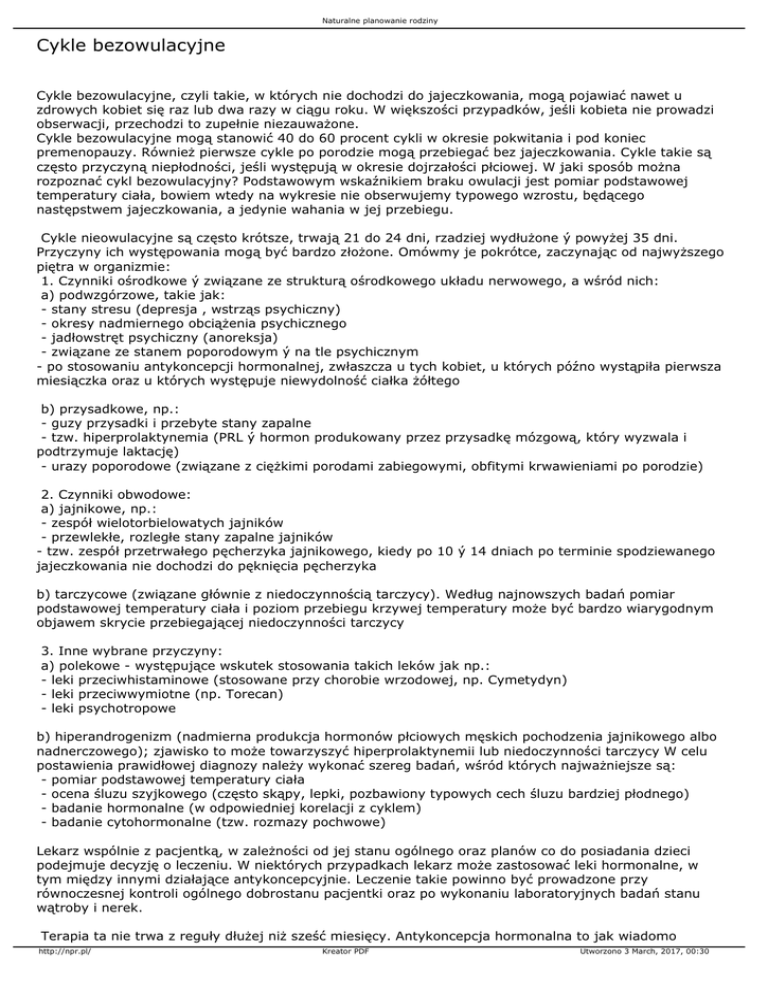 Naturalne planowanie rodziny Cykle bezowulacyjne Cykle bezowulacyjne, czyli takie, w których nie dochodzi do jajeczkowania, mogą pojawiać nawet u zdrowych kobiet się raz lub dwa razy w ciągu roku. W większości przypadków, jeśli kobieta nie prowadzi obserwacji, przechodzi to zupełnie niezauważone. Cykle bezowulacyjne mogą stanowić 40 do 60 procent cykli w okresie pokwitania i pod koniec premenopauzy. Również pierwsze cykle po porodzie mogą przebiegać bez jajeczkowania. Cykle takie są często przyczyną niepłodności, jeśli występują w okresie dojrzałości płciowej. W jaki sposób można rozpoznać cykl bezowulacyjny? Podstawowym wskaźnikiem braku owulacji jest pomiar podstawowej temperatury ciała, bowiem wtedy na wykresie nie obserwujemy typowego wzrostu, będącego następstwem jajeczkowania, a jedynie wahania w jej przebiegu. Cykle nieowulacyjne są często krótsze, trwają 21 do 24 dni, rzadziej wydłużone ý powyżej 35 dni. Przyczyny ich występowania mogą być bardzo złożone. Omówmy je pokrótce, zaczynając od najwyższego piętra w organizmie: 1. Czynniki ośrodkowe ý związane ze strukturą ośrodkowego układu nerwowego, a wśród nich: a) podwzgórzowe, takie jak: - stany stresu (depresja , wstrząs psychiczny) - okresy nadmiernego obciążenia psychicznego - jadłowstręt psychiczny (anoreksja) - związane ze stanem poporodowym ý na tle psychicznym - po stosowaniu antykoncepcji hormonalnej, zwłaszcza u tych kobiet, u których późno wystąpiła pierwsza miesiączka oraz u których występuje niewydolność ciałka żółtego b) przysadkowe, np.: - guzy przysadki i przebyte stany zapalne - tzw. hiperprolaktynemia (PRL ý hormon produkowany przez przysadkę mózgową, który wyzwala i podtrzymuje laktację) - urazy poporodowe (związane z ciężkimi porodami zabiegowymi, obfitymi krwawieniami po porodzie) 2. Czynniki obwodowe: a) jajnikowe, np.: - zespół wielotorbielowatych jajników - przewlekłe, rozległe stany zapalne jajników - tzw. zespół przetrwałego pęcherzyka jajnikowego, kiedy po 10 ý 14 dniach po terminie spodziewanego jajeczkowania nie dochodzi do pęknięcia pęcherzyka b) tarczycowe (związane głównie z niedoczynnością tarczycy). Według najnowszych badań pomiar podstawowej temperatury ciała i poziom przebiegu krzywej temperatury może być bardzo wiarygodnym objawem skrycie przebiegającej niedoczynności tarczycy 3. Inne wybrane przyczyny: a) polekowe - występujące wskutek stosowania takich leków jak np.: - leki przeciwhistaminowe (stosowane przy chorobie wrzodowej, np. Cymetydyn) - leki przeciwwymiotne (np. Torecan) - leki psychotropowe b) hiperandrogenizm (nadmierna produkcja hormonów płciowych męskich pochodzenia jajnikowego albo nadnerczowego); zjawisko to może towarzyszyć hiperprolaktynemii lub niedoczynności tarczycy W celu postawienia prawidłowej diagnozy należy wykonać szereg badań, wśród których najważniejsze są: - pomiar podstawowej temperatury ciała - ocena śluzu szyjkowego (często skąpy, lepki, pozbawiony typowych cech śluzu bardziej płodnego) - badanie hormonalne (w odpowiedniej korelacji z cyklem) - badanie cytohormonalne (tzw. rozmazy pochwowe) Lekarz wspólnie z pacjentką, w zależności od jej stanu ogólnego oraz planów co do posiadania dzieci podejmuje decyzję o leczeniu. W niektórych przypadkach lekarz może zastosować leki hormonalne, w tym między innymi działające antykoncepcyjnie. Leczenie takie powinno być prowadzone przy równoczesnej kontroli ogólnego dobrostanu pacjentki oraz po wykonaniu laboratoryjnych badań stanu wątroby i nerek. Terapia ta nie trwa z reguły dłużej niż sześć miesięcy. Antykoncepcja hormonalna to jak wiadomo http://npr.pl/ Kreator PDF Utworzono 3 March, 2017, 00:30 Naturalne planowanie rodziny syntetyczne hormony estrogenne (E) i progesteron (P). Na naszym rynku dostępnych jest wiele preparatów tego typu, które w zależności od składu i proporcji E do P mają różne właściwości. Częstymi efektami ubocznymi mogą być nudności, wymioty, przybytek wagi, łojotok, trądzik. Leki te są metabolizowane (przetwarzane) w wątrobie i nerkach, stąd konieczność weryfikacji ich działania w trakcie stosowania i po leczeniu. Warto podkreślić, że antykoncepcja zuboża organizm między innymi w witaminy z grupy B (B2, B6, B12), kwas foliowy, witaminę C i cynk. Po odstawieniu pigułek zaleca się więc suplementację witamin z grupy B oraz kwasu foliowego przez podawanie np.: - Essentiale forte - preparat naturalny z nienasyconymi kwasami tłuszczowymi i witaminami z grupy B - Zincas i Salfazin (wzbogacony dodatkowo w witaminę A i selen) - Folic (kwas foliowy) Należy podkreślić, że duża grupa przyczyn występowania cykli nieowulacyjnych leży w sferze psychicznej, co z reguły jest jednoznaczne z odwracalnością tego stanu i możliwością odblokowania owulacji po ustąpieniu czynnika stresogennego, bez potrzeby stosowania leków. Warto również zwrócić uwagę, że cykle bezowulacyjne często wcześniej mogą być poprzedzone tzw. krótką fazą ciałka żółtego (lutealną), to jest trwającym krócej niż 10 dni okresem skoku podstawowej temperatury ciała. Wskutek skrócenia fazy ciałka żółtego błona śluzowa macicy nie jest w pełni gotowa do zagnieżdżenia zapłodnionej komórki jajowej, w wyniku czego częściej występują poronienia. Istnieją też szczególne zalecenia dietetyczne dla tej grupy pacjentek. Korzystny wpływ ma stosowanie witaminy B6 i magnezu, zwłaszcza w przypadku współistniejącej hiperprolaktynemii, jak również dieta zalecana w zespole napięcia przedmiesiączkowego - a więc bogata w błonnik, wielonienasycone kwasy tłuszczowe, witaminy oraz mikroelementy. Ewa Ślizień-Kuczapska http://npr.pl/ Kreator PDF Utworzono 3 March, 2017, 00:30