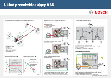 Układ przeciwblokujący ABS Rozmieszczenie elementów układu hamulcowego oraz układu ABS Ciśnienia hamowania w układzie hydraulicznym Obwody hydrauliczne systemu ABS Zwiększanie ciśnienia (położenie normalne): zawór wlotowy otwarty, zawór wylotowy zamknięty wysokie ciśnienie (zadane przez kierowcę) średnie ciśnienie niskie ciśnienie regulowane ciśnienie Utrzymywanie ciśnienia: zawór wlotowy zamknięty, zawór wylotowy zamknięty RL FR FL RR a – obwód hamulcowy 1, b – obwód hamulcowy 2 1. pompa hamulcowa 2. cylinderek hamulcowy 3. zespół hydrauliczny 4. zawory wlotowe 5. zawory wylotowe 6. elektryczna pompa zwrotna 7. akumulator ciśnienia 8. silnik pompy F – przód, R – tył, R – strona prawa, L – strona lewa 1. p edał hamulca z urządzeniem wspomagającym i pompą hamulcową 2. zespół hydrauliczny z zamontowanym sterownikiem 3. czujniki prędkości obrotowej kół 4. hamulec tarczowy z zaciskiem 5. lampka kontrolna ABS Obwód regulacyjny systemu ABS Elektroniczny sterownik Hamowanie bez systemu ABS Obniżanie ciśnienia: zawór wlotowy zamknięty, zawór wylotowy otwarty Hamowanie z systemem ABS obliczanie (poślizg rzeczywisty) regulacja (poślizg dopuszczalny) nadzór prędkość pojazdu zakres niestabilny ciśnienie hamowania osiąga maksymalną wartość Zespół hydrauliczny z zaworami elektromagnetycznymi prędkość koła (koło nie zablokowane) ciśnienie hamowania jest regulowane modulacja ciśnienia w hamulcach kół prędkość pojazdu prędkość koła (koło zablokowane) Czas Czas 1. czujnik prędkości obrotowej koła 2. cylinderek hamulcowy 3. zawór wlotowy 4. zespół hydrauliczny 5. pompa odprowadzająca 6. pompa hamulcowa 7. sterownik ABS 8. akumulator ciśnienia 9. zawór wylotowy generowanie ciśnienia w układzie hamulcowym 1. czujnik prędkości obrotowej koła 2. cylinderek hamulcowy 3. lampka kontrolna ABS 4. pedał hamulca z urządzeniem wspomagającym i pompą hamulcową z – wielkości zakłócające (np. stan nawierzchni) n – sygnał z czujnika prędkości obrotowej koła, F – siła hamowania. © 2012 Robert Bosch GmbH (AA/COM) ‒ 0119-1-1105-Pol