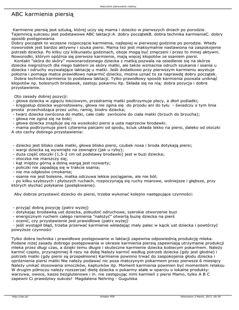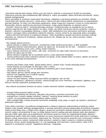 Naturalne planowanie rodziny ABC karmienia piersią Karmienie piersią jest sztuką, której uczy się mama i dziecko w pierwszych dniach po porodzie. Tajemnicą sukcesu jest podstawowe ABC laktacji:A. dobry początekB. dobra technika karmieniaC. dobry sposób postępowania Dobry początek to wczesne rozpoczęcie karmienia, najlepiej w pierwszej godzinie po porodzie. Wtedy noworodek jest bardzo aktywny i szuka piersi. Mama też jest maksymalnie nastawiona na zaspokojenie potrzeb dziecka. Po kilku czy kilkunastu godzinach, oboje mogą być zmęczeni i przez to mniej aktywni. Noworodki, którym opóźnia się pierwsze karmienie, mają więcej kłopotów ze ssaniem piersi. Kontakt "skóra do skóry" nowonarodzonego dziecka z matką pozwala na osiedlenie się na skórze dziecka niegroźnych dla niego bakterii ze skóry matki, ale także wzmacnia odruch szukania i ssania u dziecka i odruchy wyzwalające laktację u matki. Jeśli dodatkowo przy pierwszym karmieniu asystuje położna i pomaga matce prawidłowo nakarmić dziecko, można uznać to za naprawdę dobry początek. Dobra technika karmienia to podstawa laktacji. Tylko prawidłowy sposób karmienia pozwala uniknąć kłopotów np. bolesnych brodawek, zastoju pokarmu itp. Składa się na nią: dobra pozycja i dobre przystawienie. Oto zasady dobrej pozycji: - głowa dziecka w zgięciu łokciowym, przedramię matki podtrzymuje plecy, a dłoń pośladki; - kręgosłup dziecka wyprostowany, głowa nie zgina się do przodu ani do tyłu - świadczy o tym linia prosta przechodząca przez ucho, ramię, biodro dziecka; - twarz dziecka zwrócona do matki, całe ciało zwrócone do ciała matki (brzuch do brzucha); - głowa nie zgina się na boki; - głowa dziecka znajduje się na wysokości piersi a usta naprzeciw brodawki. - mama podtrzymuje pierś czterema palcami od spodu, kciuk układa lekko na piersi, daleko od otoczki A oto cechy dobrego przystawienia: - dziecko jest blisko ciała matki, głowa blisko piersi, czubek nosa i broda dotykają piersi; - wargi dziecka są wywinięte na zewnątrz (jak u ryby); - duża część otoczki (1,5-2 cm od podstawy brodawki) jest w buzi dziecka; - otoczka nie marszczy się; - kąt między górną a dolną wargą jest rozwarty; - policzki nie zapadają się w trakcie ssania; - nie ma odgłosów cmokania; - ssanie nie jest bolesne, matka odczuwa lekkie pociąganie, ale nie ból; - po kilku szybszych i płytszych ruchach, rozpoczynają się ruchy miarowe, wolniejsze i głębsze, przy których słychać połykanie (postękiwanie). Aby dobrze przystawić dziecko do piersi, trzeba wykonać kolejno następujące czynności: - przyjąć dobrą pozycję (patrz wyżej) - dotykając brodawką ust dziecka, pobudzić odruchowe, szerokie otworzenie buzi - energicznym ruchem całego ramienia "nałożyć" otwartą buzię dziecka na pierś - ocenić, czy przystawienie jest prawidłowe (patrz wyżej) - jeśli wystąpił błąd, trzeba przerwać karmienie wkładając mały palec w kącik ust dziecka i powtórzyć powyższe czynności Tylko dobra technika i prawidłowe postępowanie w laktacji zapewnia odpowiednią produkcję mleka. Podane niżej zasady dobrego postępowania w okresie karmienia piersią zapewniają utrzymanie produkcji mleka przez długi czas, a dzięki temu długie i skuteczne karmienie dziecka kobiecym pokarmem. Należy karmić często, przynajmniej 8 razy na dobę Należy karmić według potrzeb dziecka (gdy jest głodne) i potrzeb matki (gdy piersi są przepełnione) Karmienie powinno trwać do zaspokojenia głodu dziecka i opróżnienia piersi matki Nie należy podawać nic poza matczynym pokarmem przez pierwsze 6 miesięcy Należy unikać stosowania smoczków, kapturków itp. Moment karmienia powinien być momentem relaksu W drugim półroczu należy rozszerzać dietę dziecka o pokarmy stałe w oparciu o lokalne produkty: warzywa, owoce, kasze bezglutenowe i in. nie zastępując nimi karmień z piersi Mamo, tylko A B C zapewni Ci prawdziwy sukces! Magdalena Nehring - Gugulska http://npr.pl/ Kreator PDF Utworzono 3 March, 2017, 00:30