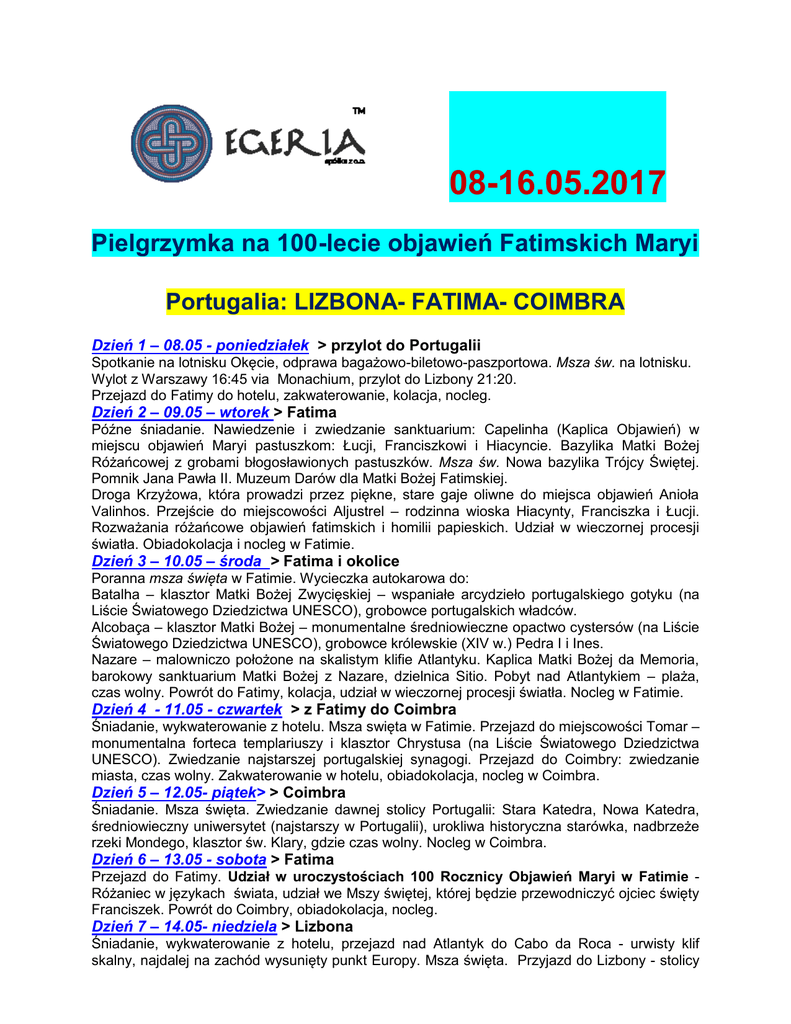 08-16.05.2017 Pielgrzymka na 100-lecie objawień Fatimskich Maryi Portugalia: LIZBONA- FATIMA- COIMBRA Dzień 1 – 08.05 - poniedziałek > przylot do Portugalii Spotkanie na lotnisku Okęcie, odprawa bagażowo-biletowo-paszportowa. Msza św. na lotnisku. Wylot z Warszawy 16:45 via Monachium, przylot do Lizbony 21:20. Przejazd do Fatimy do hotelu, zakwaterowanie, kolacja, nocleg. Dzień 2 – 09.05 – wtorek > Fatima Późne śniadanie. Nawiedzenie i zwiedzanie sanktuarium: Capelinha (Kaplica Objawień) w miejscu objawień Maryi pastuszkom: Łucji, Franciszkowi i Hiacyncie. Bazylika Matki Bożej Różańcowej z grobami błogosławionych pastuszków. Msza św. Nowa bazylika Trójcy Świętej. Pomnik Jana Pawła II. Muzeum Darów dla Matki Bożej Fatimskiej. Droga Krzyżowa, która prowadzi przez piękne, stare gaje oliwne do miejsca objawień Anioła Valinhos. Przejście do miejscowości Aljustrel – rodzinna wioska Hiacynty, Franciszka i Łucji. Rozważania różańcowe objawień fatimskich i homilii papieskich. Udział w wieczornej procesji światła. Obiadokolacja i nocleg w Fatimie. Dzień 3 – 10.05 – środa > Fatima i okolice Poranna msza święta w Fatimie. Wycieczka autokarowa do: Batalha – klasztor Matki Bożej Zwycięskiej – wspaniałe arcydzieło portugalskiego gotyku (na Liście Światowego Dziedzictwa UNESCO), grobowce portugalskich władców. Alcobaça – klasztor Matki Bożej – monumentalne średniowieczne opactwo cystersów (na Liście Światowego Dziedzictwa UNESCO), grobowce królewskie (XIV w.) Pedra I i Ines. Nazare – malowniczo położone na skalistym klifie Atlantyku. Kaplica Matki Bożej da Memoria, barokowy sanktuarium Matki Bożej z Nazare, dzielnica Sitio. Pobyt nad Atlantykiem – plaża, czas wolny. Powrót do Fatimy, kolacja, udział w wieczornej procesji światła. Nocleg w Fatimie. Dzień 4 - 11.05 - czwartek > z Fatimy do Coimbra Śniadanie, wykwaterowanie z hotelu. Msza swięta w Fatimie. Przejazd do miejscowości Tomar – monumentalna forteca templariuszy i klasztor Chrystusa (na Liście Światowego Dziedzictwa UNESCO). Zwiedzanie najstarszej portugalskiej synagogi. Przejazd do Coimbry: zwiedzanie miasta, czas wolny. Zakwaterowanie w hotelu, obiadokolacja, nocleg w Coimbra. Dzień 5 – 12.05- piątek> > Coimbra Śniadanie. Msza święta. Zwiedzanie dawnej stolicy Portugalii: Stara Katedra, Nowa Katedra, średniowieczny uniwersytet (najstarszy w Portugalii), urokliwa historyczna starówka, nadbrzeże rzeki Mondego, klasztor św. Klary, gdzie czas wolny. Nocleg w Coimbra. Dzień 6 – 13.05 - sobota > Fatima Przejazd do Fatimy. Udział w uroczystościach 100 Rocznicy Objawień Maryi w Fatimie Różaniec w językach świata, udział we Mszy świętej, której będzie przewodniczyć ojciec święty Franciszek. Powrót do Coimbry, obiadokolacja, nocleg. Dzień 7 – 14.05- niedziela > Lizbona Śniadanie, wykwaterowanie z hotelu, przejazd nad Atlantyk do Cabo da Roca - urwisty klif skalny, najdalej na zachód wysunięty punkt Europy. Msza święta. Przyjazd do Lizbony - stolicy Portugalii. Zwiedzanie: Wieża Belem nad Tybrem, Pomnik Odkrywców. Wspaniały gotyckorenesansowy klasztor Hieronimitów (na Liście Światowego Dziedzictwa UNESCO): grobowce królewskie, odkrywców i artystów. Czas wolny. Przejazd do hotelu, obiadokolacja, nocleg. Dzień 8 – 15.05- poniedziałek > Lizbona Śniadanie, ciąg dalszy zwiedzania Lizbony: Średniowieczna katedra Se; kościół św. Antoniego Padewskiego - wzniesiony w miejscu jego urodzenia i domu rodzinnego, kościół dominikanów, Historyczne dzielnice: Baixa, Rossio, starówka Alfama, Bairro - panorama. Powrót do hotelu, obiadokolacja, nocleg. Dzień 9 – 16.05- wtorek Przejazd na lotnisko, odprawa bagażowa, wylot z Lizbony o 07:15 - via Franfurt - przylot do Warszawy na 13:40. WARUNKI organizacyjno-programowe i podstawowe informacje Koszt pielgrzymki: 1550 zł i 590 euro – gwarantowany i całkowity wpłata przy zapisie: 1000 zł i 300 euro - na konto lub w biurze „Egerii”, druga wpłata: 550 zł i 250 euro - na konto lub w biurze „Egerii” wpłata na miejscu u pilota w Portugalii - 40 euro Wpłaty na: „Egeria”, 20-109 Lublin, ul. Królewska 9 - dopisek: „Fatima 05-2017” konto na wpłaty złotówkowe: 49 1910 1048 2303 0431 5791 0004 konto na wpłaty euro: 06 1910 1048 2303 0431 5791 0002 (kod SWIFT: DEUTPLPX) Koszt pielgrzymki obejmuje: Przeloty na trasie Warszawa - Lizbona - Warszawa. Hotele kat.***, pokoje 2 i 3 os. z łazienkami. Dwa posiłki dziennie - śniadanie i obiadokolacja ( cena nie obejmuje napojów do posiłków). Autokar z klimatyzacją. Wstępy i inne opłaty związane z programem. Przewodnik polski, przewodnicy lokalni, obsługa biura turystycznego. Ubezpieczenie turystyczne w okresie trwania pielgrzymki (KL, OC, NNW, bagaż). Uwagi: * Zapisy według kolejności zgłoszeń i wniesionej przedpłaty (ilość miejsc limitowana) * Dopłata na życzenie do pokoju jednoosobowego wynosi +150 euro. * Każdego dnia celebrowana będzie msza św. * Kolejność realizacji programu może ulec modyfikacjom z powodu zewnętrznych okoliczności. * Przed pielgrzymką odbędzie w się spotkanie organizacyjno-informacyjne. * Możliwość zawarcia dodatkowego ubezpieczenia od chorób przewlekłych i kosztów rezygnacji. Dokumenty: dowód osobisty lub paszport - ważne co najmniej pół roku od daty rozpoczęcia pielgrzymki. Informacje, zapisy, kontakt: „Egeria”, 20-109 Lublin, ul. Królewska 9, tel. 81 5324617, 690298759