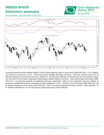 INDEKS WIG20 Komentarz posesyjny praca autorska – Jacek Borawski, 8 maja 2014 Relative Strength Index (44.2697) 65 60 55 50 45 40 35 30 MACD (-7.15608) 30 20 10 0 -10 -20 -30 -40 WIG20 (2,406.54, 2,413.31, 2,384.50, 2,403.89, +14.4600) 2540 2530 2520 2510 2500 2490 2480 2470 2460 2450 2440 2430 2420 2410 2400 2390 2380 2370 2360 2350 2340 2330 2320 2310 2300 2290 2280 2270 50000 x1000 9 16 23 30 7 2014 13 20 27 3 February 10 17 24 3 March 10 17 24 31 7 April 14 22 28 5 May 12 19 Czwartek przyniósł wzrost indeksu Wig20 o 0,61%. Nadal najbliższy opór to okno bessy 2464-2467 pkt. z 11 IV. Najbliższe wsparcie to minimum z 25 III - wzrostowej świecy Białego Marubozu Otwarcia - 2367 pkt. Podczas sesji 14 XI na wykresie pojawiła się wzrostowa formacja „spotkania”. Ruch poniżej 2299 pkt. zneutralizuje ją i jest to następne wsparcie. Na sesji 3 III miał miejsce największy jednosesyjny spadek indeksu o IX 2011 r. Sesji towarzyszyło okno bessy 24602475 pkt. a na wykresie pojawiła się spadkowa formacja „Kopnięcia”. Okno to jest następnym oporem. Kolejne to maksimum spadkowej formacji „wewnętrznej trójki spadkowej”. z 26 II - 2526 pkt. oraz okno bessy 2595-2597 pkt. z 26 XI. Kolejne wsparcie to okno hossy 2290-2310 pkt. z 10 IX oraz dno wzrostowej formacji „Harami” 2201-2210 pkt. z 6 IX. Średnie wykładnicze z 15 i 45 sesji tworzą wąską strefę oporu 2422-2428 pkt. Dom Maklerski Banku BPS S.A., ul. Grzybowska 81, 00-844 Warszawa, infolinia: 801 321 456, www.dmbps.pl, e-mail: [email protected] INDEKS WIG20 Komentarz posesyjny praca autorska – Jacek Borawski, 8 maja 2014 Dom Maklerski Banku BPS SA ul. Grzybowska 81 00-844 Warszawa, tel.: +48 22 53 95 555, fax.: +48 22 53 95 556 www.dmbps.pl [email protected] Departament Analiz: Marcin Stebakow, MPW – handel, przemysł spożywczy Dyrektor Departamentu Analiz [email protected] tel.: (22) 53 95 548 Kamil Artyszuk – obligacje [email protected] tel.: (22) 53 95 535 Marta Czajkowska-Bałdyga – banki [email protected] tel.: (22) 53 95 527 Tomasz Kania – usługi finansowe, deweloperzy [email protected] tel.: (22) 53 95 542 Marek Straszak, MPW, DI – budownictwo, materiały budowlane [email protected] tel.: (22) 53 95 540 Marcin Nowak, MPW [email protected] tel.: (22) 53 95 527 Analitycy techniczni: Jacek Borawski, Sławomir Rudaś Departament Sprzedaży Detalicznej: Departament Operacji: Departament Sprzedaży Instytucjonalnej: Piotr Majka, MPW Wiceprezes Zarządu [email protected] Tel.: (22) 53 95 520 Krzysztof Solus, MPW Zastępca Dyrektora Departamentu Sprzedaży Instytucjonalnej [email protected] tel.: (22) 53 95 55 Bogdan Dzimira, MPW, Doradca Inwestycyjny [email protected] Tel.: (22) 53 95 523 Jan Woźniak, MPW [email protected] tel.: (22) 53 95 536 Artur Kobos, MPW [email protected] Tel.: (22) 53 95 511 Bartosz Szaniawski [email protected] tel.: (22) 53 95 525 Mirosław Sobczak Dyrektor Departamentu Sprzedaży Detalicznej [email protected] tel.: (22) 53 95 553 Beata Zbrzezna, MPW [email protected] tel.: (22) 53 95 544 Lech Kucharski, MPW [email protected] tel.: (22) 53 95 522 Wyjaśnienia dotyczące stosowanej terminologii fachowej i wskaźników: MACD (Moving Average Convergence / Divergence) – wskaźnik badający zbieżność i rozbieżność średnich ruchomych; jest różnicą wartości długoterminowej i krótkoterminowej średniej wykładniczej; wykorzystywany do badania sygnałów kupna i sprzedaży akcji RSI (Relative Strength Index) – wskaźnik siły względnej; oscylator określający siłę trendu Opracowanie wyraża wiedzę oraz poglądy jego autorów według stanu na dzień sporządzenia niniejszego opracowania. Materiał został sporządzony z zachowaniem należytej staranności i rzetelności przy zachowaniu zasad metodologicznej poprawności na podstawie ogólnodostępnych informacji, w dniu publikacji opracowania, pozyskanych ze źródeł wiarygodnych dla Domu Maklerskiego Banku BPS S.A. Dom Maklerski Banku BPS S.A. nie gwarantuje ich kompletności i dokładności. Organem sprawującym nadzór nad działalnością Domu Maklerskiego Banku BPS S.A. jest Komisja Nadzoru Finansowego z siedzibą w Warszawie, przy Placu Powstańców Warszawy 1. Informacje zawarte w niniejszym raporcie nie stanowią rekomendacji w rozumieniu Rozporządzenia Ministra Finansów z 19 października 2005 roku w sprawie informacji stanowiących rekomendacje dotyczące instrumentów finansowych, ich emitentów lub wystawców (Dz. U. z 19 października 2005 r. Nr 206, poz. 1715). DM Banku BPS SA nie ponosi odpowiedzialności za decyzje inwestycyjne podjęte na podstawie niniejszego opracowania ani za szkody poniesione w wyniku tych decyzji inwestycyjnych. Powielanie bądź publikowanie w jakiejkolwiek formie niniejszego opracowania, lub jego części, oraz zwartych w nim zaleceń, oraz wykorzystywanie materiału do własnych opracowań celem publikacji, bez pisemnej zgody DM Banku BPS S.A. jest zabronione. Niniejsze opracowanie stanowi publikację handlową i jest prawnie chronione zgodnie z Ustawą z 4 lutego 1994 r. o prawie autorskim i prawach pokrewnych (Dz. U. 1994 nr 24 poz. 83 z późn. zm.). Jest prawdopodobne, iż DM Banku BPS S.A. świadczył, świadczy lub będzie świadczył usługi na rzecz przedsiębiorców i innych podmiotów wymienionych w niniejszym opracowaniu. DM Banku BPS S.A., jego akcjonariusze i pracownicy mogą posiadać długie lub krótkie pozycje w akcjach emitentów lub innych instrumentach finansowych powiązanych z akcjami emitentów wymienionych w opracowaniu. DM Banku BPS S.A. pełni funkcję animatora emitenta dla następujących spółek: Alterco, B3System, EMC Instytut Medyczny, Gant. DM Banku BPS S.A. pełni funkcję animatora rynku dla następujących spółek: Alterco, B3System, EMC Instytut Medyczny, Gant, KGHM, Pekao, Polnord. Dom Maklerski Banku BPS S.A., ul. Grzybowska 81, 00-844 Warszawa, infolinia: 801 321 456, www.dmbps.pl, e-mail: [email protected]