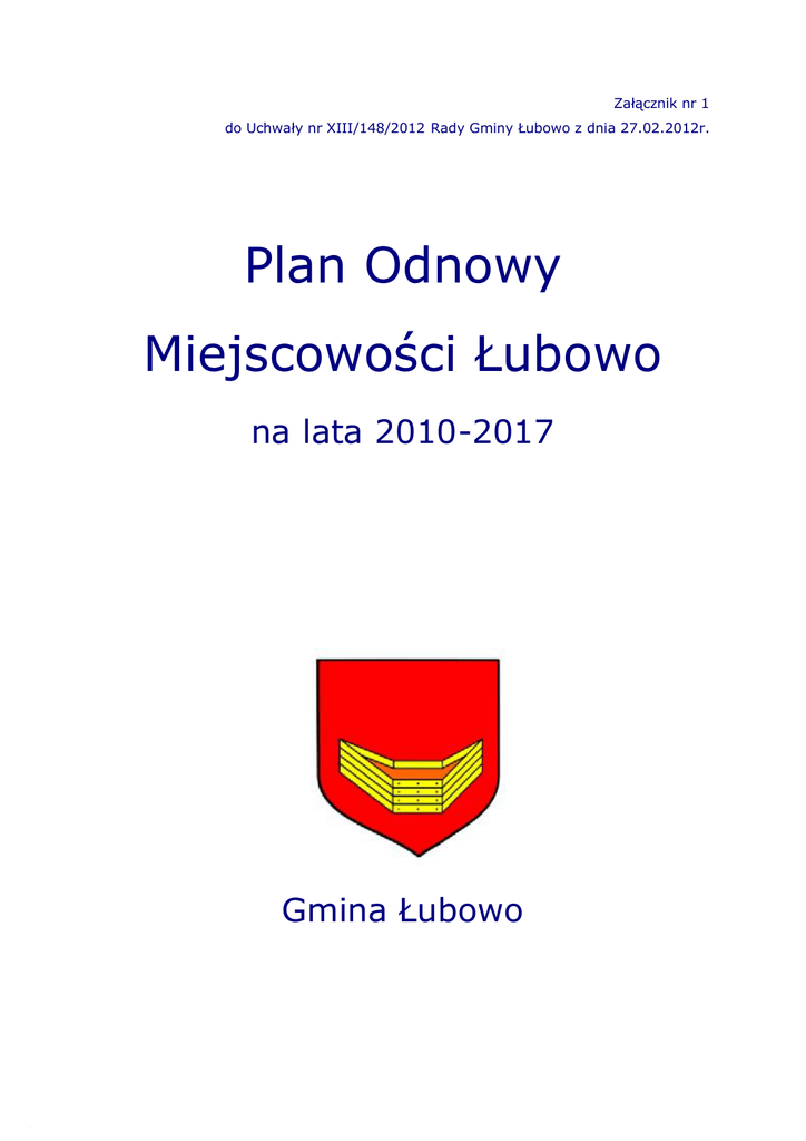 Załącznik nr 1 do Uchwały nr XIII/148/2012 Rady Gminy Łubowo z dnia 27.02.2012r. Plan Odnowy Miejscowości Łubowo na lata 2010-2017 Gmina Łubowo Plan Odnowy Miejscowości Łubowo 2010 – 2017 Wstęp Rozwój i odnowa obszarów wiejskich to jedno z kluczowych wyzwań, jakie stoją przed Polską w okresie integracji z Unią Europejską. Zasadniczym jej celem jest wzmocnienie działań służących zmniejszaniu istniejących dysproporcji i różnic w poziomie rozwoju obszarów wiejskich w stosunku do terenów miejskich. Plan Odnowy Miejscowości jest jednym z najważniejszych elementów odnowy wsi, jej rozwoju oraz poprawy warunków pracy i życia mieszkańców. Sporządzenie i uchwalenie takiego dokumentu stanowi niezbędny warunek przy aplikowaniu o środki finansowe w ramach „Programu Rozwoju Obszarów Wiejskich 2007-2013” działanie „Odnowa i rozwój wsi”. Plan Odnowy Miejscowości Łubowo przedstawia sytuację społeczno-ekonomiczną miejscowości, formułuje cele i zawiera opis strategii zmierzającej do osiągnięcia rozwoju społecznego, gospodarczego. Szacuje spodziewane efekty planowanych interwencji i wpływ na przebieg procesów rozwojowych, wskazuje kierunki zaangażowania środków funduszy strukturalnych i środków własnych Gminy Łubowo. W poniższym opracowaniu, zgodnie z Rozporządzeniem Ministra Rolnictwa i Rozwoju Wsi z dnia 14 lutego 2008 roku w sprawie szczegółowych warunków i trybu przyznawania pomocy finansowej w ramach działania „Odnowa i rozwój wsi” objętego Programem Rozwoju Obszarów Wiejskich na lata 2007 -2013 (Dz.U. Nr 38 poz. 220 ze zmianami) zawarto charakterystykę miejscowości, inwentaryzację zasobów służącą odnowie miejscowości, analizę SWOT, czyli mocne i słabe strony miejscowości oraz opis planowanych zadań inwestycyjnych i przedsięwzięć aktywizujących społeczność. Niniejszy Plan Odnowy zawiera również opis i charakterystykę obszaru o szczególnym znaczeniu dla zaspokojenia potrzeb mieszkańców, sprzyjającego nawiązywaniu kontaktów społecznych, ze względu na położenie oraz cechy funkcjonalno – przestrzenne. Dokument został przygotowany na podstawie następujących dokumentów: 1. Strategia Rozwoju Gminy Łubowo 2. Plan Rozwoju Lokalnego Gminy Łubowo 3. PROW – Uzupełnienie 4. Rozporządzenie Ministra Rolnictwa i Rozwoju Wsi z dnia 14 lutego 2008 roku w sprawie szczegółowych warunków i trybu przyznawania pomocy finansowej w ramach działania „Odnowa i rozwój wsi” objętego programem Rozwoju Obszarów Wiejskich na lata 2007 -2013 (Dz.U. Nr 38 poz. 220 ze zmianami) 5. Studium Uwarunkowań i Kierunków Zagospodarowania Przestrzennego Gminy oraz innych wymienionych w „żródłach”. We wnioskach końcowych, służących opracowaniu Planu wzięto również pod uwagę wyniki debat strategicznego, strategicznych w których organizowanych brali udział metodą reprezentanci aktywnego środowisk, planowania społecznych, biznesowych, gospodarczych, samorządowych itp. Gmina Łubowo 2012 2 Plan Odnowy Miejscowości Łubowo 2010 – 2017 Obszar i czas realizacji Planu Odnowy Miejscowości Łubowo Plan obejmuje terytorialnie i administracyjnie całą miejscowość Łubowo, która wchodzi w skład Gminy Łubowo a ta w skład powiatu gnieźnieńskiego, który z kolei leży w województwie wielkopolskim. Plan Odnowy Miejscowości Łubowo został zakreślony na lata 2010 – 2017. Tak zdefiniowany czas realizacji obejmuje ramy czasowe Programu Rozwoju Obszarów Wiejskich 2007 – 2013. Pozwala to na precyzyjne określenie zarówno harmonogramu realizacji zadań ujętych w Planie oraz koszt ich realizacji a jednocześnie wyznacza kierunek dla tworzenia kolejnych dokumentów strategicznych, w następnym okresie programowania. Przyjęcie dłuższego okresu realizacji mogłoby negatywnie wpłynąć na dokładność szacunków kosztów finansowych. Zadania proponowane w planie są określeniem potrzeb zgłaszanych przez społeczność. Plan Rozwoju Lokalnego 2010-2017 będzie służył jako punkt odniesienia dla działań o charakterze rozwojowym, podejmowanych z zasobów środków własnych, jak również pozwoli określić wysokość interwencji z funduszy unijnych w ramach „Programu Rozwoju Obszarów Wiejskich 2007-2013” działanie „Odnowa i rozwój wsi”. Plan ma charakter otwarty, stąd istnieje możliwość dopisywania zadań, które w opinii społeczności miejscowości Łubowo, wpłyną korzystnie na rozwój wsi i przyczynią się do zrównoważonego rozwoju obszarów wiejskich. Gmina Łubowo 2012 3 Plan Odnowy Miejscowości Łubowo 2010 – 2017 Charakterystyka miejscowości Łubowo Położenie administracyjne Gmina Łubowo po reformie administracyjnej od stycznia 1999 wchodzi w obszar powiatu gnieźnieńskiego, który obejmuje powierzchnię 125.000ha i jest zamieszkiwany przez 141.000 osób. W skali województwa wielkopolskiego pod względem obszaru powiat zajmuje 6 miejsce a pod względem liczby osób 4 miejsce. Gmina Łubowo jest gminą wiejską o powierzchni ok 11340ha i zamieszkiwaną przez ponad 5000 osób. Średnio przypada 40 osób na km2. W danych geodezyjnych figuruje obręb Łubowo który zajmuje obszar 933,9776ha. Przeważają tereny rolne w klasach III, IV oraz V. Ogólnie można przyjąć, że grunty orne zajmują 75,6% powierzchni obrębu. Wieś Łubowo liczy aktualnie 990 stałych mieszkańców (03.2010). Położenie Łubowa w gminie przedstawia poniższa mapka (kolorem ciemniejszym zaznaczono wsie o gęstszym zaludnieniu). Gmina Łubowo 2012 4 Plan Odnowy Miejscowości Łubowo 2010 – 2017 Rys historyczny Łodzia żółta czy złota... jakby po krwi nieprzyjacielskiej pływająca, bez żaglów i masztu, coś na kształt barki, na głębokich jednak rzek przebycie zdolna. Tak pisał w Herbarzu o herbie Łubowa Kasper Niesiecki (1682-1744) Łubowo to jedna z najpiękniejszych wsi w Powiecie Gniezno. Należy do tych gmin, które mają szczególną przeszłość. Tutaj bowi