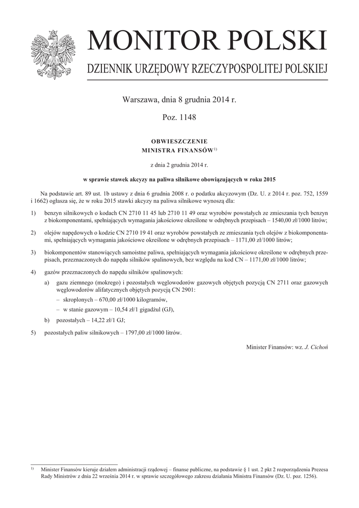 MONITOR POLSKI DZIENNIK URZĘDOWY RZECZYPOSPOLITEJ POLSKIEJ Warszawa, dnia 8 grudnia 2014 r. Poz. 1148 OBWIESZCZENIE MINISTRA FINANSÓW 1) z dnia 2 grudnia 2014 r. w sprawie stawek akcyzy na paliwa silnikowe obowiązujących w roku 2015 Na podstawie art. 89 ust. 1b ustawy z dnia 6 grudnia 2008 r. o podatku akcyzowym (Dz. U. z 2014 r. poz. 752, 1559 i 1662) ogłasza się, że w roku 2015 stawki akcyzy na paliwa silnikowe wynoszą dla: 1) benzyn silnikowych o kodach CN 2710 11 45 lub 2710 11 49 oraz wyrobów powstałych ze zmieszania tych benzyn z biokomponentami, spełniających wymagania jakościowe określone w odrębnych przepisach – 1540,00 zł/1000 litrów; 2) olejów napędowych o kodzie CN 2710 19 41 oraz wyrobów powstałych ze zmieszania tych olejów z biokomponentami, spełniających wymagania jakościowe określone w odrębnych przepisach – 1171,00 zł/1000 litrów; 3) biokomponentów stanowiących samoistne paliwa, spełniających wymagania jakościowe określone w odrębnych przepisach, przeznaczonych do napędu silników spalinowych, bez względu na kod CN – 1171,00 zł/1000 litrów; 4) gazów przeznaczonych do napędu silników spalinowych: a) gazu ziemnego (mokrego) i pozostałych węglowodorów gazowych objętych pozycją CN 2711 oraz gazowych węglowodorów alifatycznych objętych pozycją CN 2901: – skroplonych – 670,00 zł/1000 kilogramów, – w stanie gazowym – 10,54 zł/1 gigadżul (GJ), b) pozostałych – 14,22 zł/1 GJ; 5) pozostałych paliw silnikowych – 1797,00 zł/1000 litrów. Minister Finansów: wz. J. Cichoń 1) Minister Finansów kieruje działem administracji rządowej – finanse publiczne, na podstawie § 1 ust. 2 pkt 2 rozporządzenia Prezesa Rady Ministrów z dnia 22 września 2014 r. w sprawie szczegółowego zakresu działania Ministra Finansów (Dz. U. poz. 1256).