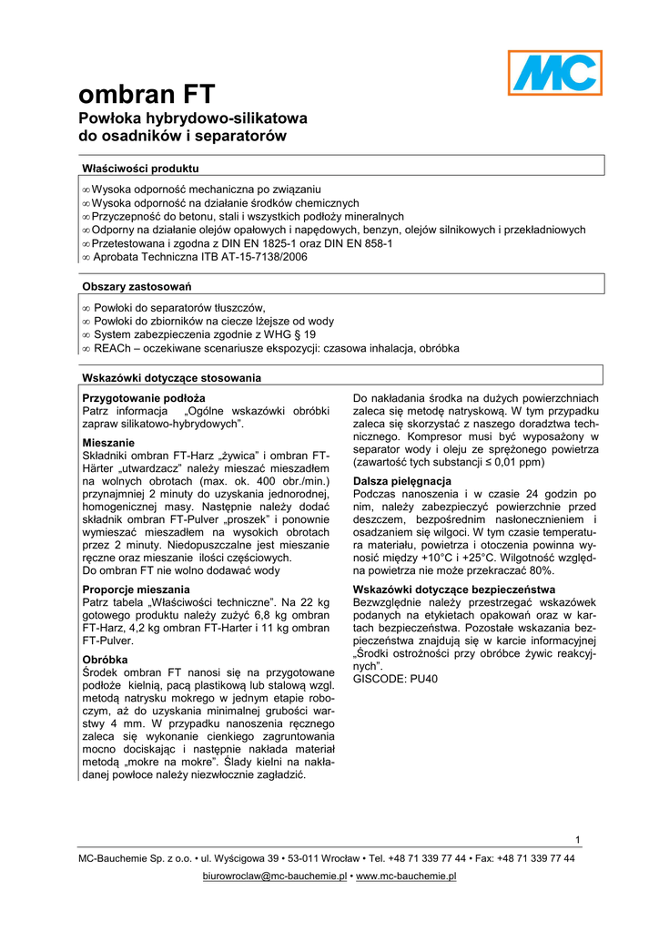 ombran FT Powłoka hybrydowo-silikatowa do osadników i separatorów Właściwości produktu • • • • • • Wysoka odporność mechaniczna po związaniu Wysoka odporność na działanie środków chemicznych Przyczepność do betonu, stali i wszystkich podłoży mineralnych Odporny na działanie olejów opałowych i napędowych, benzyn, olejów silnikowych i przekładniowych Przetestowana i zgodna z DIN EN 1825-1 oraz DIN EN 858-1 Aprobata Techniczna ITB AT-15-7138/2006 Obszary zastosowań • • • • Powłoki do separatorów tłuszczów, Powłoki do zbiorników na ciecze lżejsze od wody System zabezpieczenia zgodnie z WHG § 19 REACh – oczekiwane scenariusze ekspozycji: czasowa inhalacja, obróbka Wskazówki dotyczące stosowania Przygotowanie podłoża Patrz informacja „Ogólne wskazówki obróbki zapraw silikatowo-hybrydowych”. Mieszanie Składniki ombran FT-Harz „żywica” i ombran FTHärter „utwardzacz” należy mieszać mieszadłem na wolnych obrotach (max. ok. 400 obr./min.) przynajmniej 2 minuty do uzyskania jednorodnej, homogenicznej masy. Następnie należy dodać składnik ombran FT-Pulver „proszek” i ponownie wymieszać mieszadłem na wysokich obrotach przez 2 minuty. Niedopuszczalne jest mieszanie ręczne oraz mieszanie ilości częściowych. Do ombran FT nie wolno dodawać wody Proporcje mieszania Patrz tabela „Właściwości techniczne”. Na 22 kg gotowego produktu należy zużyć 6,8 kg ombran FT-Harz, 4,2 kg ombran FT-Harter i 11 kg ombran FT-Pulver. Obróbka Środek ombran FT nanosi się na przygotowane podłoże kielnią, pacą plastikową lub stalową wzgl. metodą natrysku mokrego w jednym etapie roboczym, aż do uzyskania minimalnej grubości warstwy 4 mm. W przypadku nanoszenia ręcznego zaleca się wykonanie cienkiego zagruntowania mocno dociskając i następnie nakłada materiał metodą „mokre na mokre”. Ślady kielni na nakładanej powłoce należy niezwłocznie zagładzić. Do nakładania środka na dużych powierzchniach zaleca się metodę natryskową. W tym przypadku zaleca się skorzystać z naszego doradztwa technicznego. Kompresor musi być wyposażony w separator wody i oleju ze sprężonego powietrza (zawartość tych substancji ≤ 0,01 ppm) Dalsza pielęgnacja Podczas nanoszenia i w czasie 24 godzin po nim, należy zabezpieczyć powierzchnie przed deszczem, bezpośrednim nasłonecznieniem i osadzaniem się wilgoci. W tym czasie temperatura materiału, powietrza i otoczenia powinna wynosić między +10°C i +25°C. Wilgotność względna powietrza nie może przekraczać 80%. Wskazówki dotyczące bezpieczeństwa Bezwzględnie należy przestrzegać wskazówek podanych na etykietach opakowań oraz w kartach bezpieczeństwa. Pozostałe wskazania bezpieczeństwa znajdują się w karcie informacyjnej „Środki ostrożności przy obróbce żywic reakcyjnych”. GISCODE: PU40 1 MC-Bauchemie Sp. z o.o. • ul. Wyścigowa 39 • 53-011 Wrocław • Tel. +48 71 339 77 44 • Fax: +48 71 339 77 44 [email protected] • www.mc-bauchemie.pl Właściwości techniczne ombran FT Parametr Jednostka Wartość* Uwagi Proporcje mieszania wagowo 30,9 19,1 50,0 ombran FT-Harz (żywica) ombran FT-Härter (utwardzacz) ombran FT-Pulver Czas obróbki min. ok. 30 Warunki stosowania °C K % +10 do +25 3 max 80 temp powietrza, podłoża i materiału punkt rosy wilgotność względna powietrza Zużycie** kg/m²/mm ok. 1,45 gotowa mieszanina Grubość powłoki mm ok. 4 maksymalna powłoka jednej warstwy roboczej (sucha) Gęstość objętościowa zaprawy kg/l ok. 1,45 Wytrzymałość na ściskanie N/mm² ok. 25,0 po 1 dniu Wytrzymałość na zginanie przy rozciąganiu N/mm² ok. 14,0 po 7 dniach Cechy produktu ombran FT Kolor Czarny Środki do czyszczenia narzędzi MC-Reinigungsmittel U Dostawa Kanister 6,8 kg (żywica), kanister 4,2 kg (utwardzacz), wiadro 11 kg (proszek) Składowanie Szczelnie zamknięte oryginalne opakowania mogą być składowane w suchych pomieszczeniach przez co najmniej jeden rok w temperaturach między + 5°C i + 25°C. Te same warunki dotyczą transportu. Trwałość Ombran FT-Harz wynosi 6 miesięcy. Utylizacja opakowań Należy całkowicie opróżniać opakowania. Dodatkowe informacje znajdują się w broszurce informacyjnej „System utylizacji pustych opakowań opracowany przez firmę MC”, którą na Państwa życzenie chętnie wyślemy. * Podane parametry są podane dla temperatury +23°C i 50% wilgotności względnej powietrza. ** Zużycie zależy od szorstkości i temperatury podłoża oraz od temperatury składowania i obróbki. W celu określenia zużycia w danym obiekcie zalecamy wykonanie uprzednich prób. Uwaga: Wszelkie informacje zawarte w niniejszej karcie oparte są na naszym doświadczeniu i najlepszej wiedzy, jednakże nie mogą być traktowane jako prawnie wiążące. Należy bezwzględnie każdorazowo stosować się do prawodawstwa miejscowego, w zakresie przeznaczenia oraz zastosowania w obiektach budowlanych. Przy spełnieniu powyższych wymogów odpowiadamy za poprawność przekazanych informacji w ramach naszych Ogólnych Warunków Sprzedaży, Dostaw i Płatności. Wszelkie doradztwo ze strony naszych Współpracowników, odbiegające od treści naszych kart technicznych, jest wiążące jedynie w przypadku pisemnego ich potwierdzenia. W każdym przypadku należy stosować się do ogólnie obowiązujących zasad sztuki budowlanej. Wydanie 07/2013. Niniejszy druk został aktualizowany pod względem technicznym. Unieważnia się dotychczasowe wydania i nie wolno ich stosować. W przypadku wydania nowej karty, zaktualizowanej pod względem technicznym, wydanie niniejsze traci ważność. 2 MC-Bauchemie Sp. z o.o. • ul. Wyścigowa 39 • 53-011 Wrocław • Tel. +48 71 339 77 44 • Fax: +48 71 339 77 44 [email protected] • www.mc-bauchemie.pl