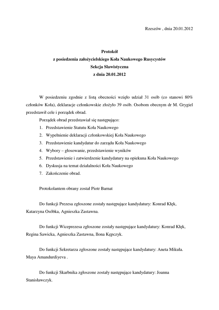 Rzeszów , dnia 20.01.2012 Protokół z posiedzenia założycielskiego Koła Naukowego Rusycystów Sekcja Slawistyczna z dnia 20.01.2012 W posiedzeniu zgodnie z listą obecności wzięło udział 31 osób (co stanowi 80% członków Koła), deklaracje członkowskie złożyło 39 osób. Osobom obecnym dr M. Grygiel przedstawił cele i porządek obrad. Porządek obrad przedstawiał się następująco: 1. Przedstawienie Statutu Koła Naukowego 2. Wypełnienie deklaracji członkowskiej Koła Naukowego 3. Przedstawienie kandydatur do zarządu Koła Naukowego 4. Wybory – głosowanie, przedstawienie wyników 5. Przedstawienie i zatwierdzenie kandydatury na opiekuna Koła Naukowego 6. Dyskusja na temat działalności Koła Naukowego 7. Zakończenie obrad. Protokolantem obrany został Piotr Barnat Do funkcji Prezesa zgłoszone zostały następujące kandydatury: Konrad Kłęk, Katarzyna Osóbka, Agnieszka Zastawna. Do funkcji Wiceprezesa zgłoszone zostały następujące kandydatury: Konrad Kłęk, Regina Sawicka, Agnieszka Zastawna, Ilona Kępczyk. Do funkcji Sekretarza zgłoszone zostały następujące kandydatury: Aneta Mikuła. Maya Amandurdiyeva . Do funkcji Skarbnika zgłoszone zostały następujące kandydatury: Joanna Stanisławczyk. Wyniki wyborów Prezesa: Kłęk Konrad – 15 Osóbka Katarzyna – 8 Zastawna Agnieszka – 8 1 osoba wstrzymała się od głosu. Wynki wyborów Wiceprezesa: Kłęk Konrad – 1 Kępczyk Ilona – 23 Sawicka Regina – 2 Zastawna Agnieszka- 5 1 osoba wstrzymała się od głosu Wyniki wyborów Sekretarz: Amandurdiyeva Maya – 18 Mikuła Aneta- 13 Wyniki wyborów Skarbnik: Stanisławczyk Joanna – 29 2 osoby wstrzymały się od głosu. Po ogłoszeniu wyniku wyborów Skład Zarządu przedstawia się następująco: Prezes – Kłęk Konrad Zastępca Prezesa – Kępczyk Ilona Sekretarz – Amandurdiyeva Maya Skarbnik – Stanisławczyk Joanna Po wyborze na Prezesa głos zabrał Konrad Kłęk, który podziękował za wybór i zarządził wybory Opiekuna Naukowego. Na opiekuna Koła Naukowego została zgłoszona i przyjęta jednogłośnie kandydatura dra Marcina Grygiela, który otrzymał 31 głosów na Tak na 31 obecnych osób w tej części posiedzenia. Po wybraniu zarządu i opiekuna naukowego przeprowadzona została dyskusja na temat działalności Koła Naukowego. Dr M. Grygiel zaproponował projekty do realizowania w ramach Koła Naukowego: 1. Słowiańsko-angielski aktywator konwersacji – praca w podzespołach w zakresie słowiańsko-angielskiego językoznawstwa porównawczego, 2. Slawiści wszystkich krajów łączcie się – nawiązywanie kontaktów z rusycystami i polonistami z uniwersytetów w krajach słowiańskich, 3. Mniejszości narodowe i etniczne – mniejszość ukraińska, Łemkowie w Polsce, Rusini w Europie – program turystyczny, wyjazdy w góry, uczestnictwo w imprezach organizowanych przez mniejszości. Zaproponowano również uczestnictwo w dniach otwartych Uniwersytetu Rzeszowskiego, dniach filologii, nawiązanie współpracy z innymi slawistami, wspólne wyjazdy, przygotowanie konferencji i referatów, wydanie publikacji naukowej po zakończeniu konferencji. Na tym posiedzenie zakończyło się. Protokolant: Piotr Barnat