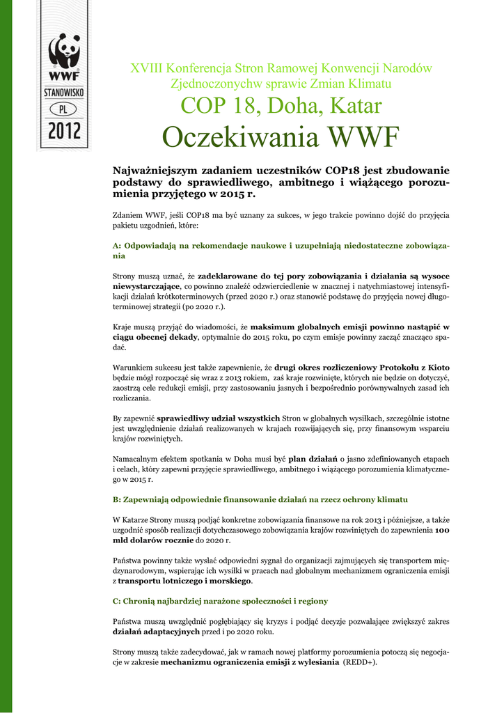 XVIII Konferencja Stron Ramowej Konwencji Narodów Zjednoczonychw sprawie Zmian Klimatu COP 18, Doha, Katar Oczekiwania WWF Najważniejszym zadaniem uczestników COP18 jest zbudowanie podstawy do sprawiedliwego, ambitnego i wiążącego porozumienia przyjętego w 2015 r. Zdaniem WWF, jeśli COP18 ma być uznany za sukces, w jego trakcie powinno dojść do przyjęcia pakietu uzgodnień, które: A: Odpowiadają na rekomendacje naukowe i uzupełniają niedostateczne zobowiązania Strony muszą uznać, że zadeklarowane do tej pory zobowiązania i działania są wysoce niewystarczające, co powinno znaleźć odzwierciedlenie w znacznej i natychmiastowej intensyfikacji działań krótkoterminowych (przed 2020 r.) oraz stanowić podstawę do przyjęcia nowej długoterminowej strategii (po 2020 r.). Kraje muszą przyjąć do wiadomości, że maksimum globalnych emisji powinno nastąpić w ciągu obecnej dekady, optymalnie do 2015 roku, po czym emisje powinny zacząć znacząco spadać. Warunkiem sukcesu jest także zapewnienie, że drugi okres rozliczeniowy Protokołu z Kioto będzie mógł rozpocząć się wraz z 2013 rokiem, zaś kraje rozwinięte, których nie będzie on dotyczyć, zaostrzą cele redukcji emisji, przy zastosowaniu jasnych i bezpośrednio porównywalnych zasad ich rozliczania. By zapewnić sprawiedliwy udział wszystkich Stron w globalnych wysiłkach, szczególnie istotne jest uwzględnienie działań realizowanych w krajach rozwijających się, przy finansowym wsparciu krajów rozwiniętych. Namacalnym efektem spotkania w Doha musi być plan działań o jasno zdefiniowanych etapach i celach, który zapewni przyjęcie sprawiedliwego, ambitnego i wiążącego porozumienia klimatycznego w 2015 r. B: Zapewniają odpowiednie finansowanie działań na rzecz ochrony klimatu W Katarze Strony muszą podjąć konkretne zobowiązania finansowe na rok 2013 i późniejsze, a także uzgodnić sposób realizacji dotychczasowego zobowiązania krajów rozwiniętych do zapewnienia 100 mld dolarów rocznie do 2020 r. Państwa powinny także wysłać odpowiedni sygnał do organizacji zajmujących się transportem międzynarodowym, wspierając ich wysiłki w pracach nad globalnym mechanizmem ograniczenia emisji z transportu lotniczego i morskiego. C: Chronią najbardziej narażone społeczności i regiony Państwa muszą uwzględnić pogłębiający się kryzys i podjąć decyzje pozwalające zwiększyć zakres działań adaptacyjnych przed i po 2020 roku. Strony muszą także zadecydować, jak w ramach nowej platformy porozumienia potoczą się negocjacje w zakresie mechanizmu ograniczenia emisji z wylesiania (REDD+). A: Odpowiedź na rekomendacje naukowe i uzupełnienie niedostatecznych zobowiązań Wspólny cel Strony Konwencji muszą uznać, że globalne emisje powinny jak najszybciej, najlepiej do 2015 r., osiągnąć maksymalny poziom, by potem zacząć spadać. Do 2050 r. emisje muszą spaść o 80% w porównaniu z poziomem z 1990 r. Jeśli państwa chcą dotrzymać zobowiązań w zakresie ograniczenia globalnego ocieplenia do mniej niż 2°C powyżej poziomu sprzed ery przemysłowej, globalna pula dostępnych emisji wyznaczona przez powyższą ścieżkę redukcji nie może podlegać negocjacjom. W jeszcze większym stopniu dotyczy to możliwości wypełnienia przyjętego przez wiele państw celu 1,5°C. Kraje Sygnatariusze Protokołu z Kioto muszą zwiększyć swoje zobowiązania w rozwinięte zakresie redukcji emisji, przynajmniej do wyższej granicy zakresu 25-40% do 2020 r., w porównaniu z 1990 r. oraz przekształcić je w ilościowo określone cele redukcyjne (QELRO). Zobowiązania te wynoszą dziś jedynie 1218%. Kraje rozwinięte, które nie przyjęły celów redukcji emisji w ramach drugiego okresu zobowiązań Protokołu z Kioto, powinny przełożyć swoje dotychczasowe zobowiązania na porównywalne cele. Zobowiązania powinny przyjąć także Strony, które w ogóle nie ratyfikowały Protokołu z Kioto. Rozwiązania wymaga szereg kwestii, w tym ustalenie roku bazowego, wspólnych metod rozliczania emisji, sposobów i standardów raportowania. Kraje Poruszanie się w ramach globalnej puli dostępnych emisji będzie wymagać rozwijające się od wszystkich krajów działania w oparciu o zasady wspólnej, lecz zróżnicowanej odpowiedzialności oraz indywidualnych możliwości państw. Oznacza to, że kraje rozwijające się, które nie określiły jeszcze właściwych dla swojego kraju działań ograniczających emisje, powinny to uczynić przed szczytem w Katarze. Kraje rozwijające się, które podjęły już zobowiązania, powinny dostarczyć informacji na temat założeń, jakie legły u podstaw przyjętych przez nie scenariuszy „business as usual” oraz spodziewanych wielkości ograniczenia emisji. Spójność środowiskowa – nadwyżka uprawnień i Mechanizm Czystego Rozwoju Tzw. mechanizmy elastyczne Protokołu z Kioto okazały się być niewłaściwie zaprojektowane i wywarły negatywny wpływ na stan atmosfery. Źle określone cele pierwszego okresu zobowiązań doprowadziły do powstania zbywalnej nadwyżki jednostek przyznanej emisji (Assigned Amount Units – AAU) o wielkości sięgającej 13 Gt CO2e. Jest to redukcja emisji istniejąca jedynie na papierze, a nie w rzeczywistości. Niektórzy analitycy wskazują również, że mechanizm czystego rozwoju pozwolił na powstanie kilku milionów ton CO2, a emisji tych można byłoby uniknąć gdyby nie został on wprowadzony. Aby naprawić te błędy, Strony muszą zapewnić, że żaden z krajów nie będzie uprawniony do przeniesienia nadwyżki jednostek AAU na drugi okres rozliczeniowy. Obecna nadwyżka AAU wynika z faktu, że ilość uprawnień przyznana niektórym krajom była zupełnie nierealistyczna. Suma AAU była w niektórych przypadkach znacznie większa niż ilość emisji w scenariuszu „business as usual” szacowanym na lata 2008-2012. Mechanizm czystego rozwoju (CDM) oraz wszelkie przyszłe mechanizm