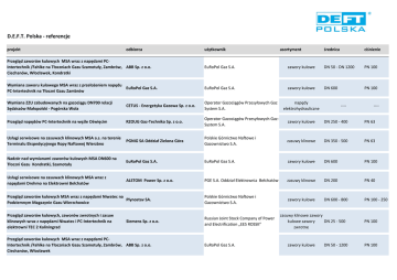 D.E.F.T. Polska - referencje projekt odbiorca użytkownik asortyment średnica ciśnienie Przegląd zaworów kulowych MSA wraz z napędami PCIntertechnik /Fahlke na Tłoczniach Gazu Szamotuły, Zambrów, ABB Sp. z o.o. Ciechanów, Włocławek, Kondratki EuRoPol Gaz S.A. zawory kulowe DN 50 - DN 1200 PN 100 Wymiana zaworu kulowego MSA wraz z przełożeniem napędu EuRoPol Gaz S.A. PC-Intertechnik na Tłoczni Gazu Zambrów EuRoPol Gaz S.A. zawory kulowe DN 600 PN 100 Wymiana ZZU zabudowanych na gazociągu DN700 relacji Sędziszów Małopolski - Pogórska Wola CETUS - Energetyka Gazowa Sp. z o.o. Operator Gazociągów Przesyłowych Gaz System S.A. napędy elektrohydrauliczne Przegląd napędów PC-Intertechnik na węźle Oświęcim RZOUG Gaz-Technika Sp. z o.o. Operator Gazociągów Przesyłowych GazSystem S.A. zawory kulowe DN 250 - 400 PN 63 Usługi serwisowe na zasuwach klinowych MSA a.s. na terenie Terminalu Ekspedycyjnego Ropy Naftowej Wierzbno PGNiG SA Oddział Zielona Góra Polskie Górnictwo Naftowe i Gazownictwo S.A. zasuwy klinowe DN 350 - 500 PN 63 Nadzór nad wymianami zaworów kulowych MSA DN600 na Tłoczni Gazu Kondratki, Szamotuły EuRoPol Gaz S.A. EuRoPol Gaz S.A. zawory kulowe DN 600 PN 100 Usługi serwisowe na zasuwach klinowych MSA wraz z napędami Drehmo na Elektrowni Bełchatów ALSTOM Power Sp. z o.o. PGE S.A. Oddział Elektrownia Bełchatów zasuwy klinowe DN 200 PN 40 Przegląd zaworów kulowych MSA wraz z napędami Niwatec na Plynostav SA. Podziemnym Magazynie Gazu Wierzchowice Polskie Górnictwo Naftowe i Gazownictwo S.A. zawory kulowe DN 600 - 800 PN 100 - 250 Przegląd zaworów kulowych, zaworów zwrotnych i zasuw klinowych wraz z napędami Niwatec i PC-Intertechnik na elektrowni TEC 2 Kaliningrad Russian Joint Stock Company of Power and Electrification „EES ROSSII” Siemens Sp. z o.o. Przegląd zaworów kulowych MSA wraz z napędami PCIntertechnik /Fahlke na Tłoczniach Gazu Szamotuły, Zambrów, ABB Sp. z o.o. Ciechanów, Włocławek EuRoPol Gaz S.A. ---- zasuwy klinowe zawory kulowe zawory DN 25 - 500 zwrotne zawory kulowe DN 50 - 1200 ---- PN 100 PN 100 Przegląd zaworów kulowych MSA wraz z napędami PCIntertechnik/ Fahlke na węzłach Tworzeń, Szopienice, Pogoria, RZOUG Gaz-Technika Sp. z o.o. Częstochowa Operator Gazociągów Przesyłowych GazSystem S.A. zawory kulowe DN 250 - 400 PN 63 Przegląd zaworów kulowych MSA wraz z napędami PCIntertechnik /Fahlke na Tłoczniach Gazu Szamotuły, Zambrów, TESGAS S.A. Ciechanów, Włocławek EuRoPol Gaz S.A. zawory kulowe DN 50 - 1200 PN 100