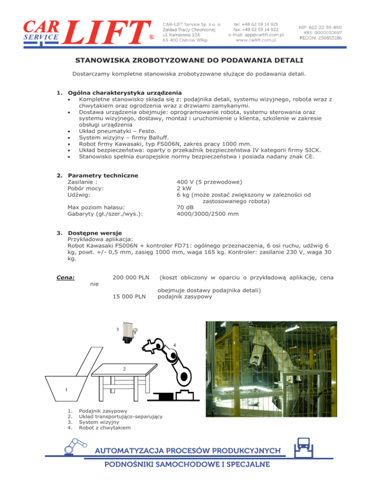 STANOWISKA ZROBOTYZOWANE DO PODAWANIA DETALI Dostarczamy kompletne stanowiska zrobotyzowane służące do podawania detali. 1. Ogólna charakterystyka urządzenia Kompletne stanowisko składa się z: podajnika detali, systemu wizyjnego, robota wraz z chwytakiem oraz ogrodzenia wraz z drzwiami zamykanymi. Dostawa urządzenia obejmuje: oprogramowanie robota, systemu sterowania oraz systemu wizyjnego, dostawy, montaż i uruchomienie u klienta, szkolenie w zakresie obsługi urządzenia Układ pneumatyki – Festo. System wizyjny – firmy Balluff. Robot firmy Kawasaki, typ FS006N, zakres pracy 1000 mm. Układ bezpieczeństwa: oparty o przekaźnik bezpieczeństwa IV kategorii firmy SICK. Stanowisko spełnia europejskie normy bezpieczeństwa i posiada nadany znak CE. 2. Parametry techniczne Zasilanie : Pobór mocy: Udźwig: 400 V (5 przewodowe) 2 kW 6 kg (może zostać zwiększony w zależności od zastosowanego robota) 70 dB 4000/3000/2500 mm Max poziom hałasu: Gabaryty (gł./szer./wys.): 3. Dostępne wersje Przykładowa aplikacja: Robot Kawasaki FS006N + kontroler FD71: ogólnego przeznaczenia, 6 osi ruchu, udźwig 6 kg, powt. +/- 0,5 mm, zasięg 1000 mm, waga 165 kg. Kontroler: zasilanie 230 V, waga 30 kg. Cena: 200 000 PLN (koszt obliczony w oparciu o przykładową aplikację, cena nie 15 000 PLN obejmuje dostawy podajnika detali) podajnik zasypowy 3 4 2 1 1. 2. 3. 4. Podajnik zasypowy Układ transportująco-separujący System wizyjny Robot z chwytakiem