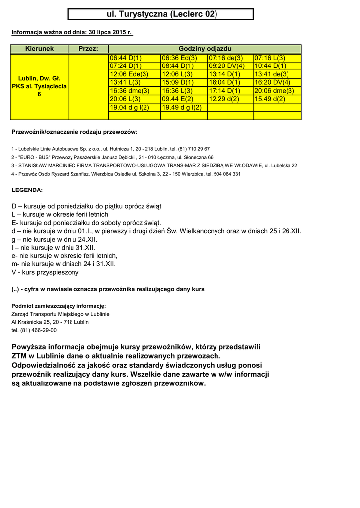 ul. Turystyczna (Leclerc 02) Informacja ważna od dnia: 30 lipca 2015 r. Kierunek Przez: Lublin, Dw. Gł. PKS al. Tysiąclecia 6 06:44 D(1) 07:24 D(1) 12:06 Ede(3) 13:41 L(3) 16:36 dme(3) 20:06 L(3) 19.04 d g l(2) Godziny odjazdu 06:36 Ed(3) 07:16 de(3) 08:44 D(1) 09:20 DV(4) 12:06 L(3) 13:14 D(1) 15:09 D(1) 16:04 D(1) 16:36 L(3) 17:14 D(1) 09.44 E(2) 12.29 d(2) 19.49 d g l(2) 07:16 L(3) 10:44 D(1) 13:41 de(3) 16:20 DV(4) 20:06 dme(3) 15.49 d(2) Przewoźnik/oznaczenie rodzaju przewozów: 1 - Lubelskie Linie Autobusowe Sp. z o.o., ul. Hutnicza 1, 20 - 218 Lublin, tel. (81) 710 29 67 2 - "EURO - BUS" Przewozy Pasażerskie Janusz Dębicki , 21 - 010 Łęczma, ul. Słoneczna 66 3 - STANISŁAW MARCINIEC FIRMA TRANSPORTOWO-USŁUGOWA TRANS-MAR Z SIEDZIBĄ WE WŁODAWIE, ul. Lubelska 22 4 - Przewóz Osób Ryszard Szanfisz, Wierzbica Osiedle ul. Szkolna 3, 22 - 150 Wierzbica, tel. 504 064 331 LEGENDA: D – kursuje od poniedziałku do piątku oprócz świąt L – kursuje w okresie ferii letnich E- kursuje od poniedziałku do soboty oprócz świąt. d – nie kursuje w dniu 01.I., w pierwszy i drugi dzień Św. Wielkanocnych oraz w dniach 25 i 26.XII. g – nie kursuje w dniu 24.XII. l – nie kursuje w dniu 31.XII. e- nie kursuje w okresie ferii letnich, m- nie kursuje w dniach 24 i 31.XII. V - kurs przyspieszony (..) - cyfra w nawiasie oznacza przewoźnika realizującego dany kurs Podmiot zamieszczający informację: Zarząd Transportu Miejskiego w Lublinie Al.Kraśnicka 25, 20 - 718 Lublin tel. (81) 466-29-00 Powyższa informacja obejmuje kursy przewoźników, którzy przedstawili ZTM w Lublinie dane o aktualnie realizowanych przewozach. Odpowiedzialność za jakość oraz standardy świadczonych usług ponosi przewoźnik realizujący dany kurs. Wszelkie dane zawarte w w/w informacji są aktualizowane na podstawie zgłoszeń przewoźników.