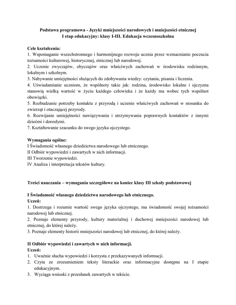 Podstawa programowa - Języki mniejszości narodowych i mniejszości etnicznej I etap edukacyjny: klasy I-III. Edukacja wczesnoszkolna Cele kształcenia: 1. Wspomaganie wszechstronnego i harmonijnego rozwoju ucznia przez wzmacnianie poczucia tożsamości kulturowej, historycznej, etnicznej lub narodowej. 2. Uczenie zwyczajów, obyczajów oraz właściwych zachowań w środowisku rodzinnym, lokalnym i szkolnym. 3. Nabywanie umiejętności służących do zdobywania wiedzy: czytania, pisania i liczenia. 4. Uświadamianie uczniom, że wspólnoty takie jak: rodzina, środowisko lokalne i ojczyzna stanowią wielką wartość w życiu każdego człowieka i że każdy ma wobec tych wspólnot obowiązki. 5. Rozbudzanie potrzeby kontaktu z przyrodą i uczenie właściwych zachowań w stosunku do zwierząt i otaczającej przyrody. 6. Rozwijanie umiejętności nawiązywania i utrzymywania poprawnych kontaktów z innymi dziećmi i dorosłymi. 7. Kształtowanie szacunku do swego języka ojczystego. Wymagania ogólne: I Świadomość własnego dziedzictwa narodowego lub etnicznego. II Odbiór wypowiedzi i zawartych w nich informacji. III Tworzenie wypowiedzi. IV Analiza i interpretacja tekstów kultury. Treści nauczania – wymagania szczegółowe na koniec klasy III szkoły podstawowej I Świadomość własnego dziedzictwa narodowego lub etnicznego. Uczeń: 1. Dostrzega i rozumie wartość swego języka ojczystego, ma świadomość swojej tożsamości narodowej lub etnicznej. 2. Poznaje elementy przyrody, kultury materialnej i duchowej mniejszości narodowej lub etnicznej, do której należy. 3. Poznaje elementy historii mniejszości narodowej lub etnicznej, do której należy. II Odbiór wypowiedzi i zawartych w nich informacji. Uczeń: 1. Uważnie słucha wypowiedzi i korzysta z przekazywanych informacji. 2. Czyta ze zrozumieniem teksty literackie oraz informacyjne dostępne na I etapie edukacyjnym. 3. Wyciąga wnioski z przesłanek zawartych w tekście. 4. Wyszukuje w tekście potrzebne informacje i w miarę możliwości korzysta ze słowników i encyklopedii przeznaczonych dla dzieci na I etapie edukacyjnym. 5. Zna formy użytkowe: życzenia, zaproszenie, zawiadomienie, list, notatka do kroniki. 6. Zna i stosuje formy grzecznościowe w kontaktach międzyludzkich. III Tworzenie wypowiedzi. Uczeń: 1. Tworzy w formie ustnej i pisemnej: kilkuzdaniową wypowiedź, krótkie opowiadanie i opis, list prywatny, życzenia, zaproszenie. 2. Dobiera właściwe formy komunikowania się w różnych sytuacjach społecznych. 3. Przejawia wrażliwość estetyczną w wypowiedziach inspirowanych twórczością dla dzieci, tworzy, przekształca i rozwija swoje wypowiedzi. 4. Uczestniczy w rozmowach: zadaje pytania, udziela odpowiedzi i prezentuje własne zdanie. 5. Poszerza zasób słownictwa poprzez kontakt z tekstami literackimi i innymi tekstami kultury. 6. Zna alfabet: rozróżnia litery, głoski, znaki fonetyczne; dzieli wyrazy na sylaby; oddziela wyrazy w zdaniu, oddziela zdania w tekście i poprawnie je zapisuje (zgodnie z elementarnymi zasadami ortografii i interpunkcji). 7. Pisze czytelnie i estetycznie. 8. Przepisuje teksty, pisze z pamięci i ze słuchu; w miarę swoich możliwości samodzielnie realizuje pisemne zadania domowe. IV Analiza i interpretacja tekstów kultury. Uczeń: 1. W tekście literackim wybiera określone fragmenty, określa czas i miejsce akcji, wskazuje głównych bohaterów. 2. Czyta i recytuje, z uwzględnieniem interpunkcji, intonacji, akcentów, poprawnej wymowy. 3. Wykorzystuje teksty literackie do tworzenia własnych wypowiedzi. 4. Czyta wskazane teksty literackie i wypowiada się na ich temat. 5. Pod kierunkiem nauczyciela korzysta z podręczników i zeszytów ćwiczeń oraz innych środków dydaktycznych. Lista lektur i innych tekstów kultury z języków mniejszości narodowych (ukraińskiego, białoruskiego, litewskiego) i języka etnicznego (łemkowskiego). I etap edukacyjny: klasy I-III. Edukacja wczesnoszkolna JĘZYK UKRAIŃSKI Klasa I Українські народні казки: „Рукавичка” „Казка про котика і півника” „Розум та щастя” „Півник і двоє мишенят” Чубач Ганна „Українська мова” Глазовий Павло гумореска «Хитра макітра» Мамчич Олеся «Будить мама ведмежатко» Українка Леся «Біда навчить» Вознюк Леся «Через річку» Piosenki i inne teksty kultury do wyboru Klasa II Українські народні казки „Телесик” „Солом’яний бичок” „Колобок” „Про двох цапків” Костецький Анатолій „Моя кишеня” Моруга Василь „Чому я спізнився? „ Сухомлинський Василь „Сива волосинка” Чемерис Валентин «Чорна кішка, або магічне число «сім»» Михайлюк Климентій «Калина» Piosenki i inne teksty kultury do wyboru Klasa III Українські народні казки „Коза-дереза” „Названий батько” „Кривенька качечка” Легенда «Бабине літо» Руданський Степан „Старий вовк” Українка Леся „Казка про Оха-Чародія” Франко Іван „Старе добро забувається” Козленко Наталія «Незалежна і Єдина» Piosenki i inne teksty kultury do wyboru JĘZYK BIAŁORUSKI Klasa I Фама Ляшонак - “Сцежачка да школы” Тадзіяна Кляшторная – “Ветлівыя словы” Даір Слаўковіч - “Разумны аловак” Уладзімір Ліпскі - “Прыгоды нуліка” Віктар Швед - 