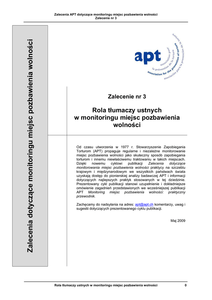 Zalecenia dotyczące monitoringu miejsc pozbawienia wolności Zalecenia APT dotyczące monitoringu miejsc pozbawienia wolności Zalecenie nr 3 Zalecenie nr 3 Rola tłumaczy ustnych w monitoringu miejsc pozbawienia wolności Od czasu utworzenia w 1977 r. Stowarzyszenie Zapobiegania Torturom (APT) propaguje regularne i niezależne monitorowanie miejsc pozbawienia wolności jako skuteczny sposób zapobiegania torturom i innemu niewłaściwemu traktowaniu w takich miejscach. Dzięki nowemu cyklowi publikacji Zalecenia dotyczące monitorowania miejsc pozbawienia wolności praktycy na szczeblu krajowym i międzynarodowym we wszystkich państwach świata uzyskają dostęp do pionierskiej analizy badawczej APT i informacji dotyczących najlepszych praktyk stosowanych w tej dziedzinie. Prezentowany cykl publikacji stanowi uzupełnienie i dokładniejsze omówienie zagadnień przedstawionych we wcześniejszej publikacji APT Monitoring miejsc pozbawienia wolności: praktyczny przewodnik. Zachęcamy do nadsyłania na adres: [email protected] komentarzy, uwag i sugestii dotyczących prezentowanego cyklu publikacji. Maj 2009 Rola tłumaczy ustnych w monitoringu miejsc pozbawienia wolności 0 Zalecenia APT dotyczące monitoringu miejsc pozbawienia wolności Zalecenie nr 3 Oryginalna wersja została opublikowana przez APT w 2009 r. Oryginalny tytuł: Detention Monitoring Briefings: Using Interpreters in Detention Monitoring. COPYRIGHT 2009, APT Odpowiedzialność za tłumaczenie na język polski: Krajowy Mechanizm Prewencji w Polsce Tłumaczenie zostało wykonane w ramach „Europejskiego Projektu KMP” i ufundowane przez Wspólny Program Rady Europy/Komisji Europejskiej „Utworzenie aktywnej sieci krajowych mechanizmów przeciw torturom, działalność sieci partnerskiej współpracy Peer-to-Peer”, współfinansowany przez Fundusz Powierniczy na Rzecz Praw Człowieka. 1 Rola tłumaczy ustnych w monitoringu miejsc pozbawienia wolności Zalecenia APT dotyczące monitoringu miejsc pozbawienia wolności Zalecenie nr 3 1. 1.1 WPROWADZENIE Jak korzystać z zaleceń? Prezentowane zalecenie kierowane jest do organizacji, które prowadzą monitoring miejsc pozbawienia wolności na szczeblu krajowym lub międzynarodowym i które delegują wizytatorów, by przeprowadzili rozmowy z władzami nadzorującymi miejsca pozbawienia wolności lub z osobami pozbawionymi wolności mówiącymi w języku innym niż wizytatorzy. W zaleceniu przedstawiono problemy napotykane przez organizacje monitorujące, które korzystają z usług tłumaczy ustnych. Następnie omówione zostały role wizytatora i tłumacza ustnego oraz istotne aspekty pracy każdego z nich. W końcowej tabeli przedstawiono wytyczne dotyczące pracy wizytatora i tłumacza, które zostały opracowane na podstawie najlepszych praktyk krajowych i międzynarodowych. 1.2 Wstępne rozważania Wizytatorzy miejsc pozbawienia wolności często znajdują się w sytuacji, w której nie znają języka jednej lub kilku osób pozbawionych wolności albo właściwych władz nadzorujących. W związku z tym przeprowadzając rozmowę, wizytatorzy mogą potrzebować pomocy innej osoby, która jest tłumaczem zawodowym, osobą wykonującą tłumaczenia dorywczo lub osobą znającą dany język, która została wybrana zupełnie przypadkowo1. Bariera językowa, różnice kulturowe i komunikacja pośrednia dodatkowo utrudniają skomplikowane zadanie monitoringu. Współpraca z tłumaczem ustnym wymaga od wizytatora zastosowania wielu wrodzonych i/lub nabytych umiejętności. Samo tłumaczenie jest również, bez wątpienia, niezwykle ambitnym zadaniem. Tłumacz ustny musi łączyć wiele różnych funkcji, dążąc do osiągnięcia złożonych celów. Brak przygotowania i doświadczenia ze strony tłumacza, wizytatora lub obu z nich może skutkować błędną komunikacją. Taki problem może wywierać wpływ nie tylko na proces przeprowadzania rozmowy, ale także na wiarygodność organizacji monitorującej. Jak zawsze, nie ma gotowego wzoru na sprostanie wyzwaniom związanym z wykorzystaniem tłumaczy ustnych podczas monitoringu. Wszelkie problemy należy przezwyciężać w sposób pragmatyczny, uwzględniając odpowiednie przygotowanie i politykę oraz kierując się zasadami etycznymi i dobrze przemyślaną metodologią. 2. ZAGADNIENIA DOTYCZĄCE POLITYKI Organizacje monitorujące miejsca pozbawienia wolności mogą w sposób regularny i przewidywalny korzystać z usług tłumaczy ustnych. Może się również zdarzyć, że będą one tylko okazjonalnie odczuwały taką potrzebę. W obu przypadkach współpraca z tłumaczem ustnym powinna być możliwie najdokładniej zaplanowana. Niezależnie od sytuacji wybierani mogą być tłumacze zawodowi, tłumacze wykonujący tłumaczenia dorywczo lub, jeśli nie ma innego wyboru, osoby znające język, które znajdują się w danym miejscu. Organizacje monitorujące miejsca pozbawienia wolności powinny, w odniesieniu do każdego przypadku, opracować politykę korzystania z usług tłumaczeniowych w celu standaryzacji praktyki, zapewnienia jakości i unikania niespodzianek podczas wykonywania czynności. Poniżej przedstawione zostały aspekty, którym warto się przyjrzeć. 1 Dla potrzeb niniejszego zalecenia wyrażenie „tłumacz ustny" używane jest w odniesieniu do tłumaczy zawodowych i osób wykonujących tłumaczenia dorywczo, a także do osób wybranych ad hoc w celu tłumaczenia podczas wizyty monitorującej. Rola tłumaczy ustnych w monitoringu miejsc pozbawienia wolności 2 Zalecenia APT dotyczące monitoringu miejsc pozbawienia wolności Zalecenie nr 3 2.1 Rekrutacja i screening Tłumacz zawodowy lub pracujący dorywczo: pierwsze decyzje nieuchronnie będą wiązały się z pytaniem czy praca organizacji wymaga korzystania z usług zawodowych tłumaczy i czy takie są dostępne. Jeśli nie, organizacja musi zastanowić się jak przygotować i zatrudniać osoby, które wykonują usługi tłumaczeniowe dorywczo. Nieza