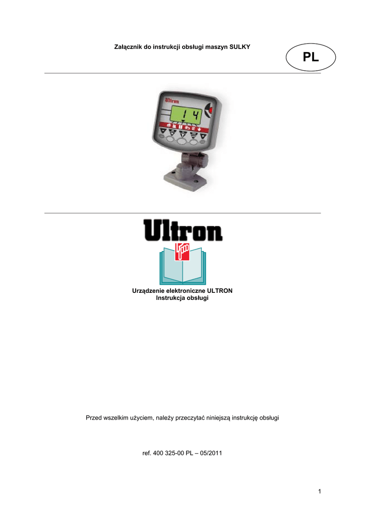Załącznik do instrukcji obsługi maszyn SULKY PL Urządzenie elektroniczne ULTRON Instrukcja obsługi Przed wszelkim użyciem, należy przeczytać niniejszą instrukcję obsługi ref. 400 325-00 PL – 05/2011 1 2 Zalecenia związane z bezpieczeństwem pracy Należy przestrzegać zaleceń zawartych w niniejszej instrukcji obsługi. Należy przestrzegać zaleceń zawartych w instrukcji obsługi siewnika lub innej maszyny Sulky. Nigdy nie wolno opuszczać kabiny ciągnika, gdy znajduje się on w ruchu. Przeprowadzanie wszelkich czynności regulacyjnych i konserwacyjnych na rozsiewaczu jest dozwolone tylko podczas postoju maszyny SULKY. Wstępne regulacje urządzenia i maszyny współpracującej przeprowadzać w czasie postoju ciągnika. Przed przeprowadzeniem ustawień wymagających przejazdu ciągnikiem, upewnić się czy w pobliżu nie znajduje się żadna osoba, która byłaby narażona na jakiekolwiek niebezpieczeństwo podczas wykonywania manewrów. Przed przeprowadzeniem prac spawalniczych lub prac związanych z układem elektrycznym maszyny lub ciągnika zaleca się odłączenie przewodów od akumulatora. Urządzenie elektroniczne SULKY ULTRON jest przeznaczone do współpracy wyłącznie z maszynami SULKY: rozsiewaczami nawozów lub siewnikami zbożowymi. Wszelkie inne użytkowanie urządzenia traktowane jest jako niezgodne z zaleceniami. Odpowiedzialność konstruktora jest wykluczona w przypadku przeprowadzenia przez użytkownika jakichkolwiek modyfikacji na urządzeniu. Ryzyko wypadku! Ryzyko uszkodzenia maszyny Ułatwienie pracy Nie wyrzucać do śmieci! Utylizować zgodnie z obowiązującymi przepisami! W niniejszej instrukcji obsługi użyto powyższych symboli za każdym razem, gdy opisane zalecenia dotyczą Państwa bezpieczeństwa jak i osoby postronnej lub działania samej maszyny. Wszelkie zalecenia należy przekazać każdemu użytkownikowi maszyny. 3 4 SPIS TREŚCI: Strony Opis Prezentacja 6-7 A. Prezentacja systemu 8-9 B. Podłączenie do ciągnika 8-9 C. Montaż 10-11 D. Prezentacja urządzenia 12-13 E. Szybkie uruchomienie Obsługa urządzenia ULTRON na siewniku 14-21 A. Funkcja prędkości roboczej 22-27 B. Funkcja licznika hektarów 28-39 C. Funkcja wyznaczania ścieżek technologicznych 40-43 D. Funkcja turbiny 44-47 E. Funkcja alarmu Informacje 48-49 A. Schemat układu 49 B. Konserwacja 50 C. Rozwiązania problemów Prosimy o dokładne przeczytanie instrukcji obsługi urządzenia i maszyny przed pracą. 5 Prezentacja / Przygotowanie do pracy urządzenia Ultron dla siewnika 6 Prezentacja / Przygotowanie do pracy urządzenia Ultron dla siewnika A. Schemat systemu ULTRON jest urządzeniem regulacyjnym i kontrolnym. Informacje i dane dotyczące ciężaru, pochodzące z urządzenia ULTRON nie mogą być wykorzystywane do przeprowadzania transakcji finansowych. Prezentacja: (1) Konsola ULTRON. (2) Wiązka zasilająca z bezpiecznikiem 5 A (wyposażenie opcjonalne). (3) Skrzynka połączeniowa na siewniku. (4) Czujnik turbiny. (5) Czujnik ścieżek technologicznych (1 lub 2). (6) Czujnik prędkości / powierzchni. (7) Czujnik na wałku aparatów wysiewających. (8) Elektrozawór znaczników przed-wschodowych. (9) Czujnik ziarna w skrzyni nasiennej. (10) Wyznaczanie ścieżek technologicznych po-wschodowych (technologicznych). 7 Prezentacja / Przygotowanie do pracy urządzenia Ultron dla siewnika 8 Prezentacja / Przygotowanie do pracy urządzenia Ultron dla siewnika B. Podłączenie do ciągnika a) Podłączenie urządzenia ULTRON Podłączenie zasilania elektrycznego urządzenia musi odbyć się bezpośrednio z akumulatora ciągnika o napięciu 12 Volt. Skrzynka systemu ULTRON posiada własny akumulatorek umożliwiający zapisanie w pamięci zaprogramowanych danych. Urządzenie jest chronione bezpiecznikami 5 A na przewodzie zasilającym. Wiązka zasilająca jest możliwa w wyposażeniu opcjonalnym. Uwaga: Jeśli Państwa ciągnik jest wyposażony w identyczne gniazdo (cobo), należy upewnić się czy bezpiecznik jest 5-Amperowy. C. Montaż b) Wymiary Konsolę należy tak zamontować w kabinie ciągnika, aby była dobrze widoczna przez operatora. c) Zamocowanie Urządzenie może być zamocowane w jednej z trzech pozycji, dzięki 3 przestawnym pokrętłom (1), (2) i (3). 9 Prezentacja / Przygotowanie do pracy urządzenia Ultron dla siewnika 10 Prezentacja / Przygotowanie do pracy urządzenia Ultron dla siewnika D. Prezentacja konsoli Przełącznik On/Off (Włączone/Wyłączone) Standardowa konsola Wyświetlacz wielofunkcyjny Funkcje A – Prędkość robocza w Km/h B – Powierzchnia C – Ścieżki technologiczne D – Koniec ziarna w skrzyni nasiennej siewnika E – Obroty wałka z aparatami wysiewającymi F – Kontrola turbiny Parametry 1 – Zmniejszanie wartości 2 – Dodanie przejazdu wyznaczania ścieżki technologicznej 3 – Przemieszczanie kursora i zatwierdzanie 4 – Zatrzymanie wyznaczania ścieżek technologicznych i wyzerowanie licznika hektarów 5 – Zwiększanie wartości 11 Prezentacja / Przygotowanie do pracy urządzenia Ultron dla siewnika 12 Prezentacja / Przygotowanie do pracy urządzenia Ultron dla siewnika E. Szybkie uruchomienie Włączyć urządzenie. - Sprawdzić różne funkcje za pomocą przycisku (3). (A) Ścieżki technologiczne Sprawdzić numer przejazdu i sposób wyznaczania ścieżek technologicznych „SY – AS”. Ustawić odpowiednią wartość na początku pola za pomocą przycisku (2). Zatrzymanie zliczania jest możliwe za pomocą przycisku (4). (B) Liczniki hektarów Wybieranie odczytów różnych funkcji przyciskiem (3). Wybrać licznik hektarów: lub przyciskiem (2). Wyzerowanie licznika hektarów za pomocą przycisku (4) (poczekać 5 sekund). 13 Obsługa urządzenia ULTRON na siewniku 14 Obsługa urządzenia ULTRON na siewniku A. Funkcja prędkości roboczej a) Obsługa Nacisnąć na (3), aby doprowadzić kursor na funkcję Km/h. W czasie pracy prędkość robocza będzie wyświetlana. Minimalna wskazywana prędkość 