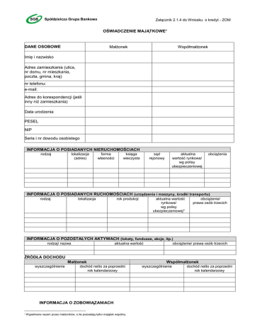 Załącznik 2.1.4 do Wniosku o kredyt - ZOM OŚWIADCZENIE MAJĄTKOWE Małżonek DANE OSOBOWE Współmałżonek Imię i nazwisko Adres zamieszkania (ulica, nr domu, nr mieszkania, poczta, gmina, kraj) nr telefonu: e-mail: Adres do korespondencji (jeśli inny niż zamieszkania) Data urodzenia PESEL NIP Seria i nr dowodu osobistego INFORMACJA O POSIADANYCH NIERUCHOMOŚCIACH rodzaj lokalizacja (adres) forma własności księga wieczysta sąd rejonowy aktualna wartość rynkowa/ wg polisy ubezpieczeniowej obciążenia INFORMACJA O POSIADANYCH RUCHOMOŚCIACH (urządzenia i maszyny, środki transportu) rodzaj lokalizacja aktualna wartość rynkowa/ wg polisy ubezpieczeniowej* rok produkcji obciążenie/ prawa osób trzecich INFORMACJA O POZOSTAŁYCH AKTYWACH (lokaty, fundusze, akcje, itp.) aktualna wartość rodzaj/ nazwa obciążenie/ prawa osób trzecich ŹRÓDŁA DOCHODU Małżonek wyszczególnienie dochód netto za poprzedni rok kalendarzowy INFORMACJA O ZOBOWIĄZANIACH Wypełniane razem przez małżonków, o ile posiadają tylko majątek wspólny. Współmałżonek wyszczególnienie dochód netto za poprzedni rok kalendarzowy ZADŁUŻENIE Z TYTUŁU ZACIĄGNIĘTYCH KREDYTÓW, POŻYCZEK, PRZYZNANYCH LIMITÓW, KART KREDYTOWYCH, UDZIELONYCH PORĘCZEŃ W INNYCH BANKACH nie posiadam/y zobowiązań w innych bankach nazwa instytucji finansującej rodzaj zobowiązania kwota i waluta wg umowy posiadam/y zobowiązania w kwocie ogółem: aktualna kwota pozostająca do spłaty okres kredytowania od…do miesięczna rata zł rodzaj zabezpieczenia Inne zobowiązania stałe np. alimenty USTAWOWA WSPÓLNOTA MAJĄTKOWA TAK NIE NIE DOTYCZY liczba osób pozostających we wspólnym gospodarstwie domowym Bank Spółdzielczy w Piotrkowie Kujawskim (dalej bank) zgodnie z art. 24 ust. 1 Ustawy z dnia 29 sierpnia 1997 r. o ochronie danych osobowych (j.t. Dz. U. z 2002 r., nr 101, poz. 926, z późn. zm.) informuje, iż jest Administratorem podanych przez Pana/ Panią danych osobowych. Dane będą przetwarzane przez bank w celu oceny zdolności kredytowej oraz analizy ryzyka kredytowego, a także w celu promocji i marketingu działalności prowadzonej przez bank. Na podstawie art. 32 ustawy o ochronie danych osobowych ma Pan/Pani prawo do dostępu do treści oraz poprawiania swoich danych, w szczególności ich uaktualnienia, sprostowania, poprawienia. Podanie danych jest dobrowolne, jednakże ich podanie warunkuje zawarcie i realizację umowy. Bank informuje, iż: 1) w zakresie, w jakim jest to niezbędne do podjęcia działań przed zawarciem umowy oraz konieczne do realizacji umowy, a także niezbędne dla wypełniania prawnie usprawiedliwionych celów realizowanych przez Bank oraz niezbędne dla zrealizoawnia określonych przepisami prawa uprawnień i obowiązków banku związanych z wykonaniem czynności bankowych oraz obowiązków archiwalnych, podane przez Pana/Panią dane osobowe będą przetwarzane przez Bank oraz przekazywane na podstawie art. 105 ust. 1 pkt 1c oraz art. 105 ust. 4 Ustawy z dnia 29 sierpnia 1997 r. Prawo bankowe (j.t. Dz. U. z 2012 r., poz. 1376, z późn. zm.) – do Biura Informacji Kredytowej S.A. z siedzibą w Warszawie, a także do innych podmiotów do tego uprawnionych na mocy art. 105 ustawy Prawo bankowe. Podanie przez Pana/Panią danych osobowych jest dobrowolne. Podane przez Pana/Panią dane osobowe będą przetwarzane przez Biuro Informacji Kredytowej S.A. z siedzibą w Warszawie przy ul. Zygmunta Modzelewskiego 77A w celu i zakresie określonym w art. 105 i 105a ustawy Prawo bankowe, w tym w celu oceny zdolności kredytowej i analizy ryzyka kredytowego oraz w celu stosowania przez banków metod statystycznych. Przysługuje Pani/Panu i przysługuje prawo dostępu do przetwarzanych danych i ich poprawiania, a także prawo żądania zaprzestania przetwarzania danych i wniesienia sprzeciwu w przypadkach określonych w art. 32 ust. 1 pkt 7 i 8 Ustawy z dnia 29 sierpnia 1997 r. o ochronie danych osobowych (Dz. U. z 2002 r. Nr 101, poz. 926, z późn. zm.). 2) Pana/Pani dane osobowe mogą być udostępnianie przez bank bankom oraz instytucjom wymienionym w art. 105 ustawy Prawo bankowe, w zakresie tam określonym oraz biurom informacji gospodarczych, w tym Krajowemu Rejestrowi Długów Biura Informacji Gospodarczej S.A. z siedzibą we Wrocławiu oraz InfoMonitorowi Biura Informacji Gospodarczej S.A. z siedzibą w Warszawie, a także do Systemu Bankowy Rejestr administrowanego przez Związek Banków Polskich z siedzibą w Warszawie, 3) Pana/ Pani dane mogą być udostępniane przez bank, bankom Spółdzielczej Grupy Bankowej w celu prowadzenia działalności marketingowej. Oświadczenia 1. Wyrażam zgodę na przetwarzanie przez bank informacji stanowiących moje dane osobowe w celu dokonywania oceny ryzyka kredytowego. 2. Upoważniam bank, na podstawie art. 24 ust. 1 Ustawy z dnia 9 kwietnia 2010 r. o udostępnianiu informacji gospodarczych i wymianie danych gospodarczych (Dz. U. Nr 81, poz. 530, z późn. zm..) oraz na podstawie art. 105 ust. 4a i 4a1 Ustawy z dnia 29 sierpnia 1997 r. Prawo bankowe (j.t. Dz. U. z 2012 r., poz. 1376, z późn. zm.) w związku z art. 13 Ustawy z dnia 9 kwietnia 2010 r. o udostępnianiu informacji gospodarczych i wymianie danych gospodarczych (Dz. U Nr 81, poz. 530, z późn. zm.), do pozyskania z Biura Informacji Gospodarczej InfoMonitor S.A. z siedzibą w Warszawie, dotyczących mnie informacji gospodarczych oraz do pozyskania za pośrednictwem BIG InfoMonitor danych gospodarczych z Biura Informacji Kredytowej i Związku Banków Polskich dotyczących mojego Strona 2 z 3 3. 4. 5. 6. 7. wymagalnego od co najmniej 60 dni zadłużenia wobec banków lub instytucji upoważnionych do udzielania kredytów, przekraczającego 200 złotych (dwieście złotych) lub braku danych o takim zadłużeniu. Upoważniam bank, na podstawie art. 24 ust. 1 Ustawy z dnia 9 kwietnia 2010 r. o udostępnieniu informacji gospodarczych i wymianie danych gospodarczych (Dz. U. Nr 81,