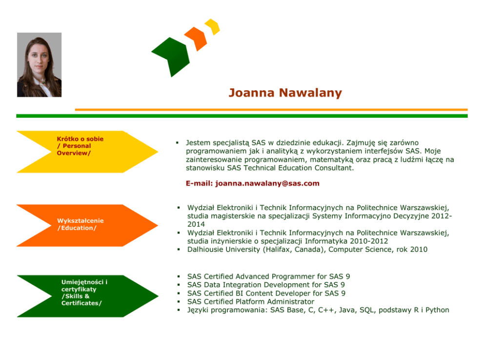 Joanna Nawalany Krótko o sobie / Personal Overview/ Jestem specjalistą SAS w dziedzinie edukacji. Zajmuję się zarówno programowaniem jak i analityką z wykorzystaniem interfejsów SAS. Moje zainteresowanie programowaniem, matematyką oraz pracą z ludźmi łączę na stanowisku SAS Technical Education Consultant. E-mail: [email protected] Wydział Elektroniki i Technik Informacyjnych na Politechnice Warszawskiej, studia magisterskie na specjalizacji Systemy Informacyjno Decyzyjne 20122014 Wydział Elektroniki i Technik Informacyjnych na Politechnice Warszawskiej, studia inżynierskie o specjalizacji Informatyka 2010-2012 Dalhiousie University (Halifax, Canada), Computer Science, rok 2010 SAS Certified Advanced Programmer for SAS 9 SAS Data Integration Development for SAS 9 SAS Certified BI Content Developer for SAS 9 SAS Certified Platform Administrator Języki programowania: SAS Base, C, C++, Java, SQL, podstawy R i Python Wykształcenie /Education/ Umiejętności i certyfikaty /Skills & Certificates/ Doświadczenie Zawodowe /Professional Experience/ Doświadczenia analityki biznesowej /Expirience in Business Analytics/ Zainteresowania naukowe /Research interest/ Hobby Education Consultant SAS 2012o Przygotowanie i prowadzenie szkoleń, w tym szkoleń za granicą o Konferencje SAS i krótkie prezentacje produktów Programista Java w QBS 2010-2011 Web Developer dla Top Multimedia 2007-2008 o Projektowanie, tworzenie i konserwacja portalu internetowego firmy Wykorzystanie i prezentacja analitycznych narzędzi SAS: o SAS Visual Analytics, SAS Enterpise Guide i inne o Konferencje SAS dla Praktyków, SAS dla Analityków Przygotowanie I obróbka danych, tworzenie raportów analitycznych z poziomu kodu SAS Base Analiza, automatyzacja i optymalizacja procesów marketingowych Customer Intelligence Optymalizacja Narciarstwo Fotografia Śpiew chóralny