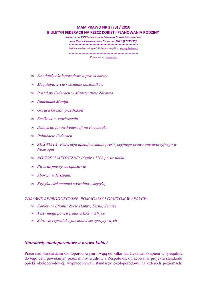 MAM PRAWO NR 2 (73) / 2010 BIULETYN FEDERACJI NA RZECZ KOBIET I PLANOWANIA RODZINY FEDERACJA OD 1990 ROKU POSIADA SPECJALNY STATUS KONSULTACYJNY PRZY RADZIE EKONOMICZNO – SPOŁECZNEJ ONZ (ECOSOC) ************************************************** Jeśli nie możesz odczytać Biuletynu, wejdź na stronę Federacji ************************************************** POLUB NAS NA FACEBOOKU • Standardy okołoporodowe a prawa kobiet • Megatabu: życie seksualne nastolatków • Postulaty Federacji w Ministerstwie Zdrowia • Nadchodzi Manifa • Gorąca kwestia przedszkoli • Becikowe w zawieszeniu • Dołącz do fanów Federacji na Facebooku • Publikacje Federacji • ZE ŚWIATA: Federacja apeluje o zmianę restrykcyjnego prawa antyaborcyjnego w Nikaragui • NOWOŚCI MEDYCZNE: Pigułka 120h po stosunku • PE oraz polscy europosłowie • Aborcja w Hiszpanii • Krytyka ekskomuniki wywołała ...krytykę ZDROWIE REPRODUKCYJNE. POMAGAMY KOBIETOM W AFRYCE: • Kobiety w Etiopii: Życie Hanny, Zeritu, Zenaye • Testy mogą powstrzymać AIDS w Afryce • Zdrowie reprodukcyjne kobiet seropozytywnych Standardy okołoporodowe a prawa kobiet Prace nad standardami okołoporodowymi trwają od kilku lat. Lekarze, skupieni w specjalnie do tego celu powołanym przez ministra zdrowia Zespole ds. opracowania projektu standardu opieki okołoporodowej, wypracowywali standardy okołoporodowe na czterech poziomach: opieki nad kobietą w ciąży, opieki okołoporodowej, opieki nad kobietą w okresie połogu oraz opieki nad noworodkiem. Podstawowym celem miało być zapewnienie rodzącej kobiecie oraz jej dziecku odpowiedniego traktowania i zachowania procedur postępowania, zgodnie z najlepszymi standardami w tym zakresie. Niestety, prawo kobiety do zastosowania znieczulenia przy porodzie nie zostało uznane przez Zespół za kwestię wartą zapisu. Oznacza to, że prawa kobiet w obrębie zdrowia reprodukcyjnego nadal traktowane są po „macoszemu”, choć wydawać by się mogło, że prace trwające tyle lat (Zespół powołano w 2007 r.) przyniosą standardy nie tylko zgodne z wiedza medyczną, ale także gwarantujące podmiotowe traktowanie kobiet i realizację ich praw reprodukcyjnych. Być może warto przypomnieć, że istnieje w słowniku praw pacjenta określenie świadoma zgoda (informed consent). Oznacza ono w omawianym przypadku, że pacjentka, po otrzymaniu wyczerpującego zestawu informacji nt. znieczulenia porodowego, ma prawo wyrazić świadomą zgodę na skorzystanie bądź nieskorzystanie z tej usługi medycznej. Świadomą, bo wynikającą z przekazanej przez lekarzy wiedzy. Oczywiście, wymaga to podmiotowego, a nawet partnerskiego traktowania pacjentki, a także odejścia od paternalistycznego układu pacjentka - lekarz, w którym to lekarz podejmuje w imieniu kobiety wszelkie decyzje. Federacja zaapelowała do minister zdrowia o zapewnienie rodzącym kobietom możliwości skorzystania z bezpłatnego znieczulenia farmakologicznego przy porodzie. Każda kobieta bowiem powinna mieć prawo do współdecydowania wraz z lekarzem o przebiegu swojego porodu. Odpłatność znieczulenia powoduje, że kobiety o mniej zasobnym portfelu nie są w stanie zapewnić sobie tej usługi, co godzi w prawo kobiety do decydowania o swoim zdrowiu reprodukcyjnym. Pełna treść listu dostępna jest TUTAJ. Megatabu: życie seksualne nastolatków Niezależnie od tego, jak bardzo chciano by opóźnić inicjację seksualną młodych ludzi, dane są jednoznaczne – wiek rozpoczęcia życia seksualnego obniża się. Nie jest również tajemnicą, że nastolatki w pewnym wieku zaczynają myśleć o „tych sprawach”. Aby zapewnić im rzetelną wiedzę, przekazywaną w odpowiednich warunkach, w atmosferze bezpieczeństwa i szacunku, należy systemowo zagwarantować rzetelna edukację seksualną, która będzie powszechna i obowiązkowa, dostosowana do wieku, oparta na międzynarodowych standardach praw człowieka wypracowanych przez ONZ, WHO i Konwencję o Prawach Dziecka. Winna ona uwzględniać tematy dotyczące dojrzewania dziewcząt i chłopców, informacje o nowoczesnych metodach i środkach zapobiegania ciąży, profilaktykę chorób przenoszonych drogą płciową w tym HIV/AIDS, postawy asertywne, prewencję przemocy seksualnej oraz promowanie relacji partnerskich (szczegółowo zostało opisane to w treści Porozumienia na rzecz upowszechniania edukacji seksualnej dzieci i młodzieży w polskiej szkole). Lepiej, by młody człowiek w ten sposób znalazł odpowiedzi na nurtujące go pytania, niż szukał ich w innych miejscach, nie gwarantujących rzetelnego przekazu wiedzy, co dzieje się obecnie nagminnie. Młodzież szuka wiedzy na własną rękę, w mediach, głównie w Internecie, bądź w środowisku rówieśniczym. Dzięki profesjonalnej edukacji seksualnej możemy wychować pokolenie odpowiedzialnych ludzi, dbających o zdrowie swoje i swoich partnerów życiowych, nie wstydzących się rozmawiać ze swoimi dziećmi na tematy dotyczące sfery seksualnej. Jest też inna kwestia, której wiele osób wolałoby nie zauważać, kierując się przesłaniem, że jeśli o czymś nie mówimy, to tego nie ma: współżycie seksualne nastolatków. Hipokryzją jest twierdzenie, że nastolatki nie prowadzą aktywnego życia seksualnego. Nie tylko prowadzą, ale, co więcej, ich owocem są niejednokrotnie nieplanowane ciąże. Jeśli więc jest część populacji młodych ludzi, która ma za sobą inicjację seksualną i prowadzi mniej lub bardziej systematyczne życie płciowe, należy skierować do niej konkretną ofertę edukacyjną, łącznie z metodami antykoncepcji i informacjami nt. bezpieczniejszego seksu. Niemniej istotną kwestią, zaniedbaną w Polsce, jest zapewnienie młodzieży indywidualnych usług poradniczych. Przykładem dobrej praktyki w tym zakresie będzie, pierwsza w Warszawie, poradnia ginekologii dziecięcej i młodzieżowej, która została otwarta w Szpitalu Bielańskim. Docelowo 