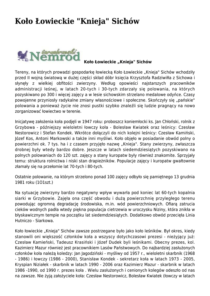 Koło Łowieckie "Knieja" Sichów Koło Łowieckie „Knieja" Sichów Tereny, na których prowadzi gospodarkę łowiecką Koło Łowieckie „Knieja" Sichów wchodziły przed II wojną światową w dużej części skład dóbr księcia Krzysztofa Radziwiłła z Sichowa i słynęły z wielkiej obfitości zwierzyny. Według opowieści najstarszych pracowników administracji leśnej, w latach 20-tych i 30-tych zdarzały się polowania, na których pozyskiwano po 300 i więcej zajęcy a w lesie sichowskim strzelano medalowe odyńce. Czasy powojenne przyniosły radykalne zmiany własnościowe i społeczne. Skończyły się „pańskie" polowania a ponieważ życie nie znosi pustki szybko znaleźli się ludzie pragnący na nowo zorganizować łowiectwo w terenie. Inicjatywę założenia koła podjęli w 1947 roku: proboszcz koniemłocki ks. Jan Chłoński, rolnik z Grzybowa - późniejszy wieloletni łowczy koła - Bolesław Kwiatek oraz leśnicy: Czesław Nestorowicz i Stefan Kondek. Wkrótce dołączyli do nich kolejni leśnicy: Czesław Kamiński, Józef Kos, Antoni Markowski a także inni myśliwi. Koło objęło w posiadanie obwód polny o powierzchni ok. 7 tys. ha i z czasem przyjęło nazwę „Knieja". Stany zwierzyny, zwłaszcza drobnej były wtedy bardzo dobre. Jeszcze w latach siedemdziesiątych pozyskiwano na polnych polowaniach do 120 szt. zajęcy a stany kuropatw były również znakomite. Sprzyjały temu: struktura rolnictwa i niski stan drapieżników. Populacje zajęcy i kuropatw gwałtownie złamały się na przełomie lat 70-tych i 80-tych. Ostatnie polowanie, na którym strzelono ponad 100 zajęcy odbyło się pamiętnego 13 grudnia 1981 roku (1O1szt.) Na sytuację zwierzyny bardzo negatywny wpływ wywarła pod koniec lat 60-tych kopalnia siarki w Grzybowie. Zajęła ona część obwodu i dużą powierzchnię przyległego terenu powodując ogromną degradację środowiska, m.in. wód powierzchniowych. Ofiarą zatrucia cieków wodnych padła wtedy piękna populacja cietrzewia w uroczysku Niziny, która znikła w błyskawicznym tempie na początku lat siedemdziesiątych. Dodatkowo obwód przecięła Linia Hutniczo - Siarkowa. Koło łowieckie „Knieja" Sichów zawsze postrzegane było jako koło leśników. Był okres, kiedy stanowili oni większość członków koła a wszyscy dotychczasowi prezesi - nieżyjący już: Czesław Kamieński, Tadeusz Krasiński i Józef Dudek byli leśnikami. Obecny prezes, kol. Kazimierz Mazur również jest pracownikiem Lasów Państwowych. Do najbardziej zasłużonych członków koła należą koledzy: Jan Jagodziński - myśliwy od 1957 r., wieloletni skarbnik (1968 - 1986) i łowczy (1986 - 2000), Stanisław Kondek - sekretarz koła w latach 1973 - 2005, Kryspian Niziałek - skarbnik w latach 1990 - 2006 oraz Kazimierz Mazur - skarbnik w latach 1986 -1990, od 1990 r. prezes koła . Wielu zasłużonych i cenionych kolegów odeszło od nas na zawsze. Nie żyją założyciele koła: Czesław Nestorowicz, Bolesław Kwiatek (łowczy w latach 1956 - 1973), Stefan Kondek, Antoni Markowski, Józef Kos, Czesław Kamieński (prezes do 1960 roku) a także : Tadeusz Krasiński (prezes w latach 1960 - 1987), Józef Dudek (prezes w latach 1987 - 1990), Henryk Rajca i Jan Mazur. Pozostaną na zawsze w naszej wdzięcznej pamięci. Obecnie koło dzierżawi ten sam obwód łowiecki nr 90 (aktualnie 176) o powierzchni 7 tys. ha, w tym 2750 ha powierzchni leśnej. Coraz większe znaczenie zaczyna odgrywać zwierzyna gruba. W kompleksach leśnych na stałe zadomowiły się łosie i jelenie, stan saren i dzików utrzymuje się na dość wysokim poziomie. W ostatnich latach średnio w sezonie pozyskuje się: jelenie - 3 szt, sarny - 30 szt., dziki - 15 szt. Obecność zwierzyny grubej powoduje wzrost szkód łowieckich a co za tym idzie odszkodowań wypłacanych rolnikom. Budżet koła ratują polowania dewizowe, na których myśliwi zagraniczni strzelają co roku po kilkanaście rogaczy. Czyni się starania w celu poprawy sytuacji zwierzyny drobnej. Od kilku lat wypuszcza się do łowiska po 100 szt. bażantów, prowadząc jednocześnie intensywne dokarmianie od wczesnej jesieni do wiosny. Pozytywne efekty tej działalności widać podczas październikowych polowań. Bardzo powoli poprawia się stan kuropatw, pomimo, że zaprzestano polowań na nie ponad dwudziestu laty. Podobnie przedstawia się sytuacja zajęcy. Ocenia się, że obecny stan zajęcy w obwodzie stanowi zaledwie ok. 10 % stanów z lat 70-tych ubiegłego wieku. Przyczyny tej sytuacji są powszechnie znane i borykają się z nimi wszystkie koła: kontrowersyjna metoda walki z wścieklizną poprzez szczepienie lisów doprowadziła do rozmnożenia populacji tego drapieżnika do niebywałych rozmiarów nawet bardziej intensywny odstrzał nie przynosi spodziewanych efektów. Sytuację pogarsza duża ilość drapieżników skrzydlatych i kruków, które gniazdują we wszystkich kompleksach leśnych. Koło Łowieckie „Knieja" Sichów liczy obecnie 25 członków, którymi kieruje zarząd w składzie: prezes - Kazimierz Mazur, łowczy - Ryszard Krasiński, skarbnik - Dominik Góra, Sekretarz Kazimierz Kondek. Na terenie obwodu wybudowano: 34 paśniki, 31 lizawek, 18 posypów i 9 ambon, w czasie śnieżnych zim wystawia się ok. 30 budek dla kuropatw. W kompleksie leśnym Sichów koło uprawia 1,5 ha poletek żerowych, obsiewa kukurydzą pas zaporowy długości ok. 1 km. W okresie zimowym prowadzi się intensywne dokarmianie. Przeciętnie wykłada się rocznie ok. 3 t. karmy objętościowej suchej - lucerna z własnej uprawy, ok. 2,5 tony karmy soczystej, ok. 4 tony karmy treściwej i ok. 0,5 tony soli. We wszystkich pracach gospodarczych bierze udiał większość członków koła ale na szczególne wyróżnienie zasługują: łowczy kol. Ryszard Karasiński oraz koledzy: Jerzy Kos - wieloletni członek komisji rewizyjnej i strażnik łowiecki oraz Wiesław Kotlarz. Za swoje poświęcenie i pracę na rz