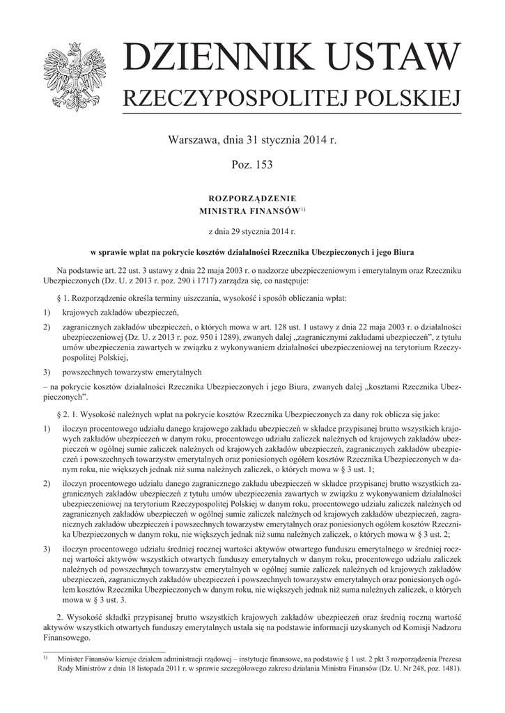 DZIENNIK USTAW RZECZYPOSPOLITEJ POLSKIEJ Warszawa, dnia 31 stycznia 2014 r. Poz. 153 Rozporządzenie Ministra Finansów 1) z dnia 29 stycznia 2014 r. w sprawie wpłat na pokrycie kosztów działalności Rzecznika Ubezpieczonych i jego Biura Na podstawie art. 22 ust. 3 ustawy z dnia 22 maja 2003 r. o nadzorze ubezpieczeniowym i emerytalnym oraz Rzeczniku Ubezpieczonych (Dz. U. z 2013 r. poz. 290 i 1717) zarządza się, co następuje: § 1. Rozporządzenie określa terminy uiszczania, wysokość i sposób obliczania wpłat: 1) krajowych zakładów ubezpieczeń, 2) zagranicznych zakładów ubezpieczeń, o których mowa w art. 128 ust. 1 ustawy z dnia 22 maja 2003 r. o działalności ubezpieczeniowej (Dz. U. z 2013 r. poz. 950 i 1289), zwanych dalej „zagranicznymi zakładami ubezpieczeń”, z tytułu umów ubezpieczenia zawartych w związku z wykonywaniem działalności ubezpieczeniowej na terytorium Rzeczypospolitej Polskiej, 3) powszechnych towarzystw emerytalnych – na pokrycie kosztów działalności Rzecznika Ubezpieczonych i jego Biura, zwanych dalej „kosztami Rzecznika Ubezpieczonych”. § 2. 1. Wysokość należnych wpłat na pokrycie kosztów Rzecznika Ubezpieczonych za dany rok oblicza się jako: 1) iloczyn procentowego udziału danego krajowego zakładu ubezpieczeń w składce przypisanej brutto wszystkich krajowych zakładów ubezpieczeń w danym roku, procentowego udziału zaliczek należnych od krajowych zakładów ubezpieczeń w ogólnej sumie zaliczek należnych od krajowych zakładów ubezpieczeń, zagranicznych zakładów ubezpieczeń i powszechnych towarzystw emerytalnych oraz poniesionych ogółem kosztów Rzecznika Ubezpieczonych w danym roku, nie większych jednak niż suma należnych zaliczek, o których mowa w § 3 ust. 1; 2) iloczyn procentowego udziału danego zagranicznego zakładu ubezpieczeń w składce przypisanej brutto wszystkich zagranicznych zakładów ubezpieczeń z tytułu umów ubezpieczenia zawartych w związku z wykonywaniem działalności ubezpieczeniowej na terytorium Rzeczypospolitej Polskiej w danym roku, procentowego udziału zaliczek należnych od zagranicznych zakładów ubezpieczeń w ogólnej sumie zaliczek należnych od krajowych zakładów ubezpieczeń, zagranicznych zakładów ubezpieczeń i powszechnych towarzystw emerytalnych oraz poniesionych ogółem kosztów Rzecznika Ubezpieczonych w danym roku, nie większych jednak niż suma należnych zaliczek, o których mowa w § 3 ust. 2; 3) iloczyn procentowego udziału średniej rocznej wartości aktywów otwartego funduszu emerytalnego w średniej rocznej wartości aktywów wszystkich otwartych funduszy emerytalnych w danym roku, procentowego udziału zaliczek należnych od powszechnych towarzystw emerytalnych w ogólnej sumie zaliczek należnych od krajowych zakładów ubezpieczeń, zagranicznych zakładów ubezpieczeń i powszechnych towarzystw emerytalnych oraz poniesionych ogółem kosztów Rzecznika Ubezpieczonych w danym roku, nie większych jednak niż suma należnych zaliczek, o których mowa w § 3 ust. 3. 2. Wysokość składki przypisanej brutto wszystkich krajowych zakładów ubezpieczeń oraz średnią roczną wartość aktywów wszystkich otwartych funduszy emerytalnych ustala się na podstawie informacji uzyskanych od Komisji Nadzoru Finansowego. 1) Minister Finansów kieruje działem administracji rządowej – instytucje finansowe, na podstawie § 1 ust. 2 pkt 3 rozporządzenia Prezesa Rady Ministrów z dnia 18 listopada 2011 r. w sprawie szczegółowego zakresu działania Ministra Finansów (Dz. U. Nr 248, poz. 1481). Dziennik Ustaw –2– Poz. 153 3. Wysokość składki przypisanej brutto wszystkich zagranicznych zakładów ubezpieczeń z tytułu umów ubezpieczenia zawartych w związku z wykonywaniem działalności ubezpieczeniowej na terytorium Rzeczypospolitej Polskiej ustala się na podstawie informacji uzyskanych od zagranicznych zakładów ubezpieczeń. 4. Informacje, o których mowa w ust. 3, zagraniczne zakłady ubezpieczeń przekazują Rzecznikowi Ubezpieczonych w terminie do dnia 15 lipca następnego roku. 5. Wysokość ogólnych kosztów Rzecznika Ubezpieczonych ustala się na podstawie informacji uzyskanych od Rzecznika Ubezpieczonych. § 3. 1. Krajowy zakład ubezpieczeń ustala co miesiąc zaliczkę na poczet kosztów Rzecznika Ubezpieczonych w wysokości 0,01% sumy składek przypisanych brutto w miesiącu poprzedzającym miesiąc, za który jest uiszczana zaliczka. 2. Zagraniczny zakład ubezpieczeń ustala co miesiąc zaliczkę na poczet kosztów Rzecznika Ubezpieczonych w wysokości 0,01% sumy składek przypisanych brutto z tytułu umów ubezpieczenia zawartych w związku z wykonywaniem działalności ubezpieczeniowej na terytorium Rzeczypospolitej Polskiej w miesiącu poprzedzającym miesiąc, za który jest uiszczana zaliczka. 3. Powszechne towarzystwo emerytalne ustala co miesiąc zaliczkę na poczet kosztów Rzecznika Ubezpieczonych w wysokości 1/12 kwoty stanowiącej iloczyn stawki 0,0008% i średniej rocznej wartości aktywów otwartego funduszu emerytalnego zarządzanego przez to powszechne towarzystwo emerytalne. 4. Zaliczki, o których mowa w ust. 1 i 2, krajowy zakład ubezpieczeń albo zagraniczny zakład ubezpieczeń wpłacają za każdy miesiąc najpóźniej do końca tego miesiąca i jednocześnie informują Rzecznika Ubezpieczonych o podstawie ich naliczenia, okresie, którego dotyczą, oraz ich wysokości. 5. Zaliczkę, o której mowa w ust. 3, powszechne towarzystwo emerytalne wpłaca za każdy miesiąc najpóźniej do końca następnego miesiąca i jednocześnie informuje Rzecznika Ubezpieczonych o podstawie jej naliczenia, okresie, którego dotyczy, oraz jej wysokości. 6. Zaliczki, o których mowa w ust. 1–3, za ostatnie trzy miesiące roku kalendarzowego krajowy zakład ubezpieczeń, zagraniczny zakład ubezpieczeń albo powszechne towarzystwo emerytalne wpłacają do dnia 31 października danego roku, w wysokości trzykrotno