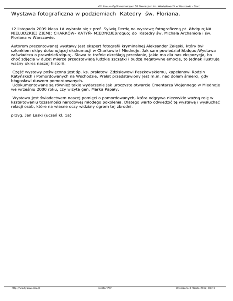 VIII Liceum Ogólnokształcące i 58 Gimnazjum im. Władysława IV w Warszawie - Start Wystawa fotograficzna w podziemiach Katedry św. Floriana. 12 listopada 2009 klasa 1A wybrała się z prof. Sylwią Derdą na wystawę fotograficzną pt. „NA NIELUDZKIEJ ZIEMI: CHARKÓW- KATYŃ- MIEDNOJE” do Katedry św. Michała Archanioła i św. Floriana w Warszawie. Autorem prezentowanej wystawy jest ekspert fotografii kryminalnej Aleksander Załęski, który był członkiem ekipy dokonującej ekshumacji w Charkowie i Miednoje. Jak sam powiedział „Wystawa zaświadcza o prawdzie”. Słowa te trafnie określają przesłanie, jakie ma dla nas ekspozycja, bo choć zdjęcia w dużej mierze przedstawiają ludzkie szczątki i budzą negatywne emocje, to jednak ilustrują ważny okres naszej historii. Część wystawy poświęcona jest śp. ks. prałatowi Zdzisławowi Peszkowskiemu, kapelanowi Rodzin Katyńskich i Pomordowanych na Wschodzie. Prałat przedstawiony jest m.in. nad dołem śmierci, gdy błogosławi duszom pomordowanych. Udokumentowane są również takie wydarzenie jak uroczyste otwarcie Cmentarza Wojennego w Miednoje we wrześniu 2000 roku, czy wizyta gen. Marka Papały. Wystawa jest świadectwem naszej pomięci o pomordowanych, która odgrywa niezwykle ważną rolę w kształtowaniu tożsamości narodowej młodego pokolenia. Dlatego warto odwiedzić tę wystawę i wysłuchać relacji osób, które na własne oczy widziały ogrom tej zbrodni. przyg. Jan Łaski (uczeń kl. 1a) http://wladyslaw.edu.pl Kreator PDF Utworzono 3 March, 2017, 09:19