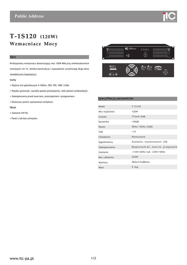 Public Address T-1S120 (120W) Wzmacniacz Mocy T-1S120 Opis Profesjonalny wzmacniacz dostarczaj¹cy moc 120W RMS przy zniekszta³ceniach mniejszych ni¿ 1%. Solidna konstrukcja i wyposa¿enie umo¿liwiaj¹ d³ugi okres INPUTS OUTPUTS niezak³óconej eksploatacji. Cechy Wyjcia linii g³onikowych 4-16Ohm, 50V, 70V, 100V i COM. Wysoka sprawnoæ, szerokie pasmo przenoszenia, niski poziom zniekszta³ceñ. Zabezpieczenia przed zwarciem, przeci¹¿eniem i przegrzaniem. Specyfikacja parametrów Skuteczny system wymuszonej wentylacji. Opcje Zasilanie 24V DC. Panel z lub bez uchwytów. www.itc-pa.pl 1/2 Model T- 1 S 1 2 0 Moc wyjciowa 120W Czu³oæ 775mV/0dB Dynamika >90dB Pasmo 50Hz-15kHz (2dB) THD <1% Ch³odzenie Wy m u s z o n e Sygnalizatory Zasilanie, wysterowanie: LED Zabezpieczenia Bezpiecznik AC, zwarcie, przegrzanie Zasilanie -110V/60Hz lub -230V/50Hz Moc ca³kowita 220W Wymiary 484x315x88mm Masa 9.3kg Public Address Panel frontowy T-1S120 Tylny Panel 4~16 Po³¹czenia Odtwarzacz CD T-6221 T-6201 Wzmacniacz miksuj¹cy MIC T-521 Wzmacniacz mocy 4~16 Audio www.itc-pa.pl G³oniki 2/2