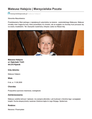 Mateusz Halejcio | Marzycielska Poczta marzycielskapoczta.pl /mateusz-halejcio/ Weronika Mazurkiewicz Przedstawiamy Wam jednego z największych optymistów na świecie - sześcioletniego Mateusza. Mateusz chciałby mieć magiczne buty, które pozwoliłyby mu chodzić, ale ze względu na chorobę musi poruszać się na wózku inwalidzkim. Ten niezwykle roześmiany chłopiec czeka na Wasze listy. Matuesz Halejcio ul. Dąbrówki 11d/3 44-210 Rybnik Imię dziecka: Mateusz Halejcio Wiek: 6 lat, ur. 11.06.2009 Choroba: Przepuklina oponowo-rdzeniowa, wodogłowie Zainteresowania: Mateusz uwielbia tańczyć i śpiewać, ma zacięcie aktorskie. Lubi budować z klocków lego i przeglądać książki. Kocha eksperymenty naukowe Ulubiona bajka to Lego Ninjago, Spiderman. Rodzice: Marzena i Przemysław Rodzeństwo: starszy brat Nikodem Mateusz urodził się z przepukliną oponowo-rdzeniową na odcinku lędźwiowo-krzyżowym (prościej ujmując - z rozszczepem kręgosłupa). Następstwem tej wady jest wodogłowie oraz połowiczne porażenie ciała. Mateuszek nie chodzi. Porusza się na wózku inwalidzkim. Syn jest pod stałą opieką wielu specjalistów takich jak: neurolog, okulista, urolog, ortopeda. Jest systematycznie rehabilitowany, aby zapobiegać pojawiającym się przykurczom oraz ćwiczyć prawidłową postawę ciała. Mateuszek uczęszcza do przedszkola integracyjnego. Jeśli chodzi o sprawność intelektualną jest w pełni zdrowym i bardzo kontaktowym dzieckiem. Uwielbia wspólne zabawy z dziećmi. Swój wolny czas najchętniej spędza bawiąc się ze swoim bratem. Mateusz jest bardzo energicznym i aktywnym chłopcem. Możemy powiedzieć, że wręcz zaraża swoim uśmiechem, a optymizmu można się od niego uczyć. :) O Marzycielskiej Poczcie dowiedziałam się od pań z przedszkola. To właśnie one zasugerowały, aby Mateusz dołączył do akcji. Myślę, że listy od Was sprawią mu wiele radości..
