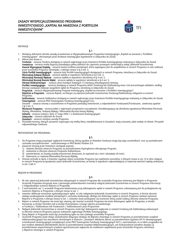 ZASADY WYSPECJALIZOWANEGO PROGRAMU INWESTYCYJNEGO „KAPITAŁ NA MARZENIA Z PORTFELEM INWESTYCYJNYM” DEFINICJE 1. 2. 3. § 1. Niniejszy dokument określa zasady uczestnictwa w Wyspecjalizowanym Programie Inwestycyjnym „Kapitał na marzenia z Portfelem Inwestycyjnym” oferowanym przez fundusze inwestycyjne wymienione w Załączniku do Zasad. Ilekroć jest mowa o: Funduszu - oznacza Fundusz dostępny w ramach wybranego przez Inwestora Portfela Inwestycyjnego wskazany w Załączniku do Zasad; Inwestorze - oznacza osobę fizyczną posiadającą pełną zdolność do czynności prawnych zamierzającą nabyć Jednostki Uczestnictwa; Kwocie Wymaganej Dopłaty - oznacza kwotę środków pieniężnych, która wymagana jest do uzupełnienia w ramach Programu w celu realizacji przez uczestnika Programu obowiązku, o którym mowa w § 4 ust. 2; Liście Portfeli Inwestycyjnych - oznacza listę Portfeli Inwestycyjnych dostępnych w ramach Programu, określoną w Załączniku do Zasad; Minimalnej Kolejnej Wpłacie - oznacza wpłatę w wysokości określonej w § 4 ust. 2; Minimalnej Pierwszej Wpłacie - oznacza wpłatę w wysokości określonej w § 4 ust. 2; Minimalnej Rocznej Kwocie Wpłat - oznacza wpłatę w wysokości określonej w § 4 ust. 2; Okresie Rozliczeniowym - oznacza okres każdych kolejnych 12 miesięcy obowiązywania Umowy; Portfelu Inwestycyjnym - oznacza dostępny w ramach Programu dobór Funduszy lub Subfunduszy wraz z ich procentowym udziałem, według którego następuje alokacja wszystkich wpłat do Programu, określony w Załączniku do Zasad; Programie - oznacza Wyspecjalizowany Program Inwestycyjny „Kapitał na marzenia z Portfelem Inwestycyjnym”; Rejestrze w Programie - oznacza Rejestr, na którym są zapisane Jednostki Uczestnictwa Funduszy/Subfunduszy nabywane w ramach Programu; Subfunduszu - oznacza Subfundusz dostępny w ramach wybranego przez Inwestora Portfela Inwestycyjnego wskazany w Załączniku do Zasad; Towarzystwie - oznacza PKO Towarzystwo Funduszy Inwestycyjnych S.A.; Umowie - oznacza umowę o uczestnictwo w Programie pomiędzy Inwestorem, a odpowiednimi Funduszami/Funduszem, zawieraną zgodnie z § 2 ust. 2; Wariancie Programu – oznacza jeden z wybranych programów oszczędzania, charakteryzujący się określoną wysokością Minimalnej Pierwszej Wpłaty, Minimalnej Kolejnej Wpłaty i Minimalnej Rocznej Kwoty Wpłaty; Ustawie - oznacza ustawę z dnia 27 maja 2004 r. o funduszach inwestycyjnych; Załączniku - oznacza załącznik do Zasad; Zasadach - oznacza niniejsze zasady Programu. Pozostałe terminy, których pisownia rozpoczyna się wielką literą, niezdefiniowane w Zasadach, mają znaczenie, jakie nadaje im Statut i Prospekt odpowiedniego Funduszu. PRZYSTĄPIENIE DO PROGRAMU 1. 2. 3. § 2. Do Programu mogą przystąpić wyłącznie Inwestorzy, którzy zgodnie ze Statutem Funduszu mogą być jego uczestnikami. oraz są posiadaczami rachunku oszczędnościowo - rozliczeniowego w PKO Banku Polskim S.A. Zawarcie Umowy przez Inwestora następuje poprzez: 1) złożenie Zlecenia otwarcia Programu za pośrednictwem Dystrybutora oferującego Program; 2) wskazanie w Zleceniu otwarcia Programu Subfunduszu; 3) potwierdzenie, że Zasady zostały Inwestorowi doręczone, że zapoznał się z nimi i akceptuje ich treść; 4) dokonanie co najmniej Minimalnej Pierwszej Wpłaty. Umowa wchodzi w życie, a Inwestor uzyskuje status uczestnika Programu (po spełnieniu warunków, o których mowa w ust. 2) w dniu nabycia w ramach Programu przynajmniej części Jednostki Uczestnictwa, za kwotę w wysokości odpowiadającej co najmniej wartości wpłaty wskazanej w ust. 2 pkt 4. REJESTR W PROGRAMIE 1. 2. 3. 4. 5. 6. 7. § 3. W celu rejestracji Jednostek Uczestnictwa nabywanych w ramach Programu dla uczestnika Programu otwierany jest Rejestr w Programie. Uczestnik Programu otrzymuje wraz z pierwszym potwierdzeniem transakcji nabycia Jednostek Uczestnictwa w ramach Programu informację o indywidualnym numerze Rejestru w Programie. Z zastrzeżeniem ust. 3, uczestnik Programu każdorazowo przy dokonywaniu wpłat w ramach Programu, zobowiązany jest do posługiwania się numerem Rejestru w Programie, o którym mowa w ust. 1. Inwestor deklaruje wnoszenie systematycznych wpłat w celu nabywania Jednostek Uczestnictwa w ramach Programu, w formie zlecenia stałego przekazywania środków pieniężnych z rachunku bankowego, dlatego też dokonując wpłat w ramach Programu zamiast numerem Rejestru w Programie, o którym mowa w ust. 1, Inwestor może posługiwać się numerem, który został nadany Zleceniu otwarcia Programu. Rejestr w ramach Programu nie może być otwarty, jak również uczestnik Programu nie może dokonywać wpłat do Programu, w drodze Konwersji, w drodze Transferu lub w drodze Przeniesienia z innego rejestru prowadzonego w Funduszu / Subfunduszu lub Funduszach / Subfunduszach poza Programem. Nabycie Jednostek Uczestnictwa w ramach Programu może być dokonywane wyłącznie w ramach Funduszy lub Subfunduszy wskazanych w Zleceniu otwarcia Programu poprzez wskazanie wybranego Portfela Inwestycyjnego. Dany Rejestr w Programie może być prowadzony tylko na rzecz jednego uczestnika Programu. Uczestnik Programu może złożyć oświadczenie dotyczące dostępu do Rejestru otwartego w ramach Programu za pośrednictwem urządzeń telekomunikacyjnych (na warunkach określonych w Statucie i „Zasadach składania Zleceń za pośrednictwem Systemu IAT FI obowiązującymi w funduszach inwestycyjnych zarządzanych przez PKO Towarzystwo Funduszy Inwestycyjnych SA”), z zastrzeżeniem, że w takim przypadku nie jest możliwe składanie jakichkolwiek Zleceń za pośrednictwem urządzeń telekomunikacyjnych, zaś funkcjonalność kanałów dostępu za pośrednictwem wspomnianych urządzeń ograniczona jest wyłącznie do możliwości uzyskiwania przez Uczestnika Programu informacji o Rejestrze otwartym w ramach Programu. NABYWANIE JEDNOSTEK UCZESTNICTWA 1. 2. 3. 4. 5. 6. 7. 8