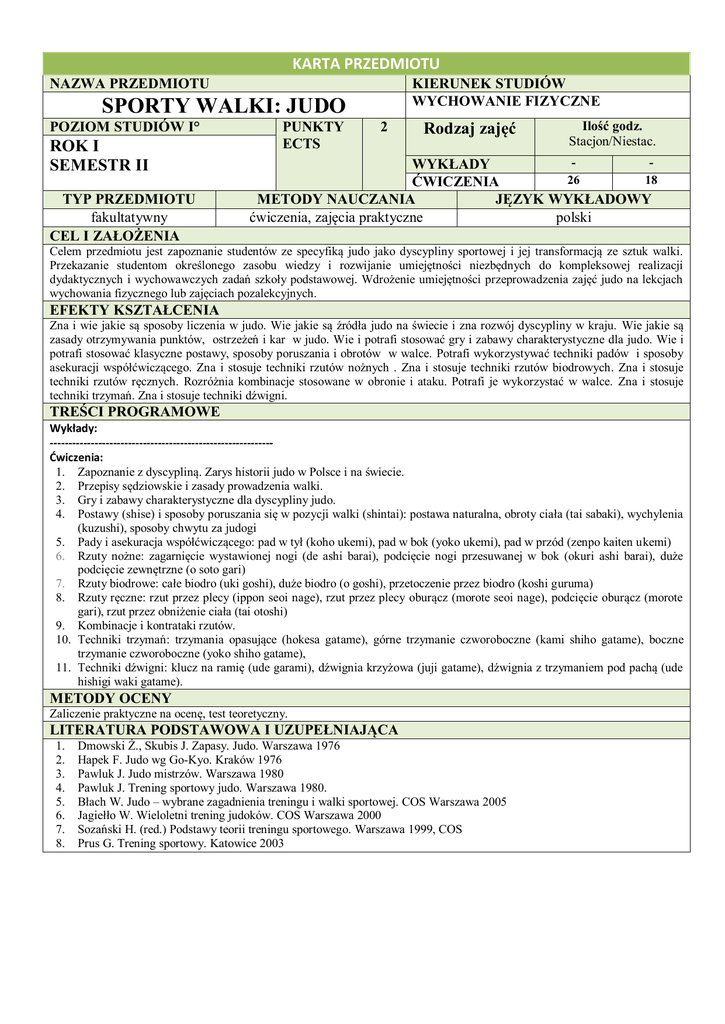 KARTA PRZEDMIOTU KIERUNEK STUDIÓW WYCHOWANIE FIZYCZNE NAZWA PRZEDMIOTU SPORTY WALKI: JUDO POZIOM STUDIÓW I° ROK I SEMESTR II TYP PRZEDMIOTU fakultatywny CEL I ZAŁOŻENIA PUNKTY ECTS 2 Rodzaj zajęć Ilość godz. Stacjon/Niestac. WYKŁADY 26 18 ĆWICZENIA METODY NAUCZANIA JĘZYK WYKŁADOWY ćwiczenia, zajęcia praktyczne polski Celem przedmiotu jest zapoznanie studentów ze specyfiką judo jako dyscypliny sportowej i jej transformacją ze sztuk walki. Przekazanie studentom określonego zasobu wiedzy i rozwijanie umiejętności niezbędnych do kompleksowej realizacji dydaktycznych i wychowawczych zadań szkoły podstawowej. Wdrożenie umiejętności przeprowadzenia zajęć judo na lekcjach wychowania fizycznego lub zajęciach pozalekcyjnych. EFEKTY KSZTAŁCENIA Zna i wie jakie są sposoby liczenia w judo. Wie jakie są źródła judo na świecie i zna rozwój dyscypliny w kraju. Wie jakie są zasady otrzymywania punktów, ostrzeżeń i kar w judo. Wie i potrafi stosować gry i zabawy charakterystyczne dla judo. Wie i potrafi stosować klasyczne postawy, sposoby poruszania i obrotów w walce. Potrafi wykorzystywać techniki padów i sposoby asekuracji współćwiczącego. Zna i stosuje techniki rzutów nożnych . Zna i stosuje techniki rzutów biodrowych. Zna i stosuje techniki rzutów ręcznych. Rozróżnia kombinacje stosowane w obronie i ataku. Potrafi je wykorzystać w walce. Zna i stosuje techniki trzymań. Zna i stosuje techniki dźwigni. TREŚCI PROGRAMOWE Wykłady: -----------------------------------------------------------Ćwiczenia: 1. Zapoznanie z dyscypliną. Zarys historii judo w Polsce i na świecie. 2. Przepisy sędziowskie i zasady prowadzenia walki. 3. Gry i zabawy charakterystyczne dla dyscypliny judo. 4. Postawy (shise) i sposoby poruszania się w pozycji walki (shintai): postawa naturalna, obroty ciała (tai sabaki), wychylenia (kuzushi), sposoby chwytu za judogi 5. Pady i asekuracja współćwiczącego: pad w tył (koho ukemi), pad w bok (yoko ukemi), pad w przód (zenpo kaiten ukemi) 6. Rzuty nożne: zagarnięcie wystawionej nogi (de ashi barai), podcięcie nogi przesuwanej w bok (okuri ashi barai), duże podcięcie zewnętrzne (o soto gari) 7. Rzuty biodrowe: całe biodro (uki goshi), duże biodro (o goshi), przetoczenie przez biodro (koshi guruma) 8. Rzuty ręczne: rzut przez plecy (ippon seoi nage), rzut przez plecy oburącz (morote seoi nage), podcięcie oburącz (morote gari), rzut przez obniżenie ciała (tai otoshi) 9. Kombinacje i kontrataki rzutów. 10. Techniki trzymań: trzymania opasujące (hokesa gatame), górne trzymanie czworoboczne (kami shiho gatame), boczne trzymanie czworoboczne (yoko shiho gatame), 11. Techniki dźwigni: klucz na ramię (ude garami), dźwignia krzyżowa (juji gatame), dźwignia z trzymaniem pod pachą (ude hishigi waki gatame). METODY OCENY Zaliczenie praktyczne na ocenę, test teoretyczny. LITERATURA PODSTAWOWA I UZUPEŁNIAJĄCA 1. 2. 3. 4. 5. 6. 7. 8. Dmowski Ż., Skubis J. Zapasy. Judo. Warszawa 1976 Hapek F. Judo wg Go-Kyo. Kraków 1976 Pawluk J. Judo mistrzów. Warszawa 1980 Pawluk J. Trening sportowy judo. Warszawa 1980. Błach W. Judo – wybrane zagadnienia treningu i walki sportowej. COS Warszawa 2005 Jagiełło W. Wieloletni trening judoków. COS Warszawa 2000 Sozański H. (red.) Podstawy teorii treningu sportowego. Warszawa 1999, COS Prus G. Trening sportowy. Katowice 2003
