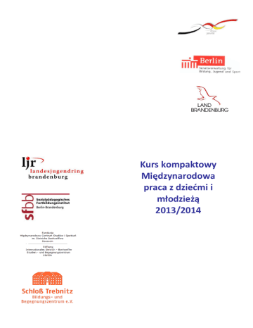 Kurs kompaktowy Międzynarodowa praca z dziećmi i młodzieżą 2013/2014 Grupa docelowa Niniejszy kurs kompaktowy skierowany jest do pełnoetatowych i działających społecznie pedagogów (socjalnych), współpracowników placówek zajmujących się pracą z dziećmi i młodzieżą, jak również do osób zaangażowanych w działania na rzecz dzieci i młodzieży z Polski, Brandenburgii oraz Berlina, którzy chcieliby zdobyć wiedzę i umiejętności w zakresie międzynarodowej pracy projektowej. Cele kursu Chcielibyśmy od A do Z towarzyszyć uczestnikom kursu w drodze prowadzącej do realizacji projektów międzynarodowych. Naszym celem jest dobre przygotowanie ich do międzynarodowej pracy z dziećmi i młodzieżą. W rozumieniu europejskiej strategii na rzecz młodzieży pragniemy wspierać uczestników kursu w zakotwiczeniu wymian międzynarodowych w ich codziennej pracy z dziećmi i młodzieżą. Korzyści gwarantowane uczestnikom: Rozwijanie indywidualnych umiejętności i kompetencji w dziedzinie: - kierowania projektami międzynarodowymi: w tym zgłębienie wiedzy z zakresu możliwości pozyskiwania środków projektowych, składania wniosków, kierowania zespołem i rozwiązywania konfliktów; - dynamiki grupy w przypadku grup międzynarodowych: uwrażliwienie na międzykulturowe procesy grupowe; możliwości kształtowania i wspierania komunikacji w grupie międzynarodowej; - know-how spotkań: repertuar metod na wszystkie fazy spotkań międzynarodowych / projektów międzynarodowych dla dzieci i młodzieży; - projekt praktyczny: organizacyjne i merytoryczne przygotowanie, realizacja i ewaluacja projektu międzynarodowego (w ramach interkulturowej pracy zespołowej: koncepcja, kalkulacja kosztów, składanie wniosku, planowanie programu, realizacja i ewaluacja projektu). PLUS: zrzeszenie w ramach sieci kontaktów: długoterminowe perspektywy wymiany koleżeńskiej oraz dzielenie się informacjami na temat pracy w obszarze międzynarodowym. Terminy i tematy Cały kurs obejmuje seminarium wprowadzające, cztery spotkania seminaryjne, realizację projektu praktycznego oraz sympozjum podsumowujące. SEMINARIUM WPROWADZAJĄCE - 3 dni*: 29.11.-01.12.2013, miejsce: Międzynarodowe Centrum Studiów i Spotkań im. Dietricha Bonhoeffera w Szczecinie: Tematy: poznanie się, integracja i tworzenie zespołu; praca nad oczekiwaniami oraz umową szkoleniową; treści merytoryczne szkolenia. 1. SPOTKANIE SEMINARYJNE - 3 dni: miejsce: 24-26.01.2014, miejsce: Ośrodek Kształcenia Młodzieży/ Jugendbildungsstätte Kaubstraße, Alte Feuerwache e.V. w Berlinie a) cześć teoretyczna: procesy grupowe zachodzące w międzynarodowej grupie dzieci i młodzieży oraz tematyczne interakcje; projekty dla dzieci i młodzieży oraz/lub spotkania dzieci i młodzieży; b) część praktyczna: metody kształtowania i wspierania kooperacji i interkulturowej komunikacji w grupie międzynarodowej. 2. SPOTKANIE SEMINARYJNE - 3 dni: 21-23.03.2014, miejsce: Centrum Studiów i Spotkań im. Dietricha Bonhoeffera w Szczecinie: Międzynarodowe a) część teoretyczna: zarządzanie projektami: spotkanie z przedstawicielami PNWM i programu Młodzież w Działaniu; inne możliwości pozyskiwania środków na międzynarodowe projekty dla dzieci i młodzieży; b) część praktyczna: symulacja składania wniosku, tworzenie się zespołów w celu realizacji projektów praktycznych. 3. SPOTKANIE SEMINARYJNE - 4 dni: 22.-25.5.2014, miejsce: Ośrodek Kształcenia i Spotkań Zamek Trebnitz w Trebnitz Mark: a) część teoretyczna: partycypacja, animacja językowa, interkulturowe uczenie się; b) część praktyczna: praca nad projektem praktycznym, wypróbowywanie metod stosowanych podczas spotkań w grupie polsko-niemieckiej, rozszerzanie własnego repertuaru metod: animacja językowa, praca nad biografiami, praca historyczna, praca z zagadnieniami krajoznawczymi. 4. SPOTKANIE SEMINARYJNE - 3 dni, 20.-22.06.2014, miejsce: Ośrodek Kształcenia i Spotkań Zamek Trebnitz w Trebnitz Mark: a) część teoretyczna: doradztwo w kwestiach układania programu, współpraca w interkulturowym zespole prowadzących, radzenie sobie z konfliktami; b) część praktyczna: praca nad projektem praktycznym. PROJEKT PRAKTYCZNY - 3 dni Realizacja własnego międzynarodowego projektu w mieszanych zespołach polskobrandenbursko-berlińskich. 5. SYMPOZJUM EWALUACYJNE - 4 dni, 25.-28.9.2014, miejsce: Pałacyk myśliwski Glienicke w Berlinie: a) ewaluacja projektów praktycznych z głównym naciskiem na: współpracę w interkulturowym zespole prowadzących, interkulturowy rozwój grup dziecięcych wzgl. młodzieżowych, zdobyte kompetencje i wiedzę b) prezentacja projektów praktycznych, uroczyste rozdanie certyfikatów, całościowa ewaluacja szkolenia, perspektywy na przyszłość, ustalenia pomiędzy uczestnikami kursu * 3 dni = 1. dzień: od godz. 14:00; 2 dzień: cały dzień; 3 dzień: do godz. 13:00 Certyfikat W przypadku owocnego i pełnowymiarowego uczestnictwa w kursie (ukończenie wszystkich seminariów i realizacja projektu praktycznego) uczestnicy kursu otrzymają certyfikat Społeczno-Pedagogicznego Instytutu Szkoleniowego Berlin Brandenburg (Sozialpädagogischen Fortbildungsinstituts Berlin Brandenburg, SFBB). Zespół referentów · Hannah-Maria Liedtke, mgr pedagogiki, trenerka PNWM · Joanna Bojanowska, nauczycielka, projektantka komunikacji, trenerka PNWM · Beata Rauch, referentka ds. edukacji w Centrum Edukacji i Spotkań Schloß Trebnitz e.V., trenerka PNWM Tłumaczenie Zapewniamy tłumaczenia podczas kursu. Opłaty Koszty uczestnictwa w całym kursie wynoszą1: dla uczestników Niemczech mieszkających w dla uczestników mieszkających w Polsce 450,00 euro (możliwość płatności w 350,00 euro (możliwość płatności w ratach) ratach) Całkowitą opłatę za uczestnictwo należy uiścić przez rozpoczęciem I spotkania seminaryjnego. W tym celu każdy z uczestników otrzyma na 14 dni przed rozpoczęciem I spotkania s