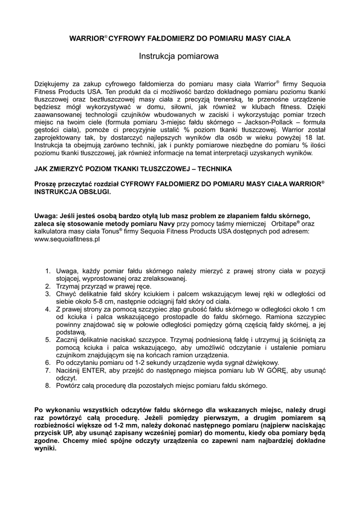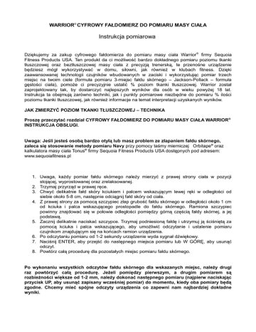 WARRIOR® CYFROWY FAŁDOMIERZ DO POMIARU MASY CIAŁA Instrukcja pomiarowa Dziękujemy za zakup cyfrowego fałdomierza do pomiaru masy ciała Warrior ® firmy Sequoia Fitness Products USA. Ten produkt da ci możliwość bardzo dokładnego pomiaru poziomu tkanki tłuszczowej oraz beztłuszczowej masy ciała z precyzją trenerską, te przenośne urządzenie będziesz mógł wykorzystywać w domu, siłowni, jak również w klubach fitness. Dzięki zaawansowanej technologii czujników wbudowanych w zaciski i wykorzystując pomiar trzech miejsc na twoim ciele (formuła pomiaru 3-miejsc fałdu skórnego – Jackson-Pollack – formuła gęstości ciała), pomoże ci precyzyjnie ustalić % poziom tkanki tłuszczowej. Warrior został zaprojektowany tak, by dostarczyć najlepszych wyników dla osób w wieku powyżej 18 lat. Instrukcja ta obejmują zarówno techniki, jak i punkty pomiarowe niezbędne do pomiaru % ilości poziomu tkanki tłuszczowej, jak również informacje na temat interpretacji uzyskanych wyników. JAK ZMIERZYĆ POZIOM TKANKI TŁUSZCZOWEJ – TECHNIKA Proszę przeczytać rozdział CYFROWY FAŁDOMIERZ DO POMIARU MASY CIAŁA WARRIOR ® INSTRUKCJA OBSŁUGI. Uwaga: Jeśli jesteś osobą bardzo otyłą lub masz problem ze złapaniem fałdu skórnego, zaleca się stosowanie metody pomiaru Navy przy pomocy taśmy mierniczej Orbitape® oraz kalkulatora masy ciała Tonus® firmy Sequoia Fitness Products USA dostępnych pod adresem: www.sequoiafitness.pl 1. Uwaga, każdy pomiar fałdu skórnego należy mierzyć z prawej strony ciała w pozycji stojącej, wyprostowanej oraz zrelaksowanej. 2. Trzymaj przyrząd w prawej ręce. 3. Chwyć delikatnie fałd skóry kciukiem i palcem wskazującym lewej ręki w odległości od siebie około 5-8 cm, następnie odciągnij fałd skóry od ciała. 4. Z prawej strony za pomocą szczypiec złap grubość fałdu skórnego w odległości około 1 cm od kciuka i palca wskazującego prostopadle do fałdu skórnego. Ramiona szczypiec powinny znajdować się w połowie odległości pomiędzy górną częścią fałdy skórnej, a jej podstawą. 5. Zacznij delikatnie naciskać szczypce. Trzymaj podniesioną fałdę i utrzymuj ją ściśniętą za pomocą kciuka i palca wskazującego, aby umożliwić odczytanie i ustalenie pomiaru czujnikom znajdującym się na końcach ramion urządzenia. 6. Po odczytaniu pomiaru od 1-2 sekundy urządzenie wyda sygnał dźwiękowy. 7. Naciśnij ENTER, aby przejść do następnego miejsca pomiaru lub W GÓRĘ, aby usunąć odczyt. 8. Powtórz całą procedurę dla pozostałych miejsc pomiaru fałdu skórnego. Po wykonaniu wszystkich odczytów fałdu skórnego dla wskazanych miejsc, należy drugi raz powtórzyć całą procedurę. Jeżeli pomiędzy pierwszym, a drugim pomiarem są rozbieżności większe od 1-2 mm, należy dokonać następnego pomiaru (najpierw naciskając przycisk UP, aby usunąć zapisany wcześniej pomiar) do momentu, kiedy oba pomiary będą zgodne. Chcemy mieć spójne odczyty urządzenia co zapewni nam najbardziej dokładne wyniki. LOKALIZACJA DOKONYWANIA POMIARU – MĘŻCZYŹNI Klatka piersiowa: Pomiar fałdu skóry dokonujemy w linii PRZEKĄTNEJ pomiędzy brodawką piersiową, a przodem dołu pachowego. Miejsce pomiaru znajduje się w połowie tej odległości. Brzuch: Pomiar dokonujemy w linii PIONOWEJ chwytając fałd skóry, miejsce pomiaru znajduje się w okolicy 2 cm na prawo od pępka. Udo: Pomiar dokonujemy w linii PIONOWEJ, fałd skóry należy chwycić wzdłuż linii środkowej przedniej powierzchni uda w połowie jego odległości tzn. pomiędzy zagłębieniem pachwiny, a rzepką kolanową. LOKALIZACJA DOKONYWANIA POMIARU – KOBIETY Biodro: Pomiar dokonujemy w linii PRZEKĄTNEJ, fałd skóry należy chwycić tuż nad grzebieniem biodrowym. Udo: Pomiar dokonujemy w linii PIONOWEJ, fałd skóry należy chwycić wzdłuż linii środkowej przedniej powierzchni uda w połowie jego odległości tzn. pomiędzy zagłębieniem pachwiny, a rzepką kolanową. Mięsień trójgłowy ramienia (triceps): Pomiar dokonujemy w linii PIONOWEJ, fałd skóry chwytamy na tylnej powierzchni ramienia, w połowie odległości pomiędzy górną częścią ramienia (barkiem), a łokciem.