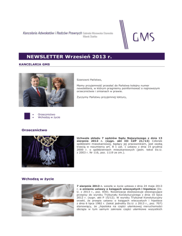 NEWSLETTER Wrzesień 2013 r. KANCELARIA GMS Szanowni Państwo, Mamy przyjemność przesłać do Państwa kolejny numer newslettera, w którym pragniemy poinformować o najnowszym orzecznictwie i zmianach w prawie. Życzymy Państwu przyjemnej lektury, Orzecznictwo Wchodzą w życie Orzecznictwo Uchwała składu 7 sędziów Sądu Najwyższego z dnia 13 sierpnia 2013 r. (sygn. akt III CZP 21/13) Członek spółdzielni mieszkaniowej, będący jej pracownikiem, jest osobą trzecią w rozumieniu art. 8 1 ust. 1 ustawy z dnia 15 grudnia 2000 r. o spółdzielniach mieszkaniowych (jedn. tekst Dz.U. z 2003 r. Nr 116, poz. 1119 ze zm.). Wchodzą w życie 7 sierpnia 2013 r. weszła w życie ustawa z dnia 24 maja 2013 r. o zmianie ustawy o księgach wieczystych i hipotece (Dz. U. z 2013 r., poz. 830). Nowelizacja dostosowuje obowiązujące przepisy do wyroku Trybunału Konstytucyjnego z dnia 10 lipca 2012 r. (sygn. akt P 15/12). W wyroku Trybunał Konstytucyjny orzekł, że przepis ustawy o księgach wieczystych i hipotece z dnia 6 lipca 1982 r. (tekst jednolity Dz.U. z 2013 r., poz. 707) stanowiący, że „hipoteka na części ułamkowej nieruchomości obciąża w tym samym zakresie części ułamkowe wszystkich nieruchomości utworzonych przez podział” jest niezgodny z Konstytucją Rzeczypospolitej Polskiej. Uwzględniając zarówno interesy wierzyciela hipotecznego, jak i współwłaścicieli nieruchomości niebędących dłużnikami – ustawodawca przewidział w nowelizacji, że hipoteka obciążająca część ułamkową nieruchomości po zniesieniu współwłasności przez współwłaściciela, którego udział był obciążony tą hipoteką, będzie obciążać tylko otrzymaną nieruchomość współwłaściciela – dłużnika. Oznacza to, że w przypadku zniesienia współwłasności poprzez podział nieruchomości, hipoteka będzie obciążać jedynie nieruchomość, którą otrzymał współwłaściciel – dłużnik. W przypadku, kiedy w wyniku podziału nieruchomości, współwłaściciel – dłużnik nie otrzyma żadnej nieruchomości lub też otrzyma nieruchomość o wartości mniejszej niż wynosił jego dotychczasowy udział w nieruchomości przed jej podziałem, wierzycielowi hipotecznemu będzie przysługiwało ustawowe prawo zastawu na wierzytelności, czyli należności jaką współwłaściciel – dłużnik otrzyma w przypadku spłaty lub dopłaty, która będzie przysługiwać współwłaścicielowi – dłużnikowi. Takie rozwiązanie ma na celu zabezpieczenie interesu wierzyciela hipotecznego przed zmniejszeniem wartości albo utratą zabezpieczenia jego prawa. Na podstawie nowelizacji została nadto wprowadzona zasada dotycząca pierwszeństwa ustawowego prawa zastawu powstałego wskutek wygaśnięcia prawa użytkowania wieczystego, które byłoby obciążone hipotekami. Ustawodawca przewidział, że o pierwszeństwie takiego ustawowego prawa zastawu rozstrzygać będzie pierwszeństwo hipotek, które obciążały prawo użytkowania wieczystego. 17 sierpnia 2013 r. weszła w życie nowelizacja ustawy w dnia 17 listopada 1964 r. – Kodeks postępowania cywilnego (Dz. U. z 2013 r., poz. 880). Celem nowelizacji jest zapewnienie zgodności z prawem Unii Europejskiej polskich przepisów dotyczących składania pism w postępowaniu sądowym przez strony postępowania cywilnego mające miejsce zamieszkania, zwykłego pobytu lub siedzibę w państwach członkowskich Unii Europejskiej, innych niż Polska, a także przepisów dotyczących doręczania pism takim stronom. Nowelizacja wprowadza zmianę zgodnie z którą również oddanie pisma procesowego w placówce pocztowej operatora świadczącego pocztowe usługi powszechne w innym państwie członkowskim Unii Europejskiej jest równoznaczne z wniesieniem go do sądu. Drugim z przepisów, które w wyniku nowelizacji dostosowano do zasad prawa Unii Europejskiej, jest regulacja odnosząca się do instytucji tzw. pełnomocnika do doręczeń. Zgodnie ze zmianami wprowadzonymi nowelizacją, obowiązek wskazywania pełnomocnika do doręczeń został ograniczony jedynie do przypadków, gdy dana strona postępowania cywilnego ma miejsce zamieszkania, pobytu lub siedzibę w państwie, które nie jest członkiem Unii Europejskiej, i gdy osoba ta nie ustanowiła jednocześnie zamieszkałego w Polsce pełnomocnika do prowadzenia sprawy. 23 sierpnia 2013 r. weszła w życie ustawa z dnia 13 czerwca 2013 r. o zmianie ustaw regulujących wykonywanie niektórych zawodów (Dz. U. z 2013 r. poz. 829). Celem ustawy jest deregulacja, czyli zmniejszenie ograniczeń w dostępie do ponad pięćdziesięciu różnych profesji. Najliczniejszymi zmianami, które wprowadza ustawa są ułatwienia dostępu do zawodów prawniczych takich jak adwokat, radca prawny, notariusz i komornik. W odniesieniu do tych profesji ustawa poszerza listę osób uprawnionych do przystąpienia do egzaminów zawodowych bez wymogu wcześniejszego odbycia aplikacji. Takie uprawnienie uzyskały osoby, które przez okres trzech lat były zatrudnione na określonych w ustawie stanowiskach. Ustawa poszerza również katalog osób uprawnionych do wpisu na listy adwokatów i radców prawnych bez konieczności odbycia odpowiedniej aplikacji i złożenia egzaminów zawodowych, a także katalog stanowisk, dzięki którym możliwe będzie uzyskanie uprawnień do powołania na stanowisko komornika sądowego. Znaczne zmiany objęły dostęp do zawodu notariusza – otóż ustawa znosi całkowicie obowiązek odbycia stażu zawodowego na stanowisku asesora notarialnego. Oznacza to, że od dnia wejścia w życie ustawy, notariuszem można zostać już po zdanym egzaminie zawodowym. Deregulacja obejmuje również zawody pośrednika w obrocie nieruchomościami i zarządcy nieruchomości. W odniesieniu do tych profesji zniesione zostały wszelkie wymagania w zakresie wykształcenia, odbytych praktyk oraz obowiązku zdania egzaminów. Zawody te może wykonywać każda osoba. Ułatwiony został 