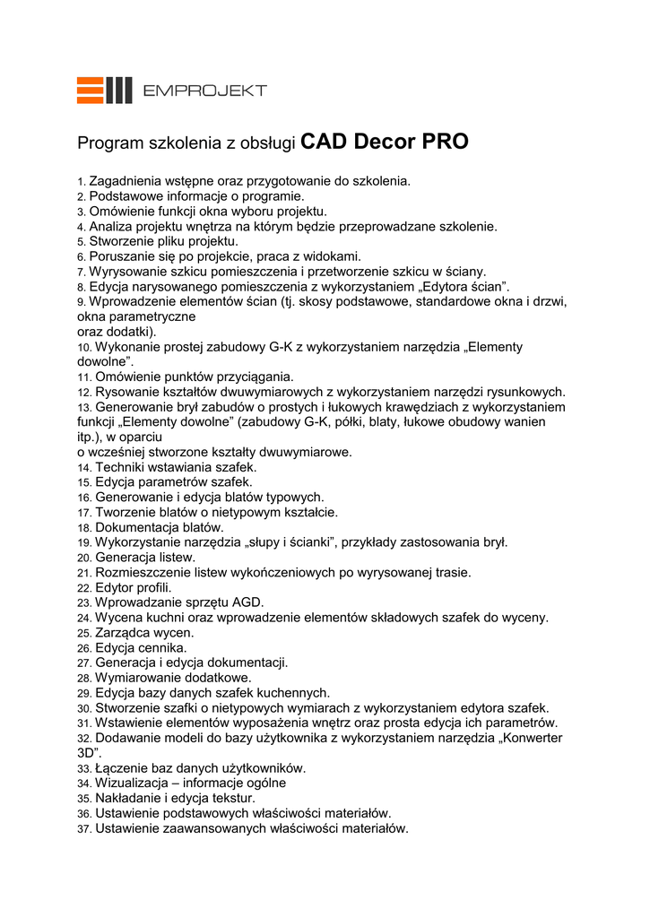 Program szkolenia z obsługi CAD Decor PRO 1. Zagadnienia wstępne oraz przygotowanie do szkolenia. 2. Podstawowe informacje o programie. 3. Omówienie funkcji okna wyboru projektu. 4. Analiza projektu wnętrza na którym będzie przeprowadzane szkolenie. 5. Stworzenie pliku projektu. 6. Poruszanie się po projekcie, praca z widokami. 7. Wyrysowanie szkicu pomieszczenia i przetworzenie szkicu w ściany. 8. Edycja narysowanego pomieszczenia z wykorzystaniem „Edytora ścian”. 9. Wprowadzenie elementów ścian (tj. skosy podstawowe, standardowe okna i drzwi, okna parametryczne oraz dodatki). 10. Wykonanie prostej zabudowy G-K z wykorzystaniem narzędzia „Elementy dowolne”. 11. Omówienie punktów przyciągania. 12. Rysowanie kształtów dwuwymiarowych z wykorzystaniem narzędzi rysunkowych. 13. Generowanie brył zabudów o prostych i łukowych krawędziach z wykorzystaniem funkcji „Elementy dowolne” (zabudowy G-K, półki, blaty, łukowe obudowy wanien itp.), w oparciu o wcześniej stworzone kształty dwuwymiarowe. 14. Techniki wstawiania szafek. 15. Edycja parametrów szafek. 16. Generowanie i edycja blatów typowych. 17. Tworzenie blatów o nietypowym kształcie. 18. Dokumentacja blatów. 19. Wykorzystanie narzędzia „słupy i ścianki”, przykłady zastosowania brył. 20. Generacja listew. 21. Rozmieszczenie listew wykończeniowych po wyrysowanej trasie. 22. Edytor profili. 23. Wprowadzanie sprzętu AGD. 24. Wycena kuchni oraz wprowadzenie elementów składowych szafek do wyceny. 25. Zarządca wycen. 26. Edycja cennika. 27. Generacja i edycja dokumentacji. 28. Wymiarowanie dodatkowe. 29. Edycja bazy danych szafek kuchennych. 30. Stworzenie szafki o nietypowych wymiarach z wykorzystaniem edytora szafek. 31. Wstawienie elementów wyposażenia wnętrz oraz prosta edycja ich parametrów. 32. Dodawanie modeli do bazy użytkownika z wykorzystaniem narzędzia „Konwerter 3D”. 33. Łączenie baz danych użytkowników. 34. Wizualizacja – informacje ogólne 35. Nakładanie i edycja tekstur. 36. Ustawienie podstawowych właściwości materiałów. 37. Ustawienie zaawansowanych właściwości materiałów. 38. Dodawanie tekstur własnych. 39. Wykorzystanie modułu farb firmy Tikkurila. 40. Wykorzystanie kolorów kuchennej bazy danych. Wymiana zestawów. 41. Nakładanie płytek ceramicznych z wykorzystaniem paska „Płytki” 42. Wymiana płytek. 43. Dodawanie płytek własnych z użyciem „Edytora Płytek”. 44. Osadzenie lustra pomiędzy płytkami, wprowadzenie listew dekoracyjnych. 45. Generacja występów na bazie naniesionych wcześniej płytek 46. Układy płytek – zasady tworzenia systemów modularnych. 47. Wycena płytek, definicja optymalizacji i zapasu płytek. 48. Generacja dokumentacji płytek. 49. Ustawienie parametrów świateł. 50. Definiowanie świateł halogenowych (natężenie, zakres, kąt, styl). 51. Wykonanie wizualizacji podstawowej z zapisem efektu w formacie JPG. 52. Wyjaśnienie zasad obliczeń Radiosity. 53. Różnica pomiędzy emisją podstawową a zaawansowaną. 54. Diagnostyka sceny. 55. Określenie zastosowań materiału dwustronnego. 56. Omówienie zakładek funkcji zaawansowanych. 57. Ustawienie parametrów Global Illumination. 58. Przeprowadzenie obliczeń Radiosity i wykonanie następujących zadań podczas działania procesu: • wizualizacji dziennej bez widoku za oknem; • wizualizacji nocnej; • zmiany parametrów świateł; • wizualizacji nocnej z widokiem za oknem; • wizualizacji dziennej ze światłem słonecznym oraz widokiem za oknem. 59. Definicja funkcji „Tonacji barwnych”. 60. Final Gathering – wyjaśnienie zastosowania. 61. Użycie opcji Raytracingu. 62. Funkcje i zapis ścieżki kamery. 63. Prezentacja projektu w postaci filmu AVI. 64. Wykonanie zdjęcia z wizualizacji i porównanie efektów z wizualizacją podstawową. 65. Rozkrój zaprojektowanej kuchni z wykorzystaniem programu CAD Rozkrój. 66. Sprawdzenie wiadomości i pytania własne.