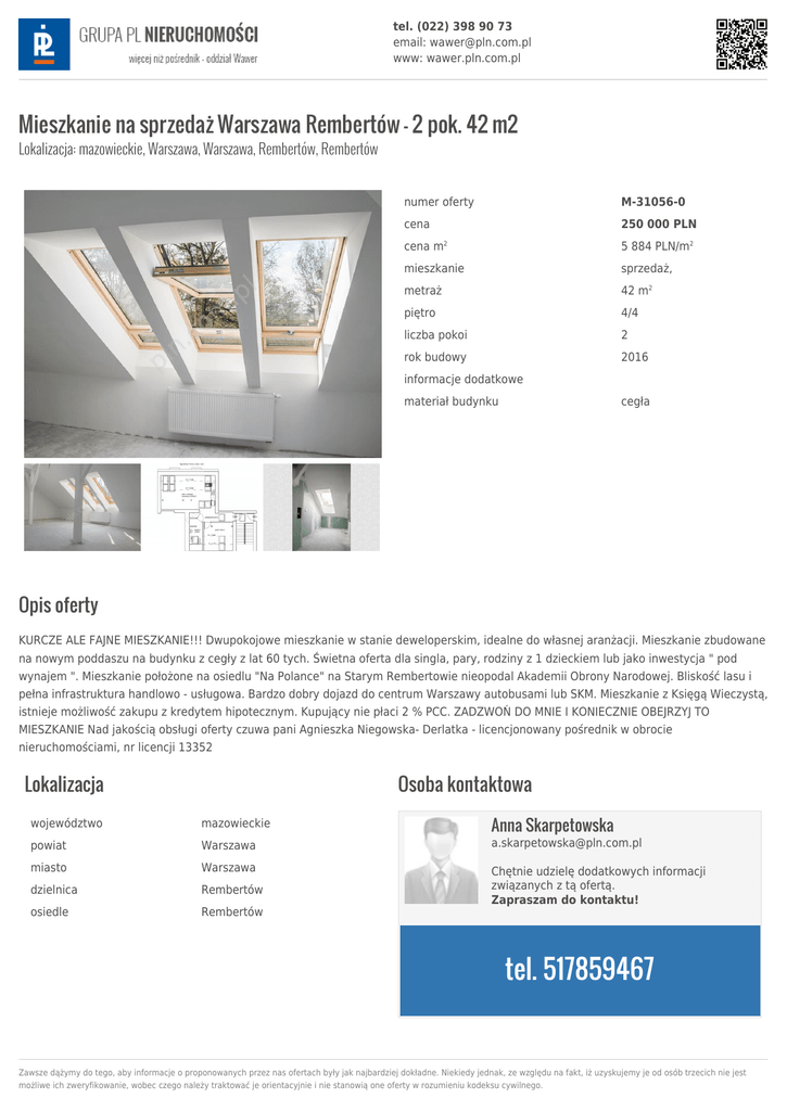 tel. (022) 398 90 73 email: [email protected] www: wawer.pln.com.pl Mieszkanie na sprzedaż Warszawa Rembertów - 2 pok. 42 m2 Lokalizacja: mazowieckie, Warszawa, Warszawa, Rembertów, Rembertów numer oferty M-31056-0 cena 250 000 PLN cena m 5 884 PLN/m2 mieszkanie sprzedaż, metraż 42 m2 piętro 4/4 liczba pokoi 2 rok budowy 2016 2 informacje dodatkowe materiał budynku cegła Opis oferty KURCZE ALE FAJNE MIESZKANIE!!! Dwupokojowe mieszkanie w stanie deweloperskim, idealne do własnej aranżacji. Mieszkanie zbudowane na nowym poddaszu na budynku z cegły z lat 60 tych. Świetna oferta dla singla, pary, rodziny z 1 dzieckiem lub jako inwestycja " pod wynajem ". Mieszkanie położone na osiedlu "Na Polance" na Starym Rembertowie nieopodal Akademii Obrony Narodowej. Bliskość lasu i pełna infrastruktura handlowo - usługowa. Bardzo dobry dojazd do centrum Warszawy autobusami lub SKM. Mieszkanie z Księgą Wieczystą, istnieje możliwość zakupu z kredytem hipotecznym. Kupujący nie płaci 2 % PCC. ZADZWOŃ DO MNIE I KONIECZNIE OBEJRZYJ TO MIESZKANIE Nad jakością obsługi oferty czuwa pani Agnieszka Niegowska- Derlatka - licencjonowany pośrednik w obrocie nieruchomościami, nr licencji 13352 Lokalizacja Osoba kontaktowa Anna Skarpetowska województwo mazowieckie powiat Warszawa [email protected] miasto Warszawa dzielnica Rembertów osiedle Rembertów Chętnie udzielę dodatkowych informacji związanych z tą ofertą. Zapraszam do kontaktu! tel. 517859467 Zawsze dążymy do tego, aby informacje o proponowanych przez nas ofertach były jak najbardziej dokładne. Niekiedy jednak, ze względu na fakt, iż uzyskujemy je od osób trzecich nie jest możliwe ich zweryfikowanie, wobec czego należy traktować je orientacyjnie i nie stanowią one oferty w rozumieniu kodeksu cywilnego.