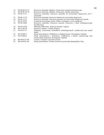 82 12. 13. 14. PN-B-06714-37 PN-B-06714-39 PN-B-11111 15. 16. 17. 18. PN-B-11112 PN-B-11113 PN-B-19701 PN-B-23004 19. 20. 21. PN-B-32250 PN-C-96170 PN-P-01715 22. 23. PN-S-96013 PN-S-96014 24. 25. BN-88/6731-08 BN-68/8931-04 Kruszywa mineralne. Badania. Oznaczanie rozpadu krzemianowego Kruszywa mineralne. Badania. Oznaczanie rozpadu Ŝelazawego Kruszywa mineralne. Kruszywa naturalne do nawierzchni drogowych; Ŝwir i mieszanka Kruszywa mineralne. Kruszywa łamane do nawierzchni drogowych Kruszywa mineralne. Kruszywa naturalne do nawierzchni drogowych; piasek Cement powszechnego uŜytku. Skład, wymagania i ocena zgodności Kruszywa mineralne. Kruszywa sztuczne. Kruszywa z ŜuŜla wielkopiecowego kawałkowego Materiały budowlane. Woda do betonów i zapraw Przetwory naftowe. Asfalty drogowe Włókniny. Zestawienie wskaźników technologicznych i uŜytkowych oraz metod badań Drogi samochodowe. Podbudowa z chudego betonu. Wymagania i badania Drogi samochodowe i lotniskowe. Podbudowa z betonu cementowego pod nawierzchnię ulepszoną. Wymagania i badania Cement. Transport i przechowywanie Drogi samochodowe. Pomiar równości nawierzchni planografem i łatą. 81 Spadki poprzeczne podbudowy na prostych i łukach powinny być zgodne z dokumentacją projektową z tolerancją ± 0,5 %. 6.4.5. Rzędne wysokościowe podbudowy RóŜnice pomiędzy rzędnymi wysokościowymi podbudowy i rzędnymi projektowanymi nie powinny przekraczać + 1 cm, -2 cm. 6.4.6. Ukształtowanie osi w planie Oś podbudowy w planie nie moŜe być przesunięta w stosunku do osi projektowanej o więcej niŜ ± 3 cm dla autostrad i dróg ekspresowych lub o więcej niŜ ± 5 cm dla pozostałych dróg. 6.4.7. Grubość podbudowy Grubość podbudowy nie moŜe róŜnić się od grubości projektowanej o więcej niŜ: - dla podbudowy zasadniczej ± 1 cm, - dla podbudowy pomocniczej +1 cm, -2 cm. 7. OBMIAR ROBÓT 7.1. Ogólne zasady obmiaru robót Ogólne zasady obmiaru robót podano w SST D-M-00.00.00 „Wymagania ogólne” pkt 7. 7.2. Jednostka obmiarowa Jednostką obmiarową jest m2 (metr kwadratowy) wykonanej podbudowy z betonu B-10. 8. ODBIÓR ROBÓT Ogólne zasady odbioru robót podano w SST D-M-00.00.00 „Wymagania ogólne” pkt 8. Roboty uznaje się za zgodne z dokumentacją projektową, SST i wymaganiami InŜyniera, jeŜeli wszystkie pomiary i badania z zachowaniem tolerancji wg pkt 6 dały wyniki pozytywne. 9. PODSTAWA PŁATNOŚCI 9.1. Ogólne ustalenia dotyczące podstawy płatności Ogólne ustalenia dotyczące podstawy płatności podano w SST D-M-00.00.00 „Wymagania ogólne” pkt 9. 9.2. Cena jednostki obmiarowej − − − − − − − − Cena wykonania 1 m2 podbudowy z betonu B-10 obejmuje: prace pomiarowe i roboty przygotowawcze, oznakowanie robót, dostarczenie materiałów, wyprodukowanie mieszanki i jej transport na miejsce wbudowania, dostarczenie, ustawienie, rozebranie i odwiezienie prowadnic oraz innych materiałów i urządzeń pomocniczych, rozłoŜenie i zagęszczenie mieszanki, ewentualne nacinanie szczelin, pielęgnacja wykonanej warstwy przeprowadzenie pomiarów i badań laboratoryjnych, wymaganych w specyfikacji technicznej. 10. PRZEPISY ZWIĄZANE 10.1. Normy 1. 2. 3. 4. 5. 6. 7. 8. 9. 10. PN-B-04300 PN-B-04481 PN-B-06250 PN-B-06714-12 PN-B-06714-13 PN-B-06714-15 PN-B-06714-16 PN-B-06714-18 PN-B-06714-19 PN-B-06714-26 11. PN-B-06714-28 Cement. Metody badań. Oznaczanie cech fizycznych Grunty budowlane. Badania laboratoryjne Beton zwykły Kruszywa mineralne. Badania. Oznaczanie zawartości zanieczyszczeń obcych Kruszywa mineralne. Badania. Oznaczanie zawartości pyłów mineralnych Kruszywa mineralne. Badania. Oznaczanie składu ziarnowego Kruszywa mineralne. Badania. Oznaczanie kształtu ziarn Kruszywa mineralne. Badania. Oznaczanie nasiąkliwości Kruszywa mineralne. Badania. Oznaczanie mrozoodporności metodą bezpośrednią Kruszywa mineralne. Badania. Oznaczanie zawartości zanieczyszczeń organicznych Kruszywa mineralne. Badania. Oznaczanie zawartości siarki metodą bromową 80 6.3.5. Grubość warstwy podbudowy Grubość warstwy naleŜy mierzyć bezpośrednio po jej zagęszczeniu. Grubość warstwy nie moŜe róŜnić się od grubości projektowanej o więcej niŜ ± 1 cm. 6.3.6. Badania kruszywa Właściwości kruszywa naleŜy badać przy kaŜdej zmianie rodzaju kruszywa i dla kaŜdej partii. Właściwości kruszywa powinny być zgodne z wymaganiami podanymi w tablicy 3 pkt 2.3. 6.3.7. Wytrzymałość na ściskanie Wytrzymałość na ściskanie określa się na próbkach walcowych o średnicy i wysokości 16,0 cm. Próbki do badań naleŜy pobierać z miejsc wybranych losowo, w świeŜo rozłoŜonej warstwie. Próbki w ilości 6 sztuk naleŜy formować i przechowywać zgodnie z normą PN-S-96013 [22]. Trzy próbki naleŜy badać po 7 dniach i trzy po 28 dniach przechowywania. 6.3.8. Badania cementu Dla kaŜdej dostawy cementu Wykonawca powinien określić właściwości podane w pkt 2.2 tablica 1. 6.3.9. Badanie wody W przypadkach wątpliwych naleŜy przeprowadzić badania wody według PN-B-32250 [19]. 6.3.10. Nasiąkliwość i mrozoodporność betonu Nasiąkliwość i mrozoodporność określa się po 28 dniach dojrzewania betonu, zgodnie z normą PN-B-06250 [3]. 6.4. Wymagania dotyczące cech geometrycznych podbudowy z chudego betonu 6.4.1. Częstotliwość oraz zakres badań i pomiarów Częstotliwość oraz zakres badań i pomiarów podaje tablica 5. Tablica 5. Częstotliwość oraz zakres badań i pomiarów wykonanej podbudowy z betonu B-10 Lp. Minimalna częstotliwość badań i pomiarów Wyszczególnienie badań i pomiarów 1 Szerokość podbudowy 10 razy na 1 km 2 Równość podłuŜna w sposób ciągły planografem albo co 20 m łatą na kaŜdym pasie ruchu 3 Równość poprzeczna 10 razy na 1 km ) 4 Spadki poprzeczne* 5 Rzędne wysokościowe 10 razy na 1 km Dla autostrad i dróg ekspresowych co ) 6 Ukształtowanie osi w planie* 7 Grubość podbudowy 25 m, dla pozostałych dr