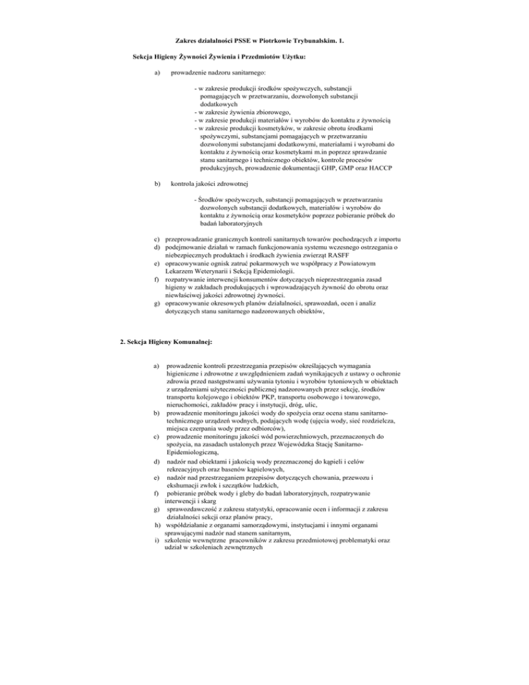 Zakres działalności PSSE w Piotrkowie Trybunalskim. 1. Sekcja Higieny Żywności Żywienia i Przedmiotów Użytku: a) prowadzenie nadzoru sanitarnego: - w zakresie produkcji środków spożywczych, substancji pomagających w przetwarzaniu, dozwolonych substancji dodatkowych - w zakresie żywienia zbiorowego, - w zakresie produkcji materiałów i wyrobów do kontaktu z żywnością - w zakresie produkcji kosmetyków, w zakresie obrotu środkami spożywczymi, substancjami pomagających w przetwarzaniu dozwolonymi substancjami dodatkowymi, materiałami i wyrobami do kontaktu z żywnością oraz kosmetykami m.in poprzez sprawdzanie stanu sanitarnego i technicznego obiektów, kontrole procesów produkcyjnych, prowadzenie dokumentacji GHP, GMP oraz HACCP b) kontrola jakości zdrowotnej - Środków spożywczych, substancji pomagających w przetwarzaniu dozwolonych substancji dodatkowych, materiałów i wyrobów do kontaktu z żywnością oraz kosmetyków poprzez pobieranie próbek do badań laboratoryjnych c) przeprowadzanie granicznych kontroli sanitarnych towarów pochodzących z importu d) podejmowanie działań w ramach funkcjonowania systemu wczesnego ostrzegania o niebezpiecznych produktach i środkach żywienia zwierząt RASFF e) opracowywanie ognisk zatruć pokarmowych we współpracy z Powiatowym Lekarzem Weterynarii i Sekcją Epidemiologii. f) rozpatrywanie interwencji konsumentów dotyczących nieprzestrzegania zasad higieny w zakładach produkujących i wprowadzających żywność do obrotu oraz niewłaściwej jakości zdrowotnej żywności. g) opracowywanie okresowych planów działalności, sprawozdań, ocen i analiz dotyczących stanu sanitarnego nadzorowanych obiektów, 2. Sekcja Higieny Komunalnej: a) b) c) d) e) f) g) h) i) prowadzenie kontroli przestrzegania przepisów określających wymagania higieniczne i zdrowotne z uwzględnieniem zadań wynikających z ustawy o ochronie zdrowia przed następstwami używania tytoniu i wyrobów tytoniowych w obiektach z urządzeniami użyteczności publicznej nadzorowanych przez sekcję, środków transportu kolejowego i obiektów PKP, transportu osobowego i towarowego, nieruchomości, zakładów pracy i instytucji, dróg, ulic, prowadzenie monitoringu jakości wody do spożycia oraz ocena stanu sanitarnotechnicznego urządzeń wodnych, podających wodę (ujęcia wody, sieć rozdzielcza, miejsca czerpania wody przez odbiorców), prowadzenie monitoringu jakości wód powierzchniowych, przeznaczonych do spożycia, na zasadach ustalonych przez Wojewódzka Stację SanitarnoEpidemiologiczną, nadzór nad obiektami i jakością wody przeznaczonej do kąpieli i celów rekreacyjnych oraz basenów kąpielowych, nadzór nad przestrzeganiem przepisów dotyczących chowania, przewozu i ekshumacji zwłok i szczątków ludzkich, pobieranie próbek wody i gleby do badań laboratoryjnych, rozpatrywanie interwencji i skarg sprawozdawczość z zakresu statystyki, opracowanie ocen i informacji z zakresu działalności sekcji oraz planów pracy, współdziałanie z organami samorządowymi, instytucjami i innymi organami sprawującymi nadzór nad stanem sanitarnym, szkolenie wewnętrzne pracowników z zakresu przedmiotowej problematyki oraz udział w szkoleniach zewnętrznych 3. Sekcja Higieny Pracy: a) kontrola warunków higienicznych i zdrowotnych środowiska pracy a zwłaszcza zapobieganie powstawania chorób zawodowych i innych chorób związanych z warunkami pracy, b) nadzór nad warunkami obrotu i stosowania prekursorów narkotyków kategorii 2 i 3 c) nadzór nad wytwarzaniem lub wprowadzaniem do obrotu środków zastępczych i nowych substancji psychoaktywnych d) nadzór nad warunkami obrotu i stosowania substancji, mieszanin niebezpiecznych i ich wyrobów e) Kontrola realizacji obowiązków nałożonych na pracodawcę zatrudniającego pracowników w warunkach narażenia na szkodliwe czynniki biologiczne, f) nadzór nad stosowaniem i obrotem środkami biobójczymi w zakresie określonym przez ustawę o produktach biobójczych, g) kontrola realizacji obowiązków nałożonych na pracodawcę zatrudniającego pracowników w warunkach narażenia na czynniki rakotwórcze, h) ocena warunków pracy i narażenia zawodowego w związku ze zgłoszonymi podejrzeniami chorób zawodowych i sporządzanie wymaganej dokumentacji oraz opracowanie decyzji, i) prowadzenie postępowania administracyjnego dotyczącego środowiska pracy, j) opracowanie planów, sprawozdań i analiz, k) rozpatrywanie składanych interwencji i skarg, l) prowadzenie prac problemowych wynikających z aktualnych potrzeb terenu, ł) współdziałanie z innymi komórkami organizacyjnymi Powiatowej Stacji Sanitarno- Epidemiologicznej, m) współpraca z innymi jednostkami nadzoru nad warunkami pracy, n) sporządzanie opracowań dla jednostek naukowo badawczych, samorządowych i innych; 4. Sekcja Epidemiologii: a) w zakresie nadzoru epidemiologicznego: - dokonywanie analiz i ocen sytuacji epidemiologicznej, - opracowywanie i wdrażanie programów i planów działań zapobiegawczych i przeciwepidemicznych, - opracowywanie chorób zakaźnych i ich ognisk, - udział w pracach problemowych podejmowanych przez Wojewódzką Stację Sanitarno- Epidemiologiczną w Łodzi, b) w zakresie szczepień ochronnych: - prowadzenie zaopatrzenia oraz nadzór nad dystrybucja i wykorzystaniem szczepionek, - nadzór nad wykonawstwem szczepień, - opracowywanie sprawozdań i analiz stanu uodpornienia dzieci i młodzieży, c) w zakresie nadzoru sanitarnego: - przeprowadzanie kontroli w podmiotach leczniczych w zakresie przestrzegania warunków wynikających z odrębnych przepisów, - opracowywanie ocen stanu sanitarnego podmiotów leczniczych oraz pracy zespołów do spraw zakażeń szpitalnych, d) przeprowadzanie szczepień i udział w szkoleniach z przedmiotowych spraw; 5. Sekcja Oświaty Zdrowotnej i Promocji Zdrowia: a) b) c) d) e) inicjowanie, organizowanie, koordynowanie i nadzorowanie działalności oświatowo- zdro