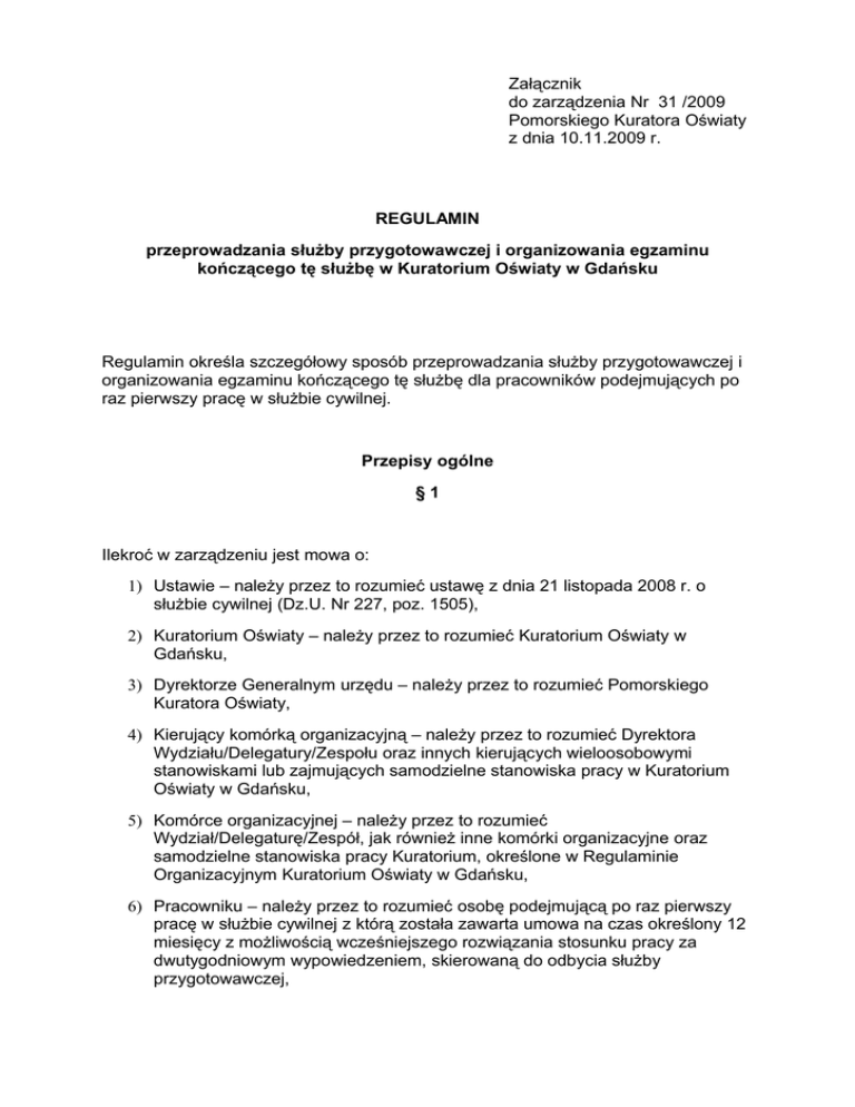 Załącznik do zarządzenia Nr 31 /2009 Pomorskiego Kuratora Oświaty z dnia 10.11.2009 r. REGULAMIN przeprowadzania służby przygotowawczej i organizowania egzaminu kończącego tę służbę w Kuratorium Oświaty w Gdańsku Regulamin określa szczegółowy sposób przeprowadzania służby przygotowawczej i organizowania egzaminu kończącego tę służbę dla pracowników podejmujących po raz pierwszy pracę w służbie cywilnej. Przepisy ogólne §1 Ilekroć w zarządzeniu jest mowa o: 1) Ustawie – należy przez to rozumieć ustawę z dnia 21 listopada 2008 r. o służbie cywilnej (Dz.U. Nr 227, poz. 1505), 2) Kuratorium Oświaty – należy przez to rozumieć Kuratorium Oświaty w Gdańsku, 3) Dyrektorze Generalnym urzędu – należy przez to rozumieć Pomorskiego Kuratora Oświaty, 4) Kierujący komórką organizacyjną – należy przez to rozumieć Dyrektora Wydziału/Delegatury/Zespołu oraz innych kierujących wieloosobowymi stanowiskami lub zajmujących samodzielne stanowiska pracy w Kuratorium Oświaty w Gdańsku, 5) Komórce organizacyjnej – należy przez to rozumieć Wydział/Delegaturę/Zespół, jak również inne komórki organizacyjne oraz samodzielne stanowiska pracy Kuratorium, określone w Regulaminie Organizacyjnym Kuratorium Oświaty w Gdańsku, 6) Pracowniku – należy przez to rozumieć osobę podejmującą po raz pierwszy pracę w służbie cywilnej z którą została zawarta umowa na czas określony 12 miesięcy z możliwością wcześniejszego rozwiązania stosunku pracy za dwutygodniowym wypowiedzeniem, skierowaną do odbycia służby przygotowawczej, Postanowienia ogólne §2 1. Każdy pracownik podejmujący po raz pierwszy pracę w służbie cywilnej, jest zobowiązany odbyć służbę przygotowawczą zakończoną egzaminem, z wyjątkiem pracowników, którzy zostali zwolnieni z obowiązku odbycia służby, na podstawie art. 36 ust. 6 i 7 ustawy. 2. Służba przygotowawcza ma na celu teoretyczne i praktyczne przygotowanie pracownika podejmującego po raz pierwszy pracę w służbie cywilnej do należytego wykonywania obowiązków służbowych. 3. Osobą podejmującą po raz pierwszy pracę w służbie cywilnej, jest osoba, która nie była wcześniej zatrudniona w służbie cywilnej na czas nieokreślony albo nie była zatrudniona na czas określony 12 miesięcy i nie otrzymała pozytywnej oceny, o której mowa w art. 37 ustawy, albo nie jest osobą zatrudnioną w służbie cywilnej na podstawie art. 34 ust. 1 ustawy. 4. Wszyscy pracownicy urzędu, w szczególności kierownicy jednostek organizacyjnych są zobowiązani do współdziałania w organizowaniu służby i przeprowadzania egzaminów. Czas trwania służby przygotowawczej §3 1. Do odbycia służby przygotowawczej kieruje się pracownika nie wcześniej niż po upływie 1 miesiąca od zatrudnienia i nie później niż przed upływem 5 miesiąca od zatrudnienia. 2. Służba przygotowawcza trwa nie dłużej niż 4 miesiące i kończy się nie później niż z upływem 8 miesięcy od podjęcia pracy przez pracownika. 3. Czas trwania służby jak i jej zakres uzależniony jest od poziomu wiedzy i kwalifikacji pracownika do wykonywania obowiązków wynikających z opisu zajmowanego stanowiska pracy, zdolności do nabywania umiejętności niezbędnych na zajmowanym stanowisku i dotychczasowego przebiegu zatrudnienia w urzędzie. 4. O terminie rozpoczęcia służby i okresie jej trwania decyduje dyrektor generalny urzędu, na podstawie opinii osoby kierującej komórką organizacyjną, w której pracownik jest zatrudniony. Przedmiotem opinii jest: 1) Poziom przygotowania pracownika do wykonywania obowiązków wynikających z opisu zajmowanego stanowiska pracy, 2) Proponowany zakres tematyczny służby przygotowawczej, 3) Proponowany termin odbywania służby przygotowawczej. 5. Opinia o której mowa w ust. 4 powinna być przekazana w terminie 1 miesiąca od dnia zatrudnienia osoby podejmującej po raz pierwszy pracę w Kuratorium Oświaty. 6. Wzór opinii o zakresie i terminie odbycia służby przygotowawczej stanowi załącznik nr 1 do Regulaminu. 7. Okres służby przygotowawczej ulega przedłużeniu o czas nieobecności pracownika w pracy. Skierowanie do odbycia służby przygotowawczej oraz warunki zwolnienia z obowiązku jej odbycia §4 1. Dyrektor generalny urzędu po otrzymaniu opinii, o której mowa w § 3 ust. 4 Regulaminu, podejmuje decyzję o: 1) Skierowaniu pracownika do odbywania służby przygotowawczej, lub 2) Zwolnieniu pracownika z obowiązku odbywania służby przygotowawczej. 2. Wzór skierowania do odbywania służby przygotowawczej stanowi załącznik nr 2 do Regulaminu. 3. Podjętą decyzję dyrektor generalny urzędu przekazuje Dyrektorowi Wydziału Organizacji, który doręcza ją niezwłocznie pracownikowi i kierownikowi komórki organizacyjnej, w której zatrudniony jest pracownik. 4. Bezpośredni nadzór na przebiegiem służby przygotowawczej i organizowaniem egzaminów dla pracowników sprawuje dyrektor generalny urzędu. 5. Pracownik może zostać zwolniony z obowiązku odbywania służby przygotowawczej, na umotywowany wniosek osoby kierującej komórką organizacyjną, w której pracownik jest zatrudniony, jeżeli jego wiedza lub umiejętności umożliwiają należyte wykonywanie obowiązków służbowych. 6. Zwolnienie z obowiązku odbywania służby przygotowawczej nie zwalnia z obowiązku przystąpienia do egzaminu kończącego służbę przygotowawczą. 7. O zwolnieniu z obowiązku odbywania służby przygotowawczej, pracownik zostaje powiadomiony na piśmie, przez pracownika kadr. 8. Wzór wniosku w sprawie zwolnienia, o którym mowa w ust. 1 pkt 2) stanowi załącznik nr 3 do Regulaminu. Zakres służby przygotowawczej §5 Służba przygotowawcza obejmuje: 1) Teoretyczne i praktyczne zapoznanie z organizacją i zasadami funkcjonowania Kuratorium Oświaty oraz komórki organizacyjnej w której pracownik jest zatrudniony, 2) Zapoznanie z podstawowymi aktami prawny
