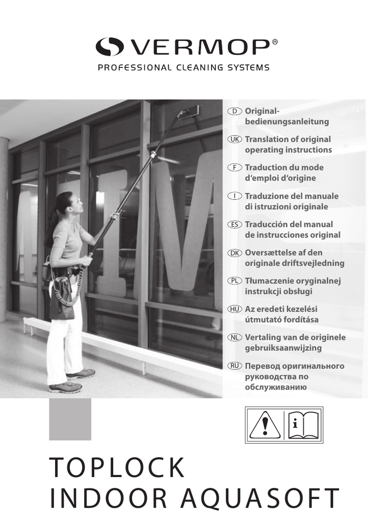 D Originalbedienungsanleitung UK Translation of original operating instructions F Traduction du mode d‘emploi d‘origine I Traduzione del manuale di istruzioni originale ES Traducción del manual de instrucciones original DK Oversættelse af den originale driftsvejledning PL Tłumaczenie oryginalnej instrukcji obsługi HU Az eredeti kezelési útmutató fordítása NL Vertaling van de originele gebruiksaanwijzing RU Перевод оригинального руководства по обслуживанию i TO P LO C K I N D O O R A Q UA S O F T [1.1] [1.2] 9 cm 24,5 cm 6 cm [1.1a] 10 cm [1.1b] [1.3] [1.4] [1.5] [2.1] a b [2.2] [2.3] [3.1] [3.2] b max a [3.3] [3.4] Uwaga! Urządzenia czyszczącego nie należy używać, zanim nie przeczyta się i zrozumie instrukcji obsługi. Instrukcję obsługi należy przechowywać ostrożnie, tak żeby była dostępna do sprawdzenia w każdej chwili. Bez wcześniejszego pisemnego pozwolenia firmy VERMOP przedstawionych tutaj informacji nie wolno powielać czy przetwarzać ani w formie elektronicznej, ani papierowej. Zastrzega się możliwość dokonywania zmian. Wszelkie prawa zastrzeżone. © 2012 VERMOP Salmon GmbH Objaśnienie oznaczeń Ostrzeżenie: Należy zachować ogólną ostrożność. Aby uniknąć awarii podczas działania i uszkodzeń urządzenia lub w jego pobliżu należy przestrzegać podanych wskazówek i metod postępowania. Porada: Oznacza użyteczne sposoby zastosowania. Informacje dotyczące akumulatora • Przestrzegać instrukcji użytkowania! • Zagrożenie wybuchem i pożarem! Unikać spięć! Z akumulatorem należy postępować tak, aby w żadnym wypadku nie uszkodzić obudowy w wyniku uderzenia lub udaru elektrycznego czy nadmiernej temperatury (> + 40 °C)! • Utylizacja Akumulatora nie należy utylizować z odpadami gospodarstwa domowego! • Zwrot do producenta Stare akumulatory z takim oznaczeniem nadają się do recyklingu i należy je przekazać do ponownego przetworzenia. Stare baterie, które nie są przekazywane do ponownego przetworzenia, należy utylizować zgodnie z przepisami jako odpady specjalne. Akumulatora nie wolno w żadnym wypadku otwierać! Nieprzestrzeganie instrukcji użytkowania lub samowolne zmiany skutkują wygaśnięciem roszczenia gwarancyjnego! Niniejsza instrukcja umożliwia bezpieczną obsługę systemu TopLock Indoor Aquasoft. 56 Spis treści Objaśnienie oznaczeń ............................................................................ 56 Informacje dotyczące akumulatora .................................................. 56 Spis treści ....................................................................................................57 Konserwacja i obsługa klienta ............................................................ 58 Ogólne wskazówki bezpieczeństwa................................................. 58 1. Budowa systemu .................................................................................... 58 1.1 1.2 1.3 1.4 1.5 Drążki ...................................................................................................58 Uchwyt pada ..................................................................................... 58 Pas .........................................................................................................59 Butla z wodą / Pompa / Akumulator ......................................... 59 Ładowarka .......................................................................................... 59 D UK 2. Montaż komponentów ........................................................................ 59 2.1 Montaż uchwytu pada ................................................................... 59 2.2 Montaż akumulatora / pompy / butli z wodą........................ 59 2.3 Mocowanie drążka .......................................................................... 59 3. Obsługa ......................................................................................................60 3.1 3.2 3.3 3.4 3.5 3.6 Ustawienie wzdłużne drążka teleskopowego ....................... 60 Napełnianie butli z wodą .............................................................. 60 Opróżnianie pompy ........................................................................ 60 Ładowanie akumulatora ............................................................... 60 Zakładanie pada............................................................................... 60 Wymiana wkładów w uchwytach padu................................... 61 4. Bezpieczeństwo ...................................................................................... 61 4.1 Ogólne przepisy bezpieczeństwa .............................................. 61 4.2 Bezpieczeństwo elektryczne ....................................................... 61 4.3 Czyszczenie ........................................................................................ 61 5. Konserwacja .............................................................................................62 5.1 Tabela konserwacji .......................................................................... 62 5.2 Utylizacja ............................................................................................62 6. Usterki .........................................................................................................62 7. Dane techniczne ..................................................................................... 63 F I ES DK PL HU NL RU Deklaracja zgodności CE ..................................................................... 64 57 Konserwacja i obsługa klienta Aby uzyskać informacje o specyficznych ustawieniach, pracach konserwacyjnych i naprawczych należy skontaktować się z lokalnym przedstawicielem handlowym lub bezpośrednio z firmą VERMOP. Ogólne wskazówki bezpieczeństwa • Urządzenie czyszczące wolno używać dopiero po dokładnym zapoznaniu się z niniejszą instrukcją obsługi. • W 
