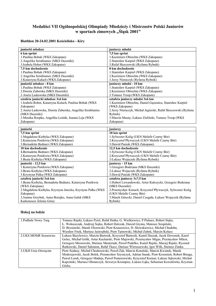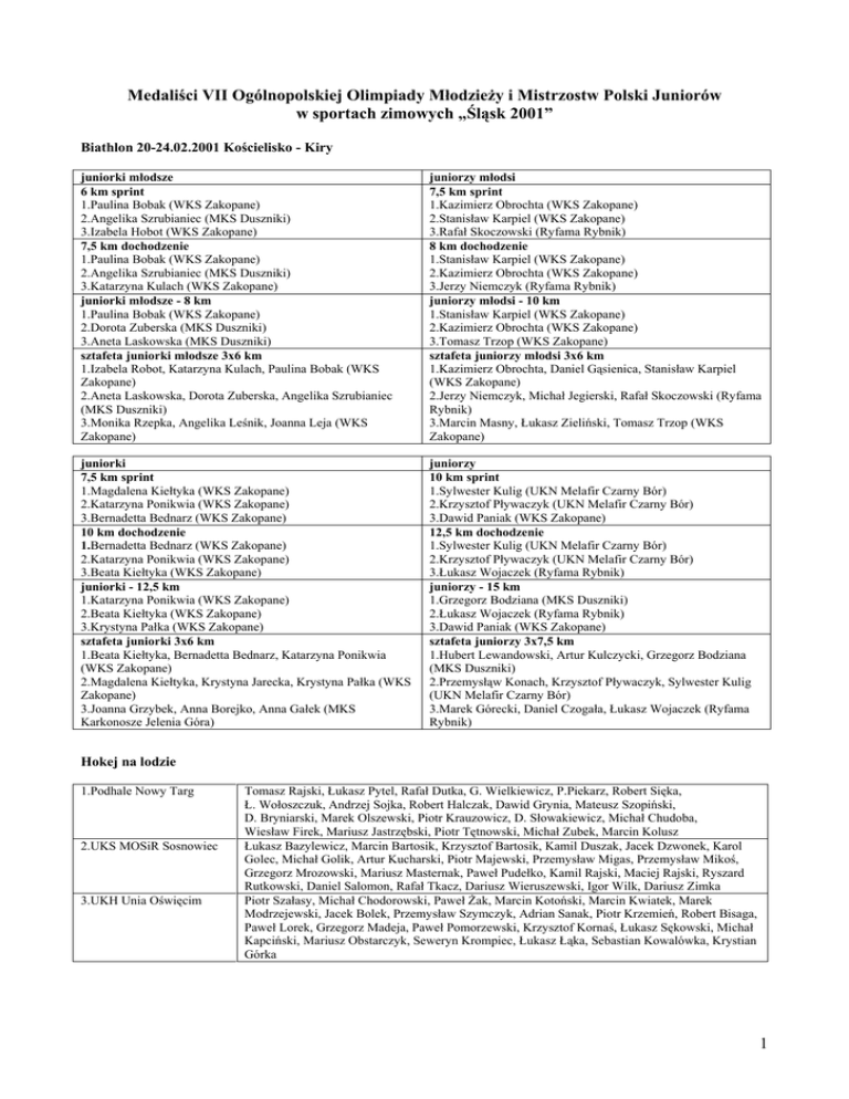 Medaliści VII Ogólnopolskiej Olimpiady Młodzieży i Mistrzostw Polski Juniorów w sportach zimowych „Śląsk 2001” Biathlon 20-24.02.2001 Kościelisko - Kiry juniorki młodsze 6 km sprint 1.Paulina Bobak (WKS Zakopane) 2.Angelika Szrubianiec (MKS Duszniki) 3.Izabela Hobot (WKS Zakopane) 7,5 km dochodzenie 1.Paulina Bobak (WKS Zakopane) 2.Angelika Szrubianiec (MKS Duszniki) 3.Katarzyna Kulach (WKS Zakopane) juniorki młodsze - 8 km 1.Paulina Bobak (WKS Zakopane) 2.Dorota Zuberska (MKS Duszniki) 3.Aneta Laskowska (MKS Duszniki) sztafeta juniorki młodsze 3x6 km 1.Izabela Robot, Katarzyna Kulach, Paulina Bobak (WKS Zakopane) 2.Aneta Laskowska, Dorota Zuberska, Angelika Szrubianiec (MKS Duszniki) 3.Monika Rzepka, Angelika Leśnik, Joanna Leja (WKS Zakopane) juniorzy młodsi 7,5 km sprint 1.Kazimierz Obrochta (WKS Zakopane) 2.Stanisław Karpiel (WKS Zakopane) 3.Rafał Skoczowski (Ryfama Rybnik) 8 km dochodzenie 1.Stanisław Karpiel (WKS Zakopane) 2.Kazimierz Obrochta (WKS Zakopane) 3.Jerzy Niemczyk (Ryfama Rybnik) juniorzy młodsi - 10 km 1.Stanisław Karpiel (WKS Zakopane) 2.Kazimierz Obrochta (WKS Zakopane) 3.Tomasz Trzop (WKS Zakopane) sztafeta juniorzy młodsi 3x6 km 1.Kazimierz Obrochta, Daniel Gąsienica, Stanisław Karpiel (WKS Zakopane) 2.Jerzy Niemczyk, Michał Jegierski, Rafał Skoczowski (Ryfama Rybnik) 3.Marcin Masny, Łukasz Zieliński, Tomasz Trzop (WKS Zakopane) juniorki 7,5 km sprint 1.Magdalena Kiełtyka (WKS Zakopane) 2.Katarzyna Ponikwia (WKS Zakopane) 3.Bernadetta Bednarz (WKS Zakopane) 10 km dochodzenie 1.Bernadetta Bednarz (WKS Zakopane) 2.Katarzyna Ponikwia (WKS Zakopane) 3.Beata Kiełtyka (WKS Zakopane) juniorki - 12,5 km 1.Katarzyna Ponikwia (WKS Zakopane) 2.Beata Kiełtyka (WKS Zakopane) 3.Krystyna Pałka (WKS Zakopane) sztafeta juniorki 3x6 km 1.Beata Kiełtyka, Bernadetta Bednarz, Katarzyna Ponikwia (WKS Zakopane) 2.Magdalena Kiełtyka, Krystyna Jarecka, Krystyna Pałka (WKS Zakopane) 3.Joanna Grzybek, Anna Borejko, Anna Gałek (MKS Karkonosze Jelenia Góra) juniorzy 10 km sprint 1.Sylwester Kulig (UKN Melafir Czarny Bór) 2.Krzysztof Pływaczyk (UKN Melafir Czarny Bór) 3.Dawid Paniak (WKS Zakopane) 12,5 km dochodzenie 1.Sylwester Kulig (UKN Melafir Czarny Bór) 2.Krzysztof Pływaczyk (UKN Melafir Czarny Bór) 3.Łukasz Wojaczek (Ryfama Rybnik) juniorzy - 15 km 1.Grzegorz Bodziana (MKS Duszniki) 2.Łukasz Wojaczek (Ryfama Rybnik) 3.Dawid Paniak (WKS Zakopane) sztafeta juniorzy 3x7,5 km 1.Hubert Lewandowski, Artur Kulczycki, Grzegorz Bodziana (MKS Duszniki) 2.Przemysłąw Konach, Krzysztof Pływaczyk, Sylwester Kulig (UKN Melafir Czarny Bór) 3.Marek Górecki, Daniel Czogała, Łukasz Wojaczek (Ryfama Rybnik) Hokej na lodzie 1.Podhale Nowy Targ 2.UKS MOSiR Sosnowiec 3.UKH Unia Oświęcim Tomasz Rajski, Łukasz Pytel, Rafał Dutka, G. Wielkiewicz, P.Piekarz, Robert Sięka, Ł. Wołoszczuk, Andrzej Sojka, Robert Halczak, Dawid Grynia, Mateusz Szopiński, D. Bryniarski, Marek Olszewski, Piotr Krauzowicz, D. Słowakiewicz, Michał Chudoba, Wiesław Firek, Mariusz Jastrzębski, Piotr Tętnowski, Michał Zubek, Marcin Kolusz Łukasz Bazylewicz, Marcin Bartosik, Krzysztof Bartosik, Kamil Duszak, Jacek Dzwonek, Karol Golec, Michał Golik, Artur Kucharski, Piotr Majewski, Przemysław Migas, Przemysław Mikoś, Grzegorz Mrozowski, Mariusz Masternak, Paweł Pudełko, Kamil Rajski, Maciej Rajski, Ryszard Rutkowski, Daniel Salomon, Rafał Tkacz, Dariusz Wieruszewski, Igor Wilk, Dariusz Zimka Piotr Szałasy, Michał Chodorowski, Paweł Żak, Marcin Kotoński, Marcin Kwiatek, Marek Modrzejewski, Jacek Bolek, Przemysław Szymczyk, Adrian Sanak, Piotr Krzemień, Robert Bisaga, Paweł Lorek, Grzegorz Madeja, Paweł Pomorzewski, Krzysztof Kornaś, Łukasz Sękowski, Michał Kapciński, Mariusz Obstarczyk, Seweryn Krompiec, Łukasz Łąka, Sebastian Kowalówka, Krystian Górka 1 Łyżwiarstwo figurowe 16-19.02.2001 Katowice solistki – klasa złota 1.Anna Zawada (KŁF Olimpijczyk Oświęcim) 2.Dorota Pieńkos (KŁF Olimpijczyk Oświęcim) 3.Karolina Bulak (Marymont Warszawa) soliści - klasa złota 1.Mateusz Chruściński (KŁF Olimpijczyk Oświęcim) 2.Krystian Tera (ŁTŁF Łodź) 3.Łukasz Chluba (KŁF Olimpijczyk Oświęcim) pary sportowe - klasa złota === solistki – klasa srebrna 1.Marta Misiewicz (UKŁ Katowice) 2.Lidia Osińska (Marymont Warszawa) 3.Joanna Sulej (Marymont Warszawa) soliści - klasa srebrna 1.Janusz Karweta (KŁF Olimpijczyk Oświęcim) 2.Maciej Cieplucha (ŁTŁF Łodź) 3.Tomasz Grajcar (OMKŁ Opole) pary taneczne - klasa złota 1.Patrycja Petrus, Łukasz Dzióbek (Stoczniowiec Gdańsk) 2.Justyna Potocka, Łukasz Pejka (Stoczniowiec Gdańsk) 3.Joanna Krysztofiak, Bartłomiej Witczak (MKŁ Łódź) pary taneczne - klasa srebrna === Łyżwiarstwo szybkie 9-11.02.2001 Tomaszów Mazowiecki juniorki 500 m 1.Aleksandra Przeor (Orzeł Elbląg) 2.Ewelina Szkutnik (Cuprum Lubin) 3.Marta Szymczak (Pilica Tomaszów) 1000 m 1.Joanna Łęcka (Marymont Warszawa) 2.Aleksandra Przeor (Orzeł Elbląg) 3.Joanna Grabowska (WTŁ Stegny Warszawa) 1500 m 1.Joanna Łęcka (Marymont Warszawa) 2.Aleksandra Przeor (Orzeł Elbląg) 3.Małgorzata Bylinka (Pilica Tomaszów) 3000 m 1.Joanna Łęcka (Marymont Warszawa) 2.Małgorzata Bylinka (Pilica Tomaszów) 3.Agata Skarabucha (Marymont Warszawa) wielobój 1.Joanna Łęcka (Marymont Warszawa) 2.Ewelina Szkutnik (Cuprum Lubin) 3.Małgorzata Bylinka (Pilica Tomaszów) drużyna 1.Joanna Łęcka, Agata Skarabucha, Paulina Matuszewska (Marymont Warszawa) 2.Marta Szymczak, Małgorzata Bylinka, Kamila Grabowska (Pilica Tomaszów) 3.Katarzyna Kowalczyk, Ewelina Szkutnik, Marta Skowron (Cuprum Lubin) juniorzy 500 m 1.Maciej Ustynowicz (Marymont Warszawa) 2.Marek Bartosiewicz (Cuprum Lubin) 3.Łukasz Budz (Białka) 1500 m 1.Tomasz Tarnawski (Zryw Sanok) 2.Przemysław Przybysz (Zryw Sanok) 3.Maciej Ustynowicz (Marymont Warszawa) 3000 m 1.Tomasz Tarnawski (Zryw Sanok) 2.Arkadiusz Perzyński (MKS-MOS Pruszków) 3.Jakub Niedźwiedzki (SNPTT Za
