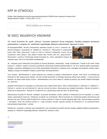 KPP W OTWOCKU Źródło: http://kppotwock.policja.waw.pl/po/aktualnosci/11384,W-sieci-wlasnych-knowan.html Wygenerowano: Piątek, 3 marca 2017, 11:11 Strona znajduje się w archiwum. W SIECI WŁASNYCH KNOWAŃ 16 –letni Krystian M. padł „ofiarą” knowań żądnych forsy kolegów. Szybko podjęte działania policjantów z zespołu ds. nieletnich zapobiegły dalszym zdarzeniom. Sprawa w toku. W listopadzie2009r. 16-letni mieszkaniec Józefowa Łukasz O. wraz z czterema 16 – letnimi kolegami Krystianem R., Rafałem K., Piotrem K. i Mariuszem P. postanowili kupić fiata 126p. Wyszukali i kupili za 150 zł. Czterech chłopaków rzuciło się po trzydzieści kilka złotych. Aby jeździł trzeba było trochę nad nim „popracować”. Skorzystali z pomocy 16-letniego kolegi Krystiana M., który udostępnił miejsce do naprawy auta i sam w to się bardzo zaangażował. 16 – latkowie przez kilkanaście dni jeździli po terenie Józefowa „doskonaląc” swoje umiejętności. Trwało to do chwili, kiedy Łukasz O. i Rafał K. wpadli na pomysł sprzedania samochodu koledze Bartłomiejowi P. za 70 zł. Jednak dwóm pozostałym kolegom, uprzednio składającym się na fiata opowiedzieli historyjkę o kradzieży auta. Pieniądze zaś podzielili miedzy siebie. Będący niczego nie świadomi chłopcy szukali fiata, ale bezskutecznie. Tym czasem , Bartłomiejowi P. autko popsuło się i utknęło na jednej z józefowskich uliczek. Traf chciał, że odnalazł go Krystian M. Był rozgoryczony faktem, że ktoś ukradł samochód ,w którego reperację włożył tyle wysiłku , a teraz porzucił zepsute. Ze złości wybił szyby w fiacie. Dowiedziawszy się o tym Łukasz O. wpadł na pomysł ,jak zarobić kolejne pieniądze na „maluchu”. Zażądał od Krystiana M. pieniędzy za zniszczenia auta. Padła kwota 500 zł. Wraz z Bartłomiejem P. Adrianem P., Rafałem K. i Piotrem K. zaczaili się na Krystiana M., gdy ten wracał do domu. Otoczywszy go zażądali pieniędzy. Zaczęli od gróźb, a skończyli na popychaniu. Krystian M. przewrócił się, a popchnięcie było tak silne, że złamał rękę. Wystraszony Krystian M. obiecał „kolegom” przynieść pieniądze z domu. Jednak z mieszkania już nie wyszedł, a o całym zajściu opowiedział rodzicom. Chłopców to jednak nie zniechęciło. Matce Krystiana M. przekazali groźby skierowane pod adresem jej syna. Wizyta matki Krystiana M. w domu Łukasza O. tylko na chwilę ostudziła jego chęć „nieuczciwego wyrwania ” pieniędzy. Kilka dni później Łukasz O. i jego kompani zaczęli wysyłać groźby do Krystiana M. za pośrednictwem komunikatora Gadu-Gadu i smsów. Państwo M. w obawie o zdrowie syna powiadomili o tej niecodziennej historii policję. Szybko podjęte działania policjantów z zespołu ds. nieletnich zapobiegły dalszym zdarzeniom. Sprawa w toku. aw Ocena: 0/5 (0) Tweetnij